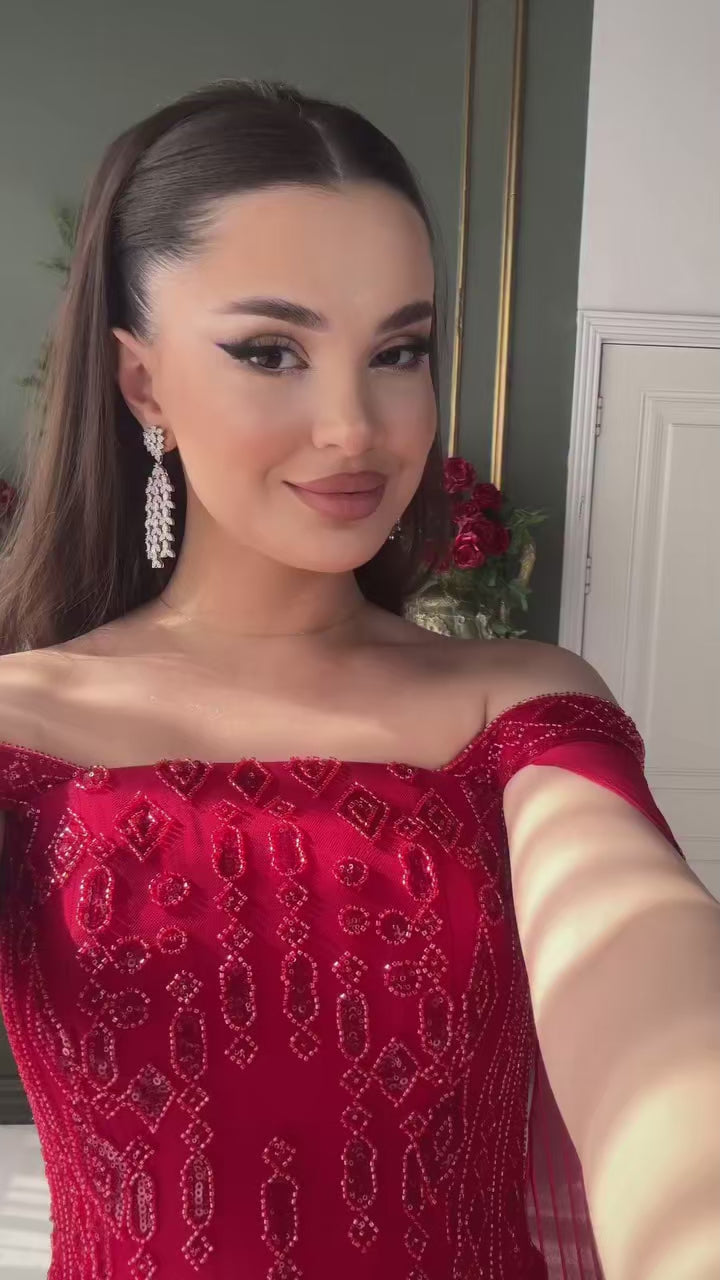 This exquisite wine red evening dress features a meticulously beaded corset that enhances silhouette definition and adds refined elegance. The flowing cape sleeves offer graceful movement and a dramatic touch, perfect for formal occasions. Crafted to combine structure with fluidity, this dress balances sophisticated detail and comfort for a standout presence at any event.