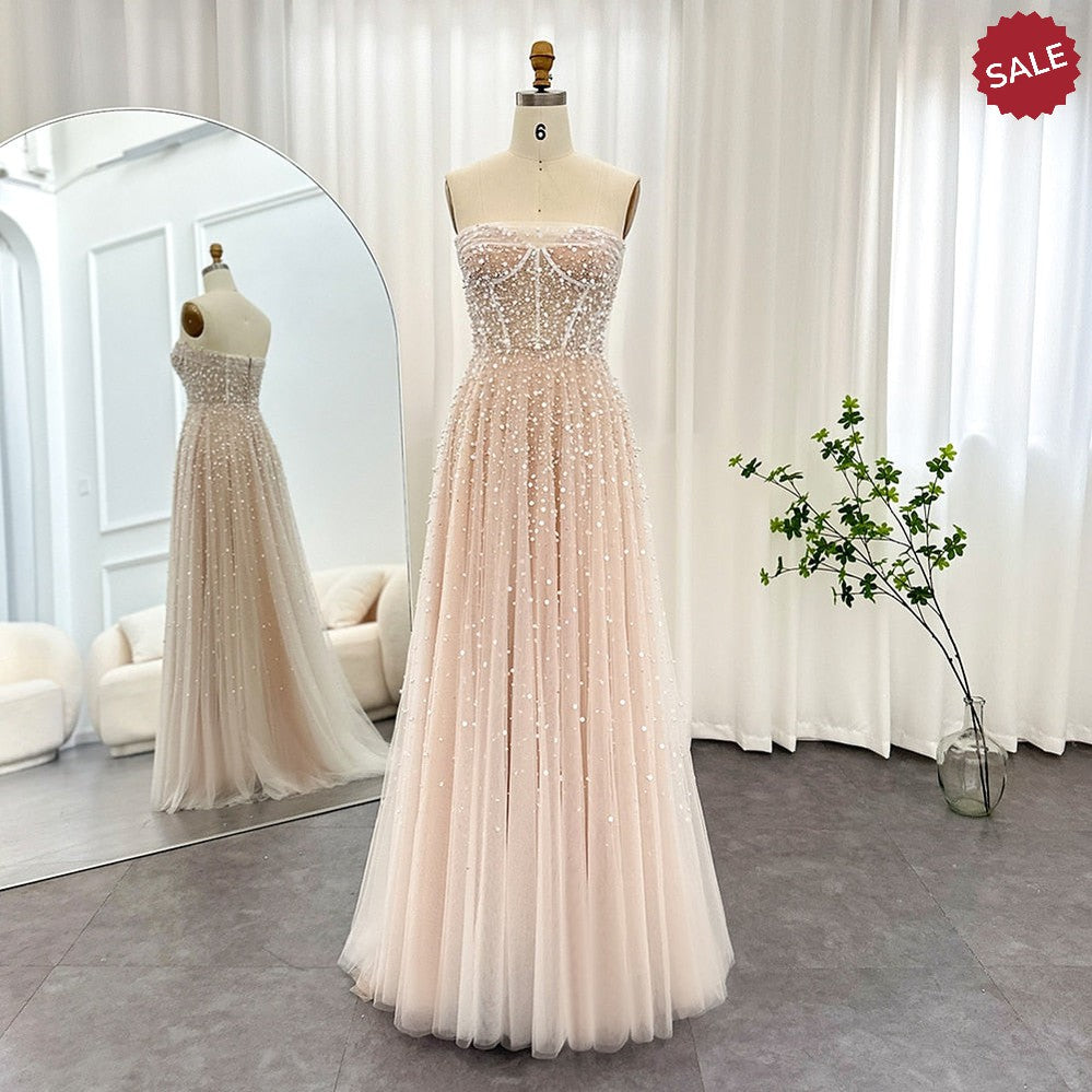 Pearls White Nude Arabic Evening Dresses with Gloves SS373