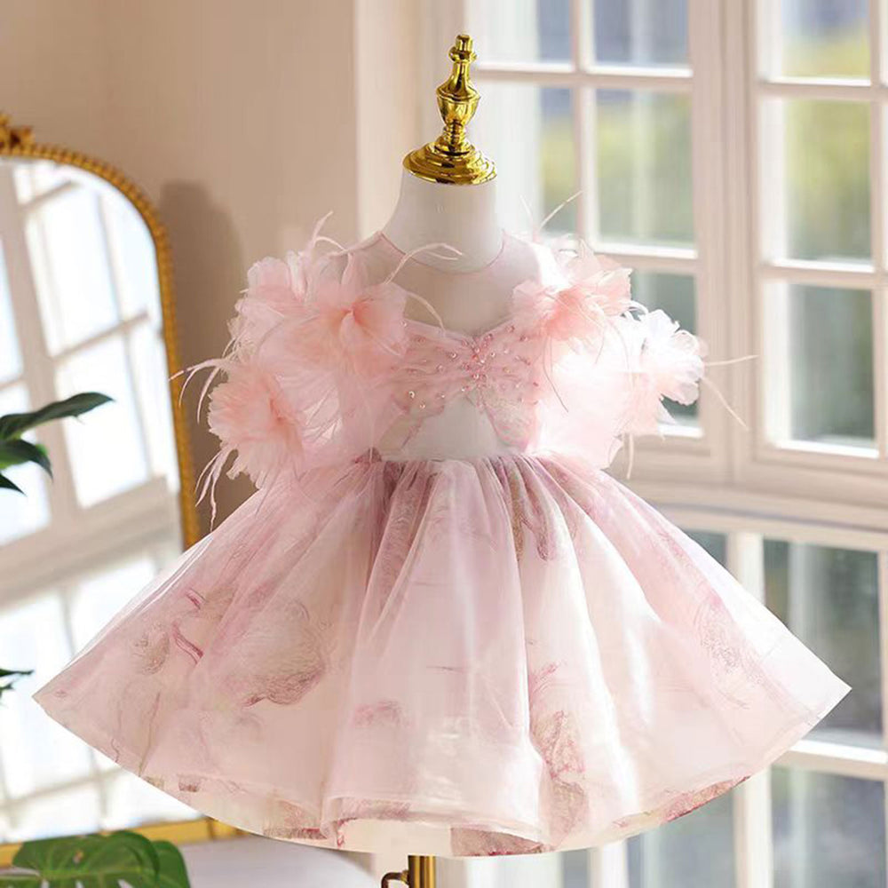 Charming Pink Flower Girl Dress Applique Feather Keen Length J564