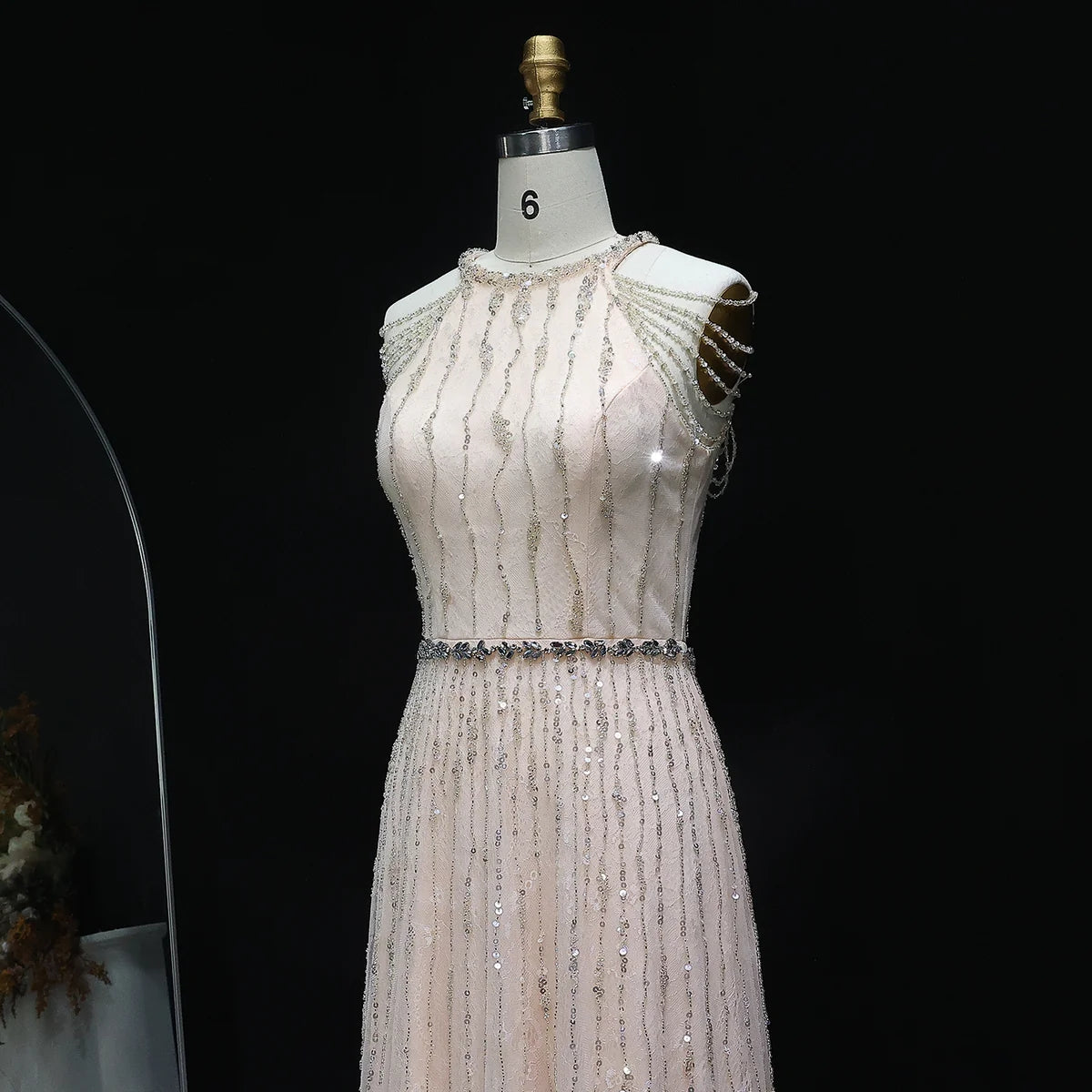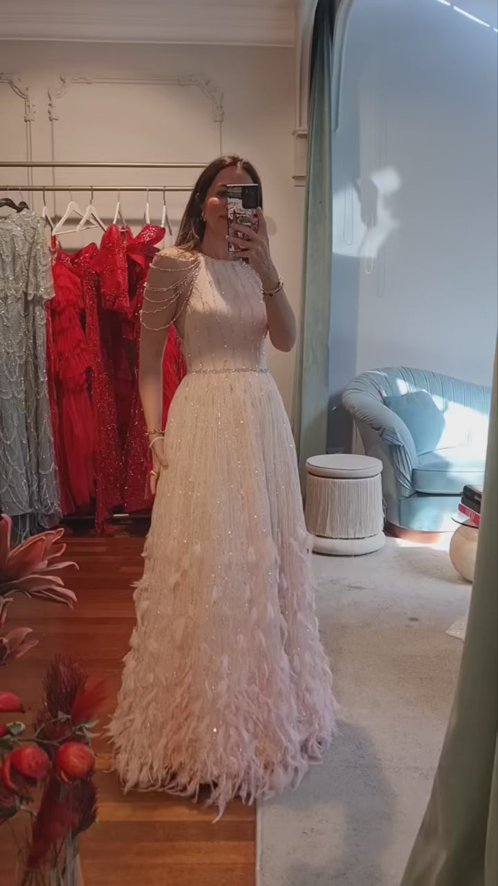 Indulge in luxury and elegance with our Lace Cream Evening Dress. Featuring delicate feathers and intricate lace, this dress exudes sophistication and charm. Perfect for any special occasion, this dress will make you feel like a true fashion icon. Elevate your style and make a statement with our SS595 dress.