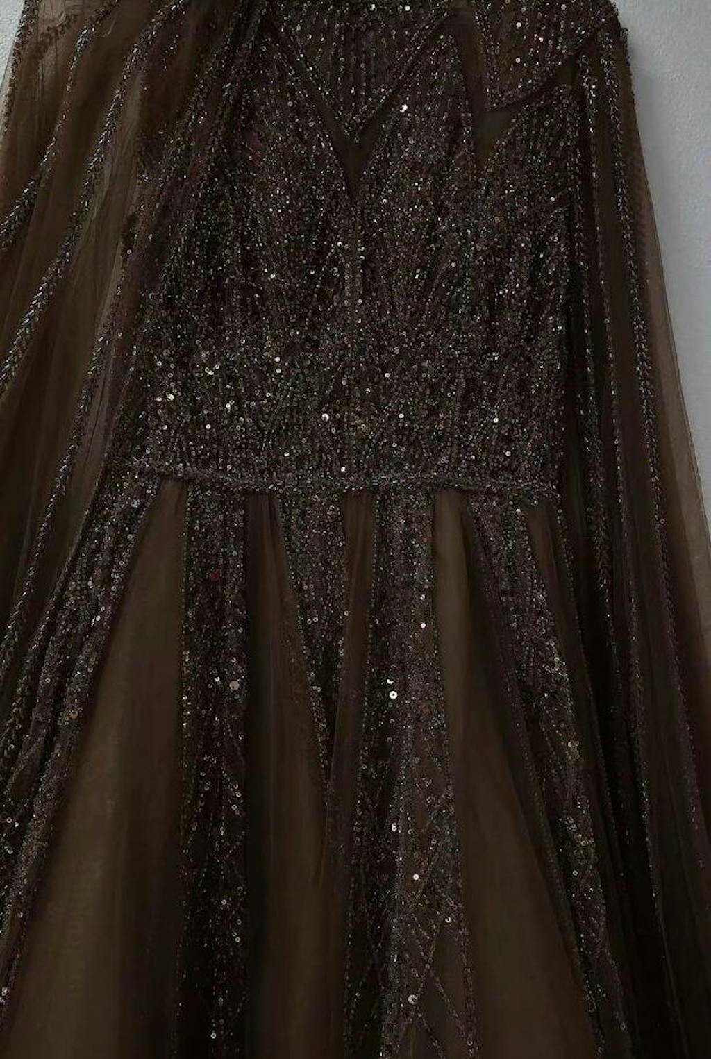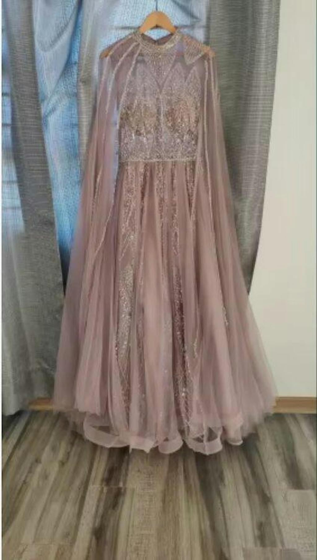Indulge in luxury with our Dubai Pink Arabic Evening Dress. Adorned with cape sleeves and a brown Muslim-inspired design, this dress exudes elegance and sophistication. Perfect for special events or a night out, this dress guarantees to make you stand out in style. Experience luxury with our SS050 dress.