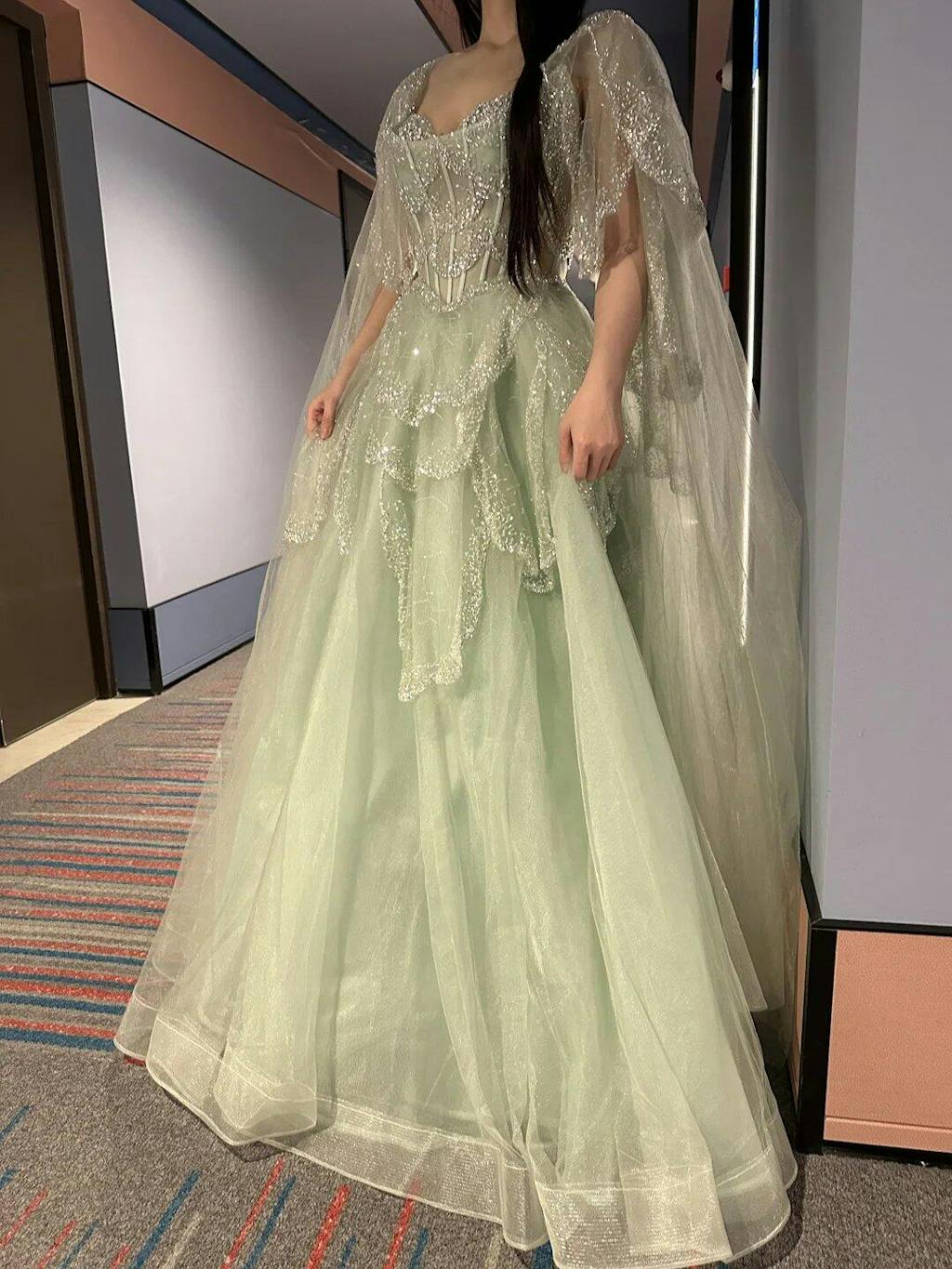 Experience elegance and sophistication in our Elegant Off Shoulder Sage Green Evening Dress. The dress, featuring graceful cape sleeves, exudes timeless style and complements your figure. The sage green color adds a touch of freshness to the overall look. Perfect for formal occasions and events.