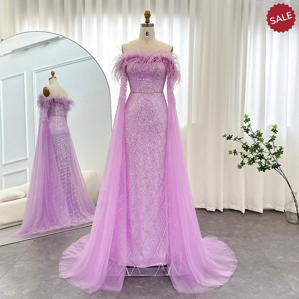 فساتين سهرة فاخرة من Dreamy Vow دبي ليلك ريش بأكمام كيب 2024 فستان عربي طويل للنساء لحفلات الزفاف والحفلات الراقصة SS196