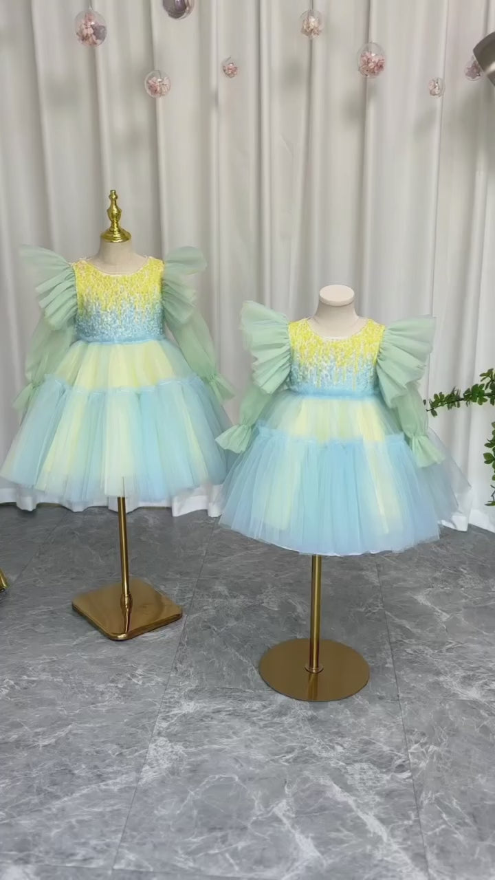 Sequins Princess Yellow Girl Dress Knee Length Puffy Sleeve J258