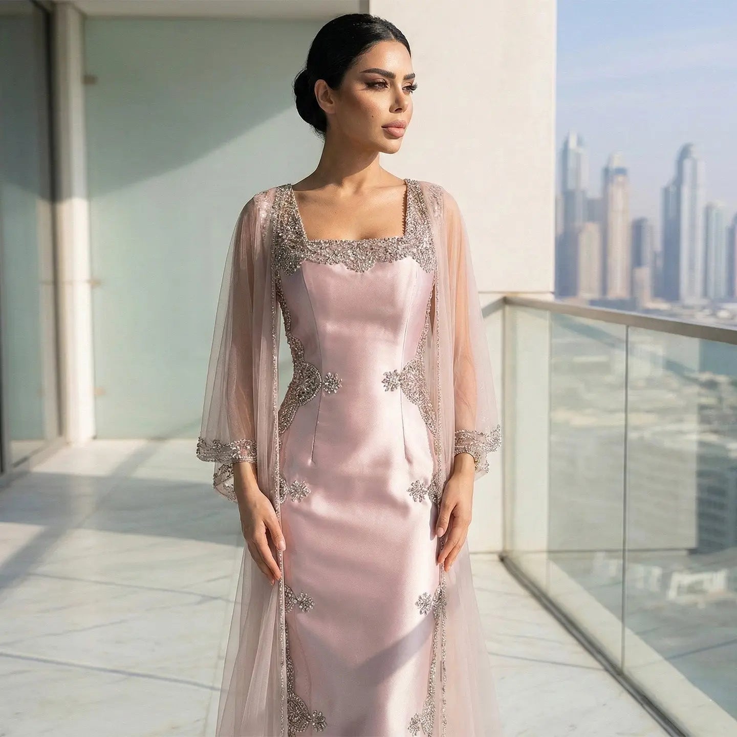 Stunning pink evening gown featuring an elegant square neckline and intricate crystal beading throughout. The sophisticated design combines timeless elegance with modern glamour, perfect for formal events, galas, and special occasions. The shimmering crystal embellishments catch the light beautifully, creating a radiant, eye-catching look. Crafted for comfort and confidence, this gown drapes gracefully to enhance your silhouette. An ideal choice for anyone seeking a show-stopping formal dress that balances classic refinement with contemporary style.