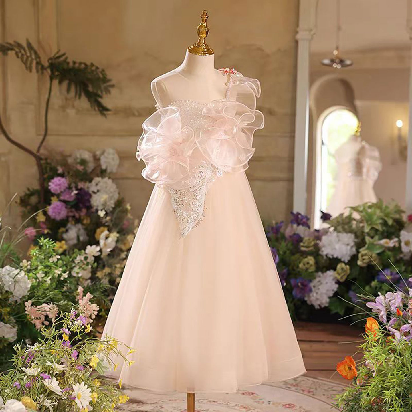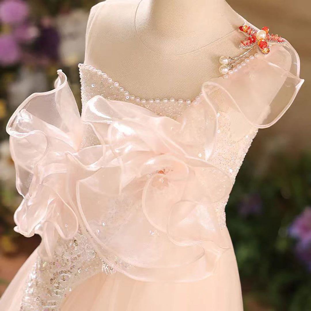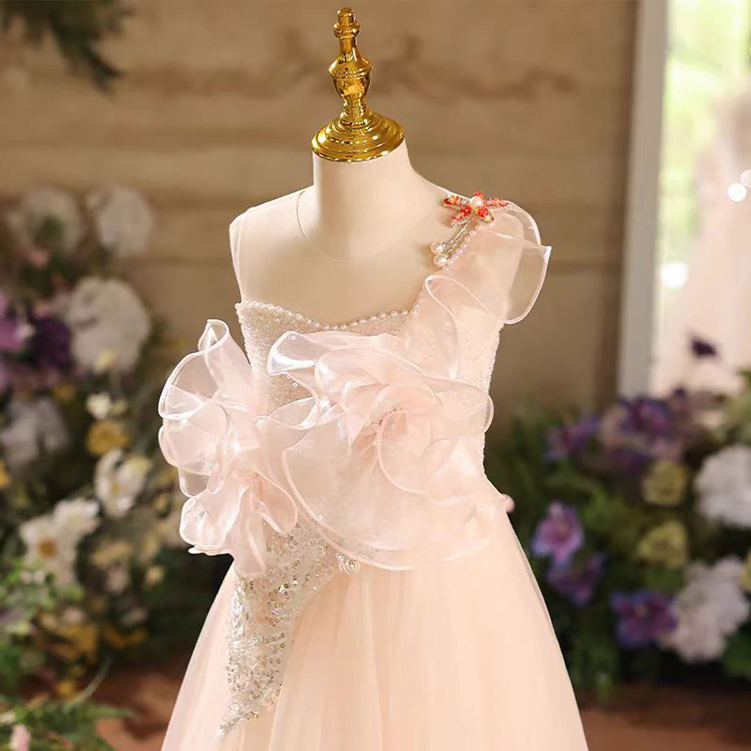A-Line One Shoulder Tulle Flower Girl Dress Sleeveless D038