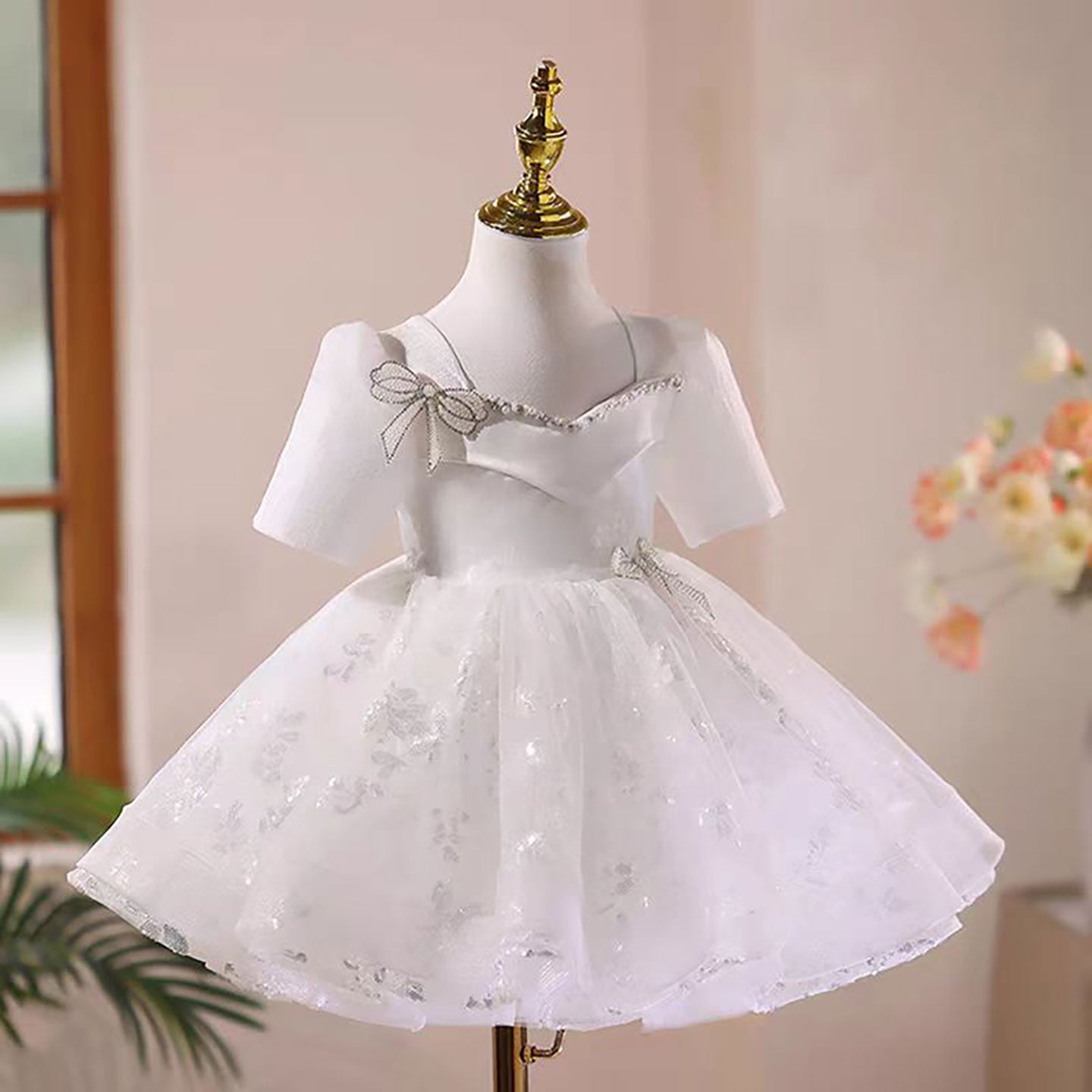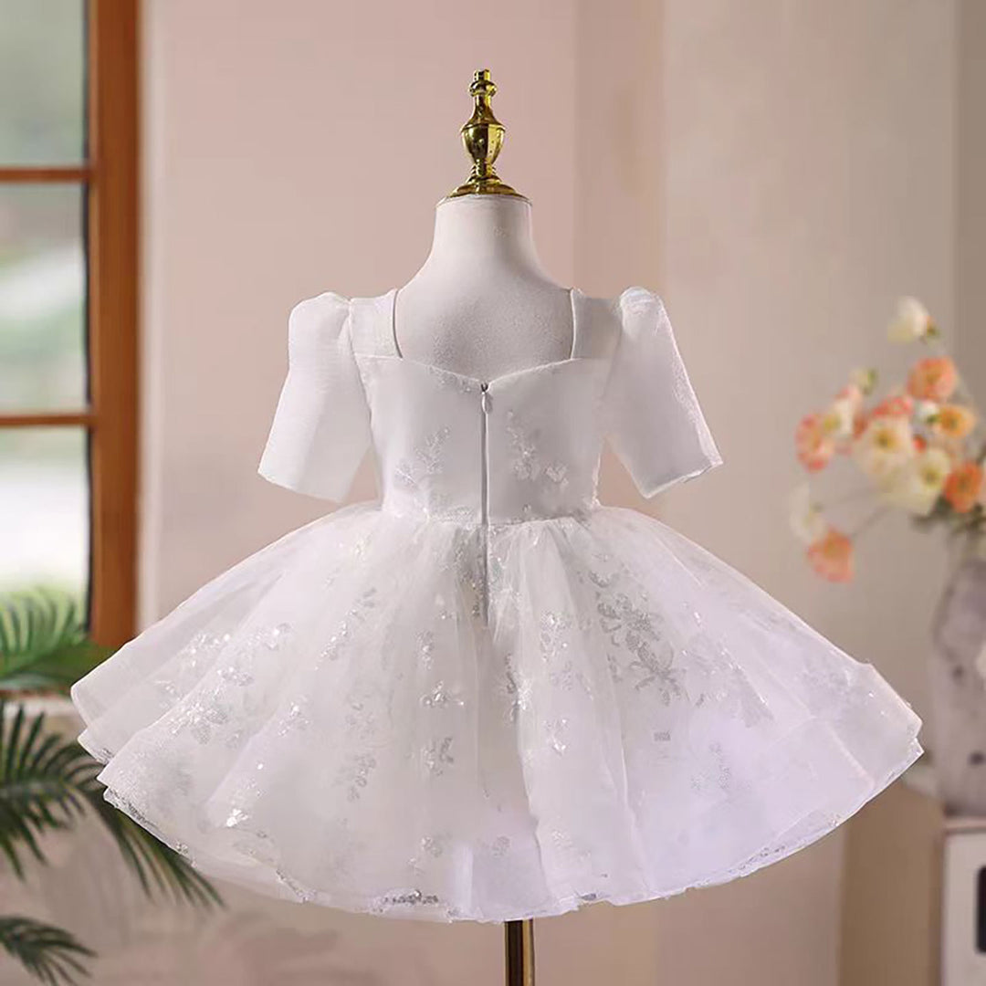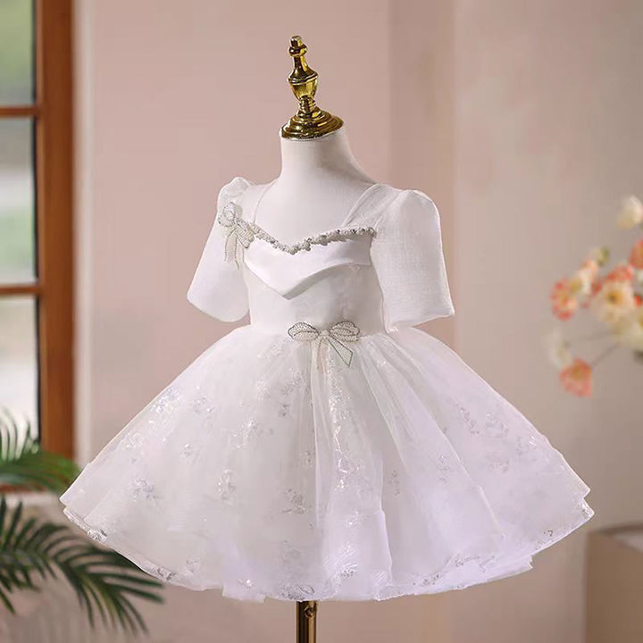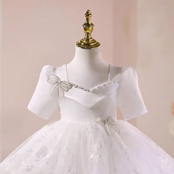 Beading Bow Decoration Flower Girl Dress Short Sleeves D046