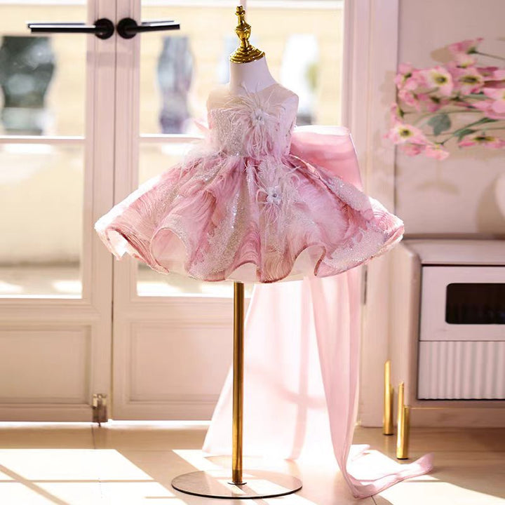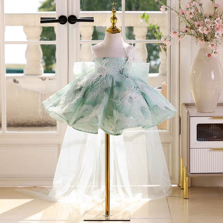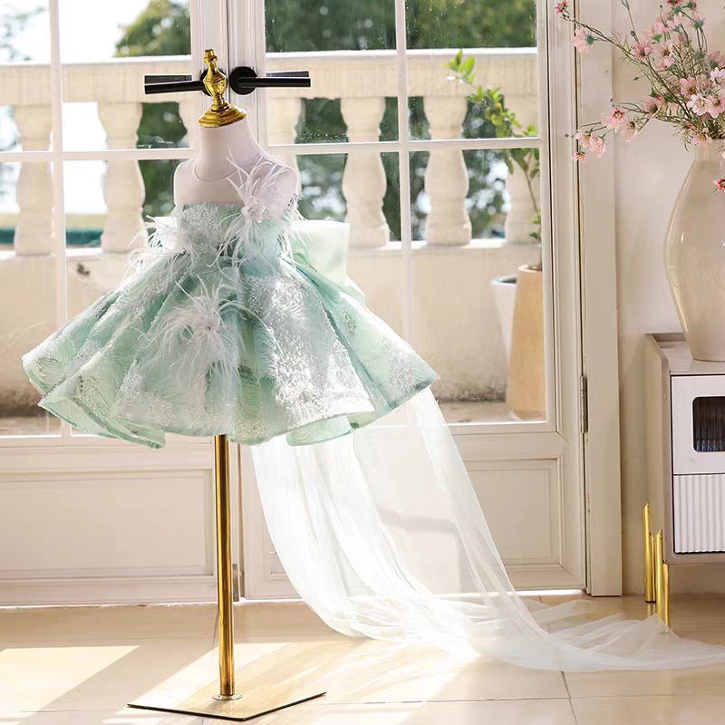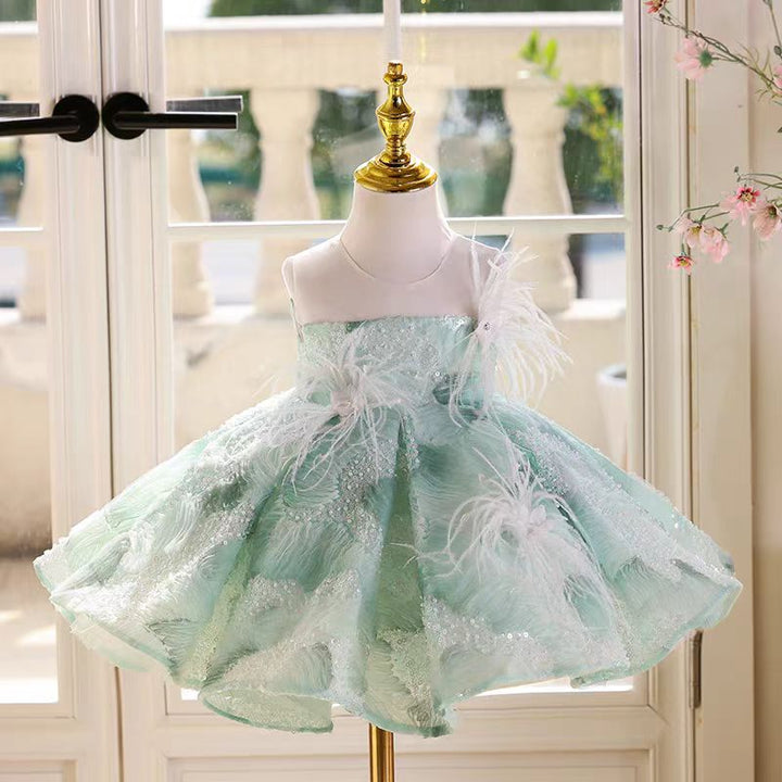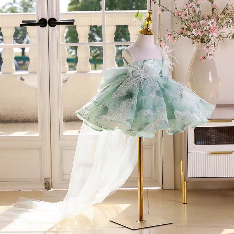 Indulge in a dreamy and luxurious look with our Sleeveless Fur Sequined Flower Girl Dress. This stunning dress features delicate sequins and soft fur, adding a touch of whimsy and elegance. Complete with a graceful tailing design, your little one will feel like a princess in this teal dress. Perfect for special occasions and making cherished memories.