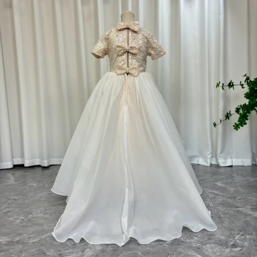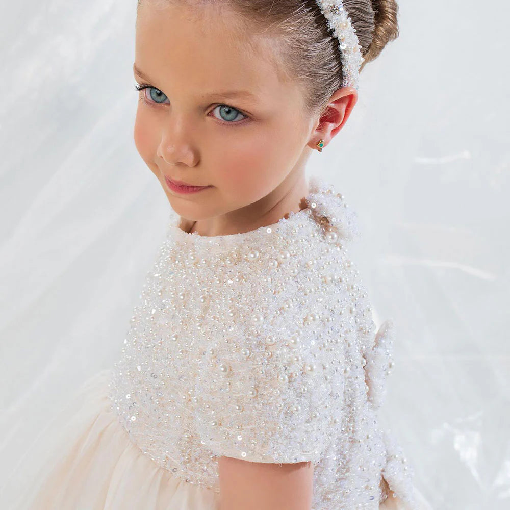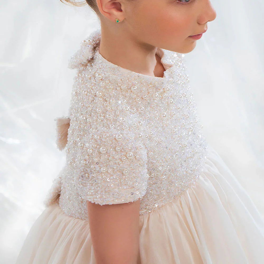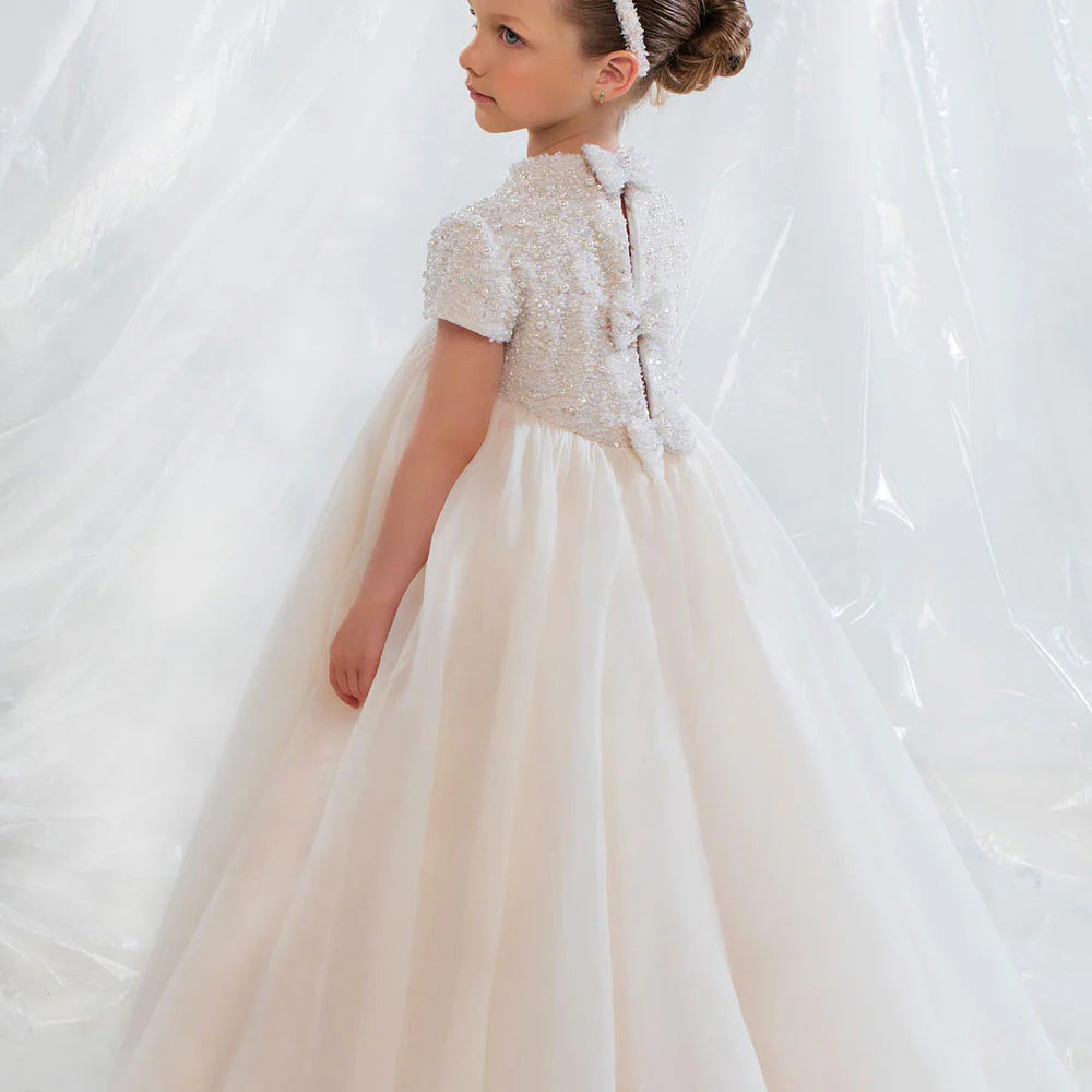This elegant ivory dress is the perfect choice for your little one's special occasions. With delicate bead and pearl details and a princess-style cut, this Dubai-inspired dress will make your child feel like royalty. Ideal for weddings, birthdays, and first communions, it exudes elegance and grace. Don't miss out on the Dreamy Vow 2024 J053 dress for an unforgettable celebration.