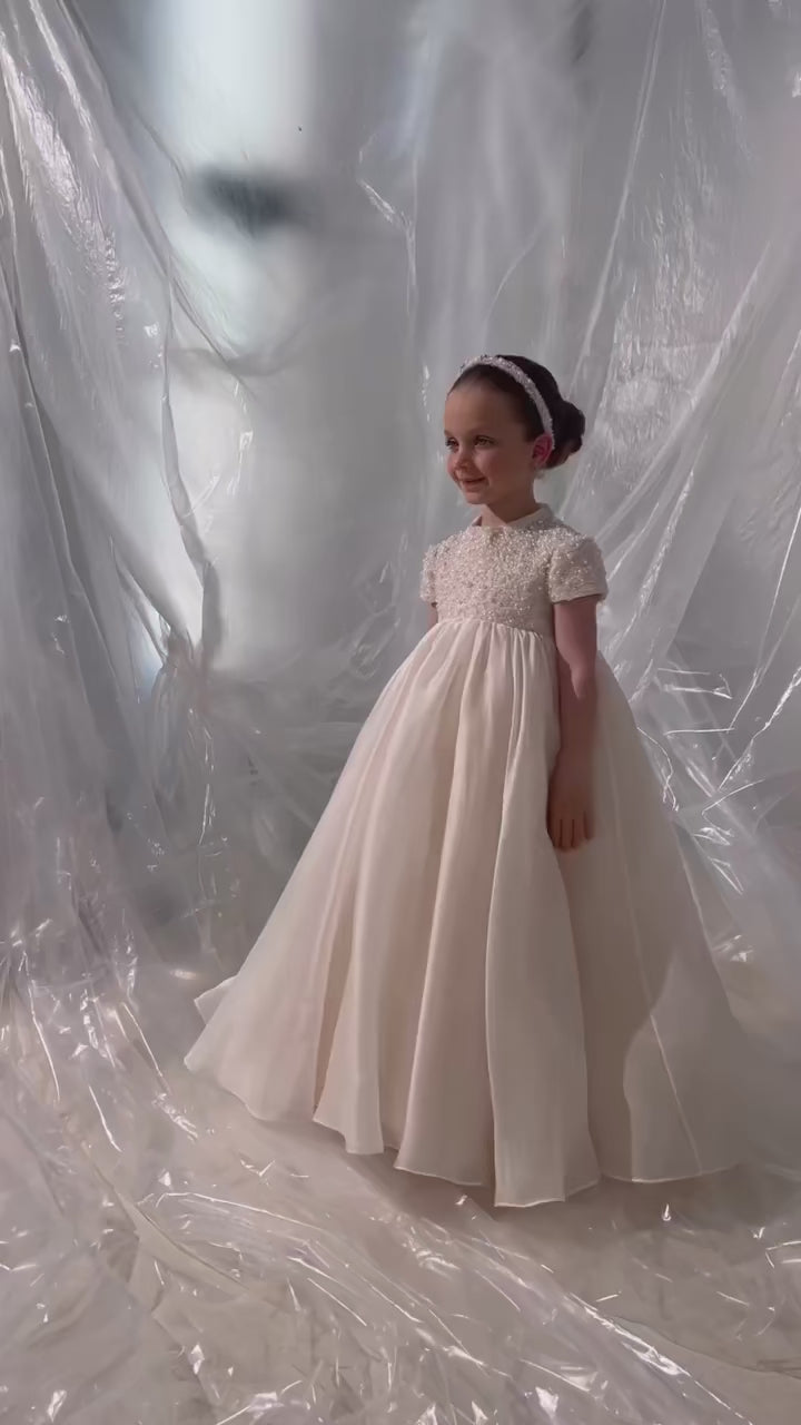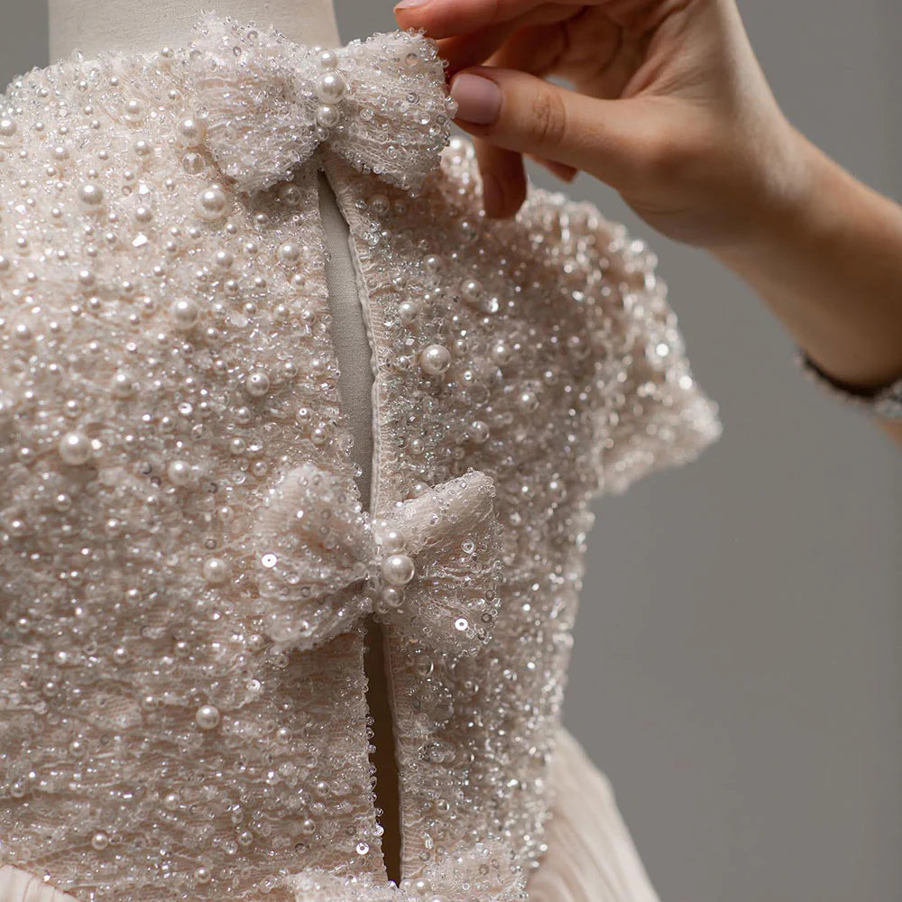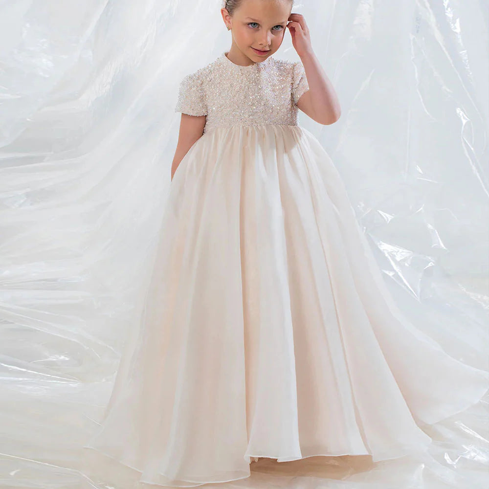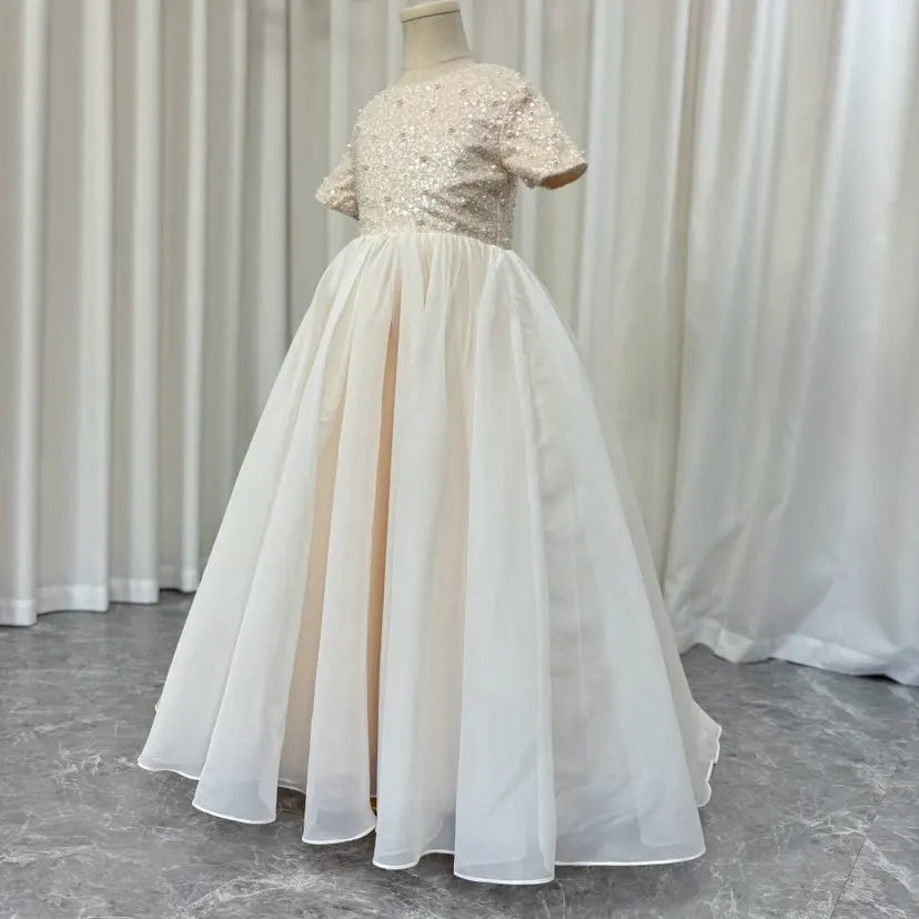 This elegant ivory dress is the perfect choice for your little one's special occasions. With delicate bead and pearl details and a princess-style cut, this Dubai-inspired dress will make your child feel like royalty. Ideal for weddings, birthdays, and first communions, it exudes elegance and grace. Don't miss out on the Dreamy Vow 2024 J053 dress for an unforgettable celebration.