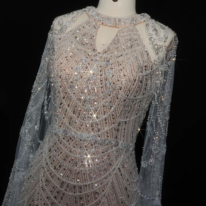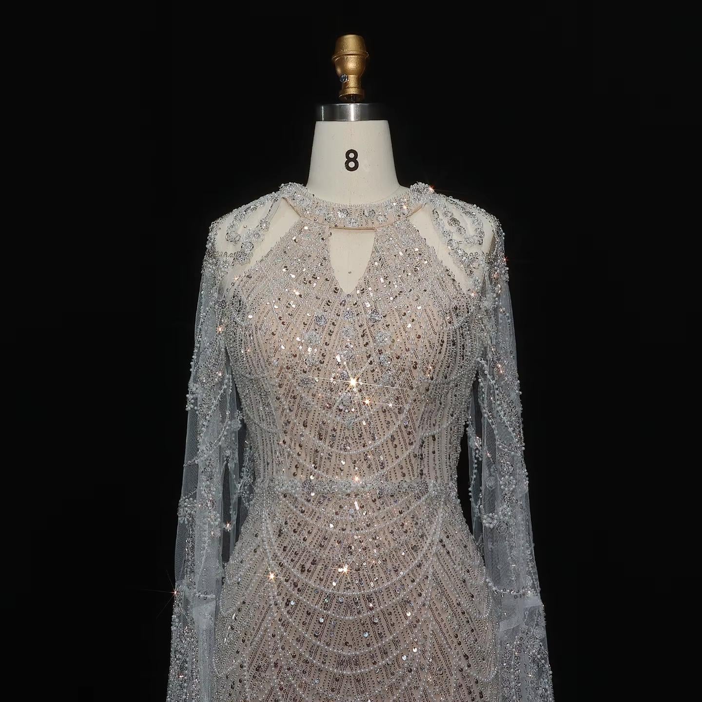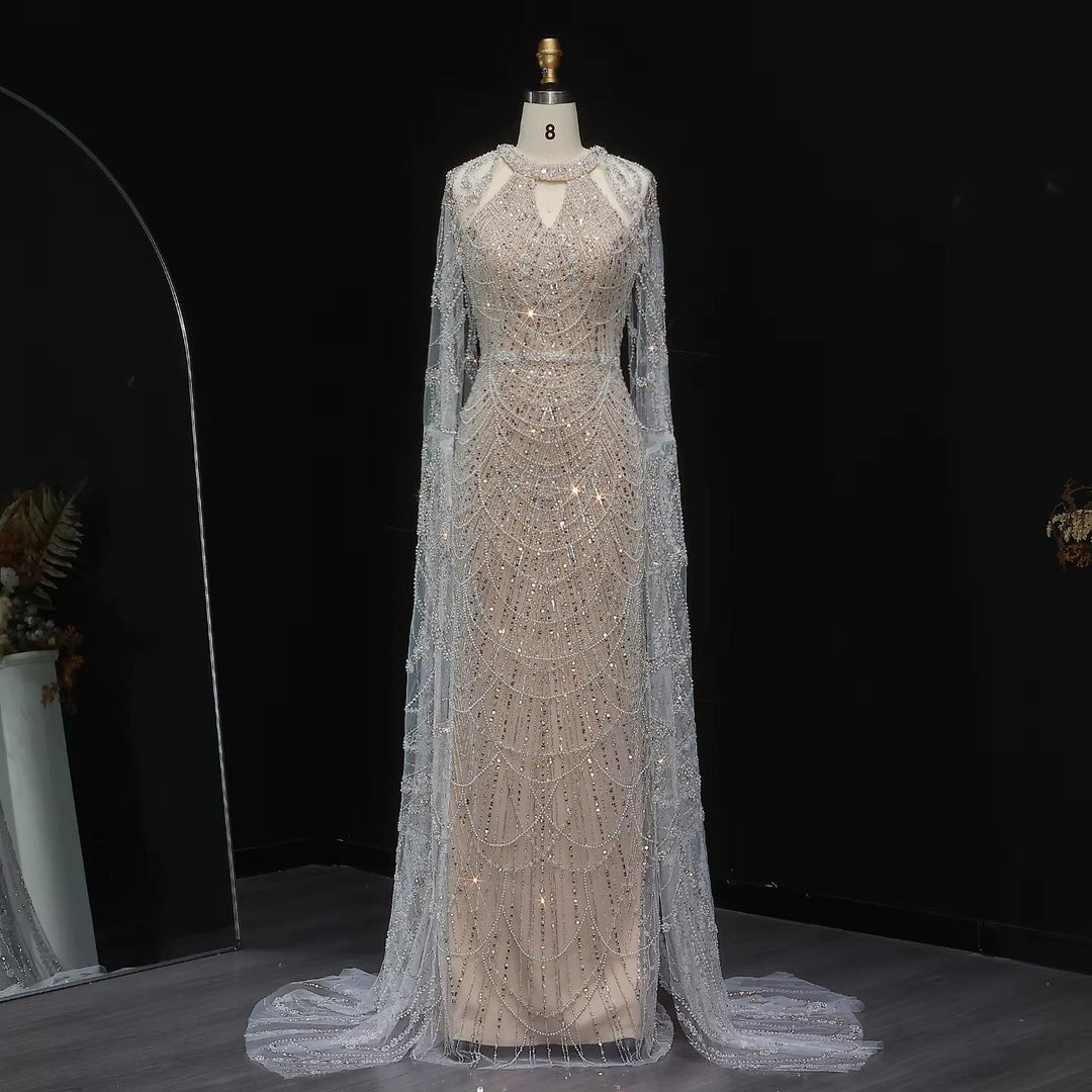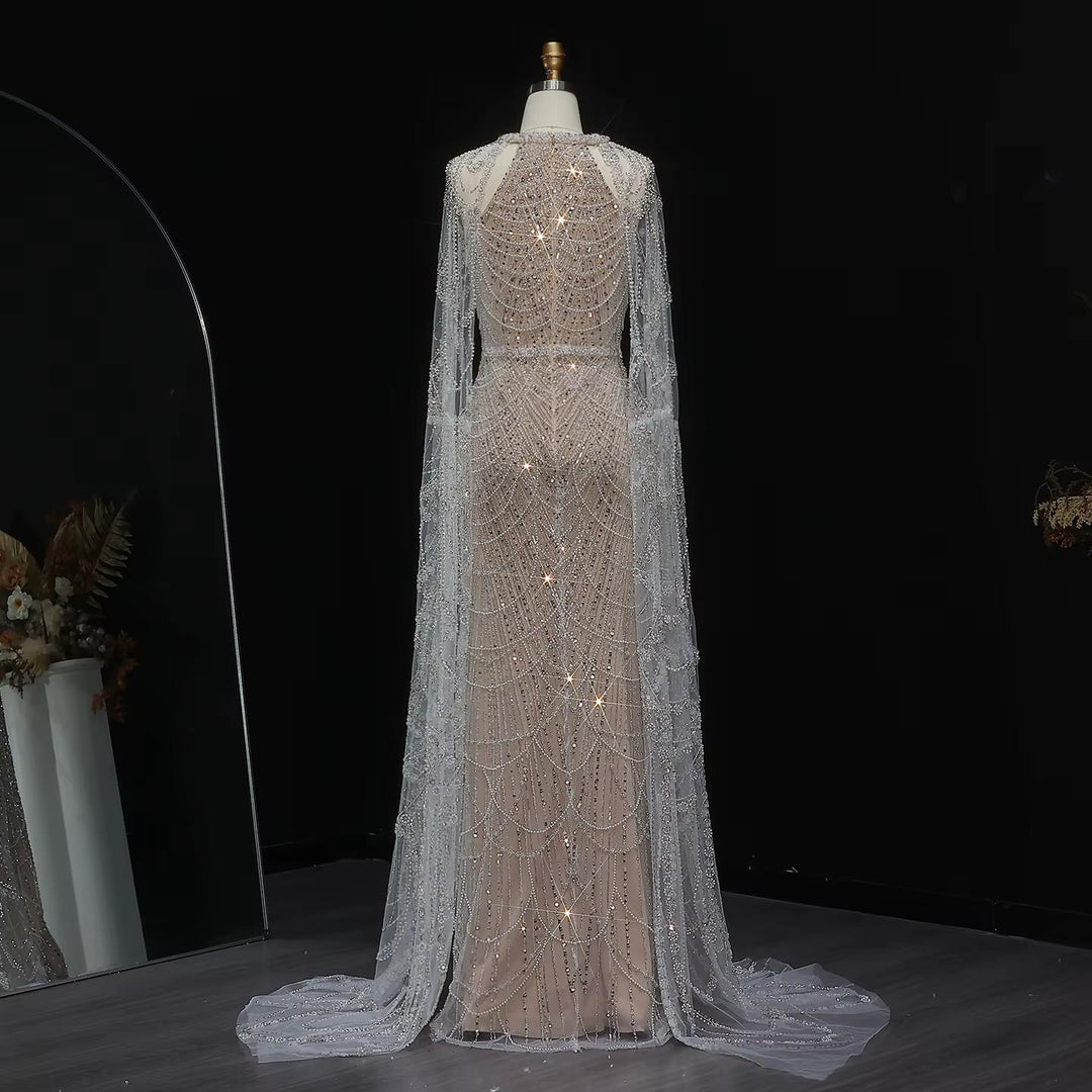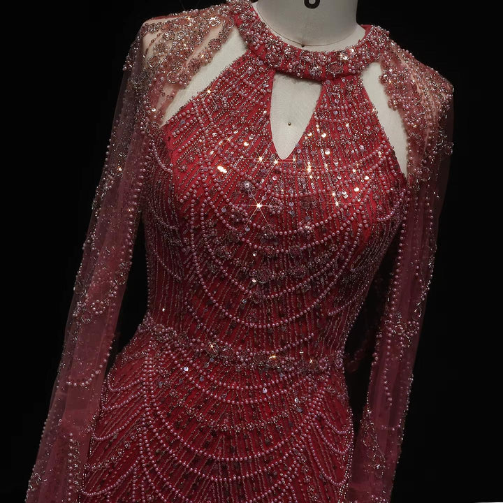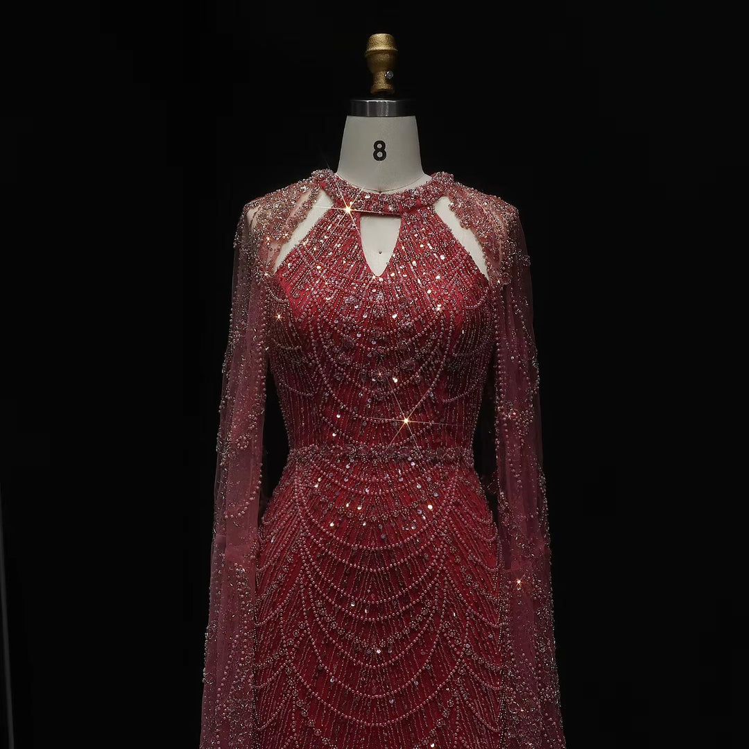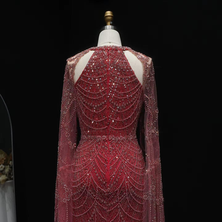 This elegant burgundy evening gown with cape SS669is the perfect addition to your wardrobe. With its stunning design and high-quality materials, it exudes sophistication and grace. The cape adds a touch of glamour to the overall look, making you stand out at any event. Elevate your style with this timeless piece.