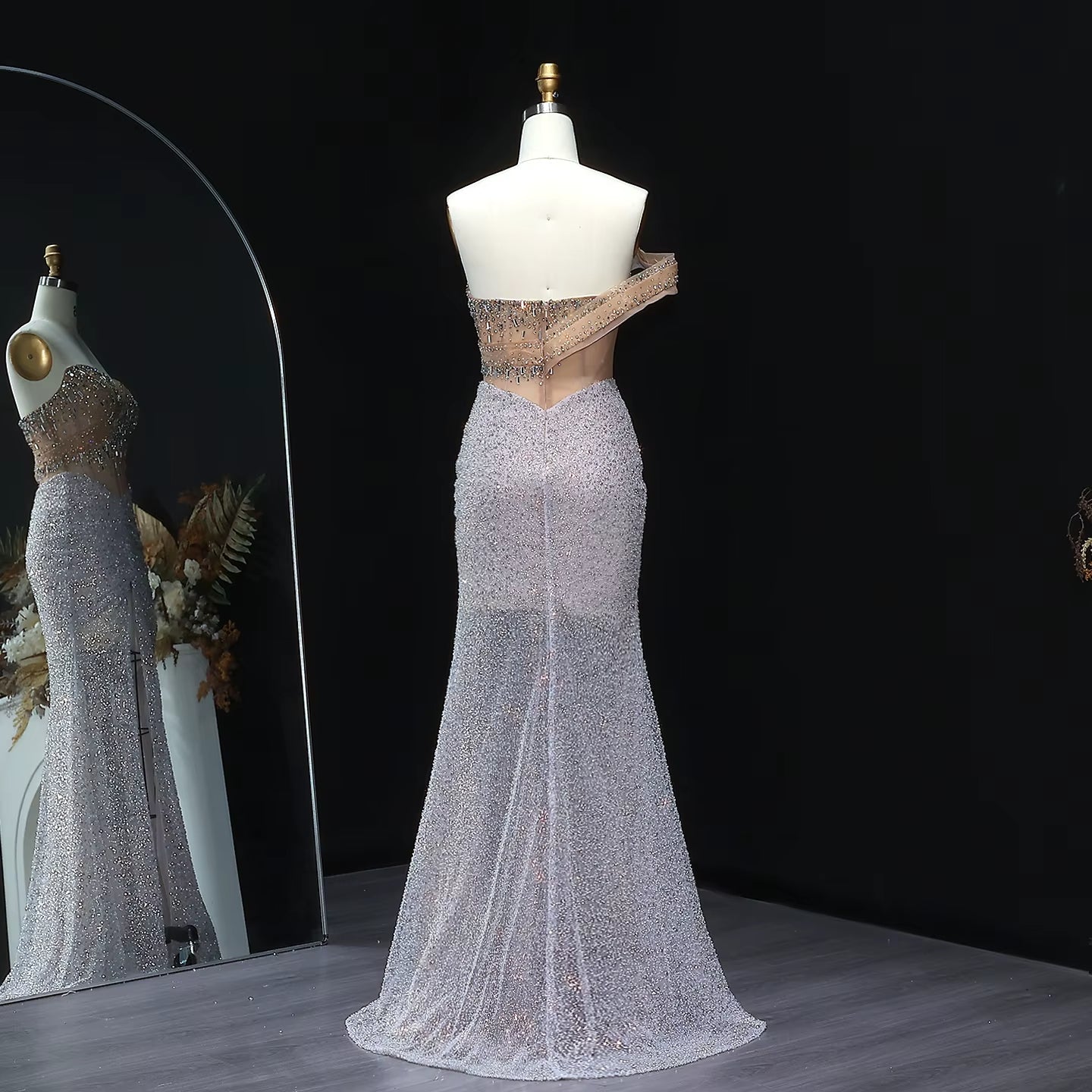 Elegant Silver Crystal Beaded Evening Dress with High Slit SS563