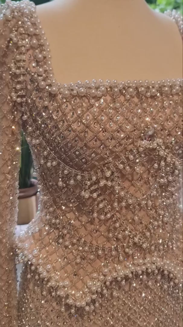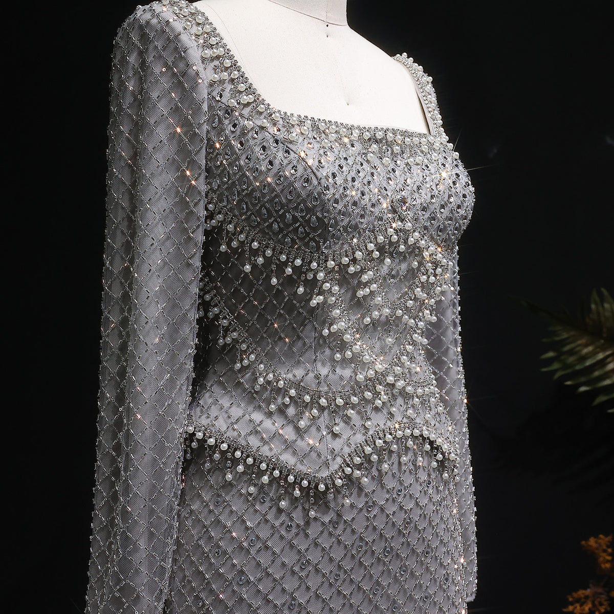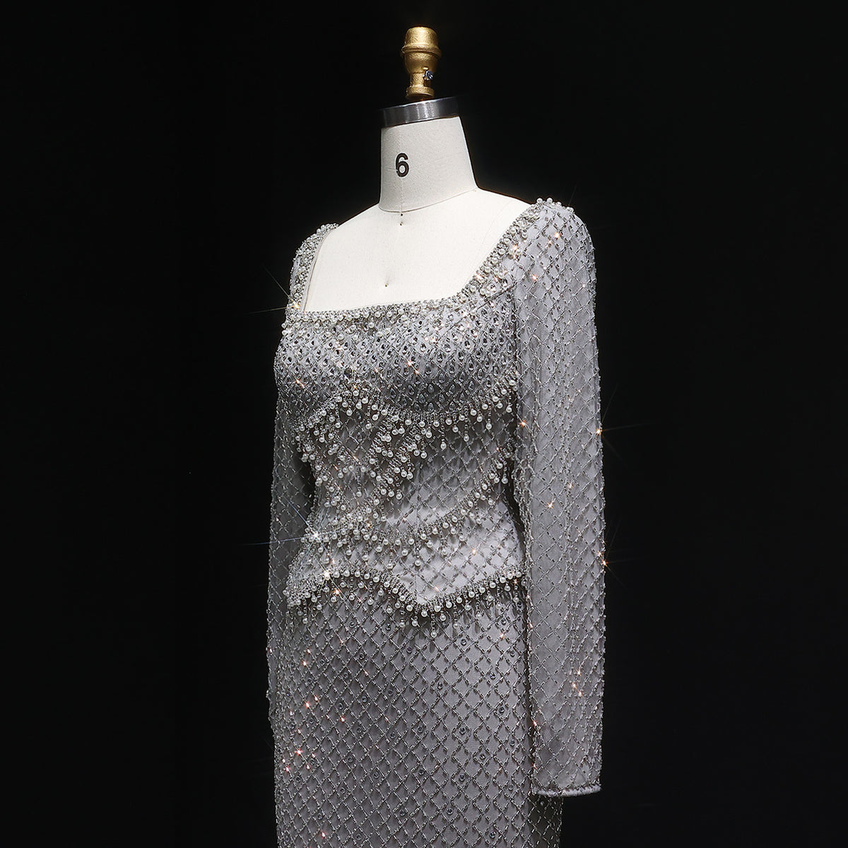 Sophisticated Gray Crystal Evening Dress with Sleek Long Sleeves SS633