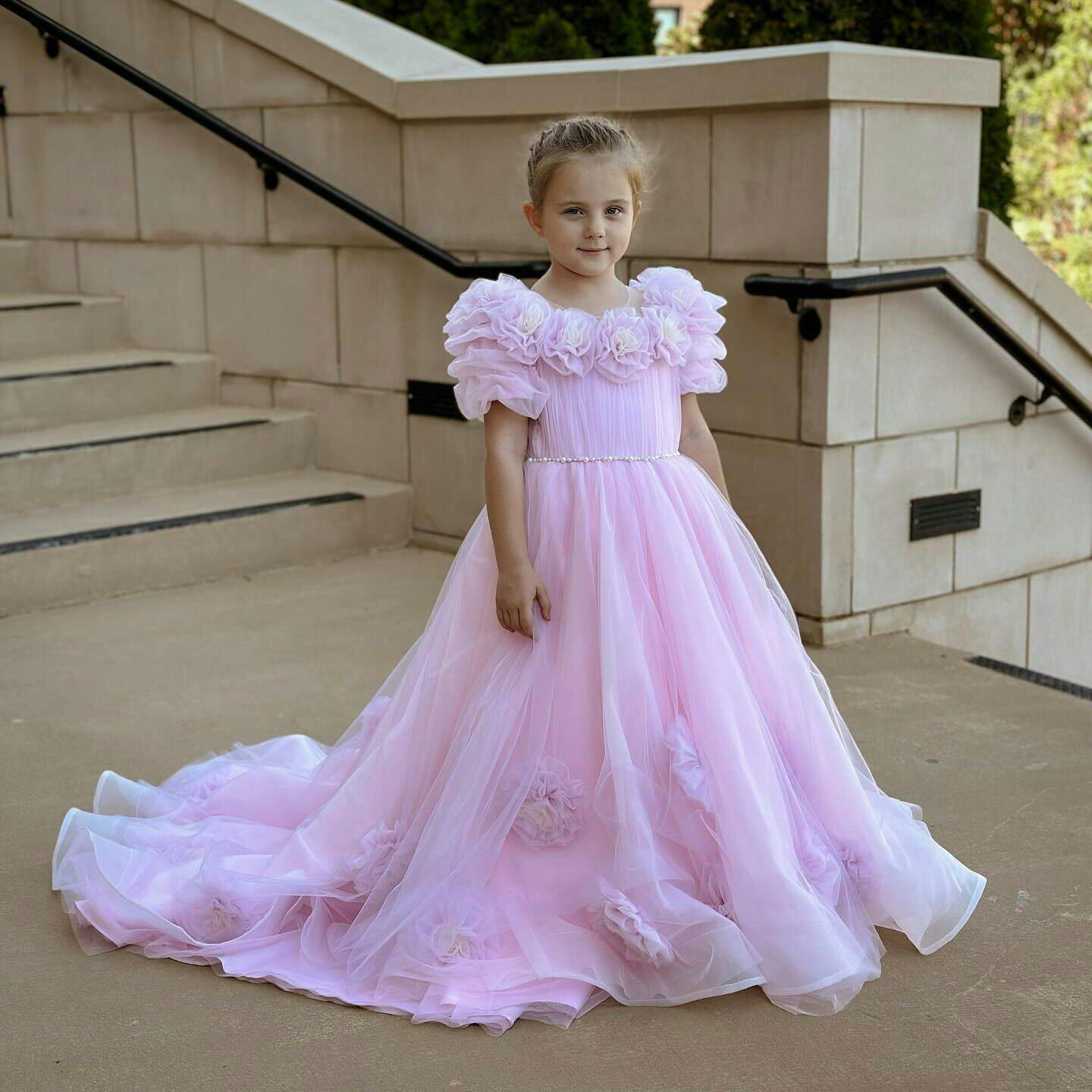 This dreamy pink princess gown is fit for any special occasion. Handmade flowers adorn the luxurious Arabic design, perfect for weddings, birthdays, communions, and quinceañeras. Make your little girl's day unforgettable with this elegant and unique dress. Available in a range of sizes to fit any princess-in-the-making.