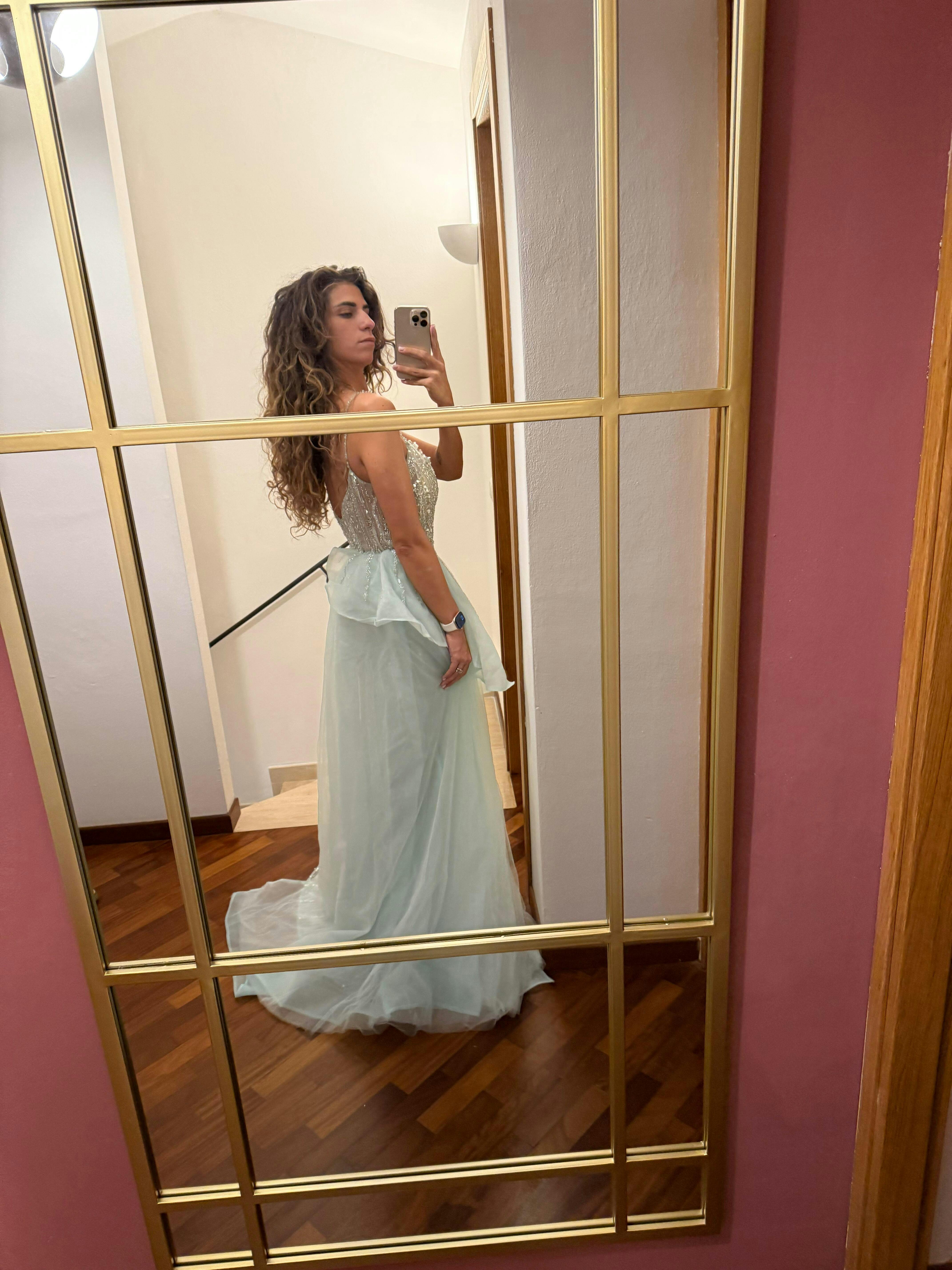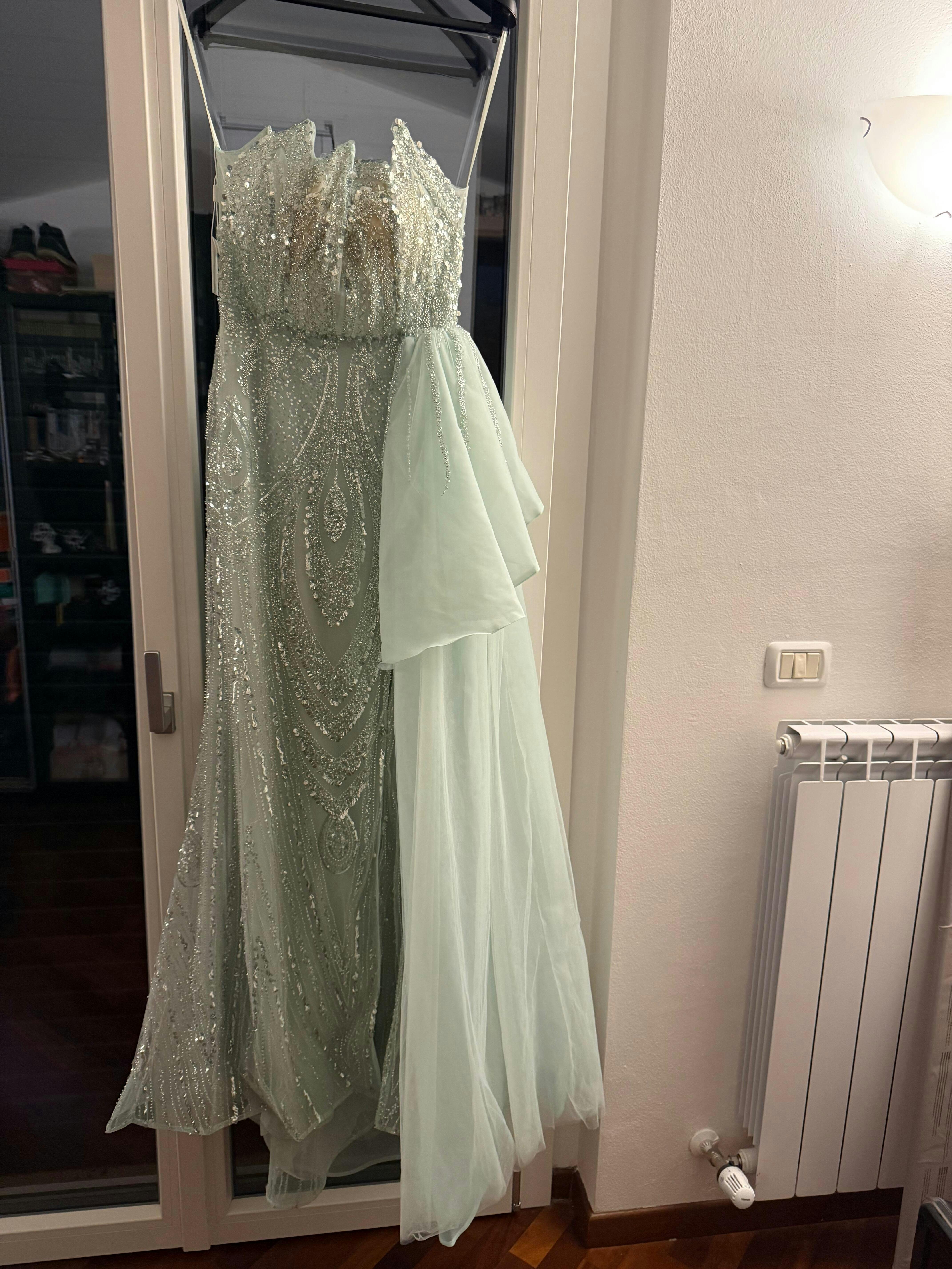 Expertly designed, this Dreamy Vow evening dress is a masterpiece. The sage green mermaid style accentuates your curves while the spaghetti straps provide support. The overskirt adds a touch of elegance while the side slit in blue adds a unique contrast. Ideal for weddings and formal events.