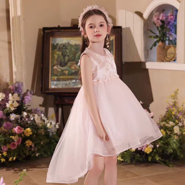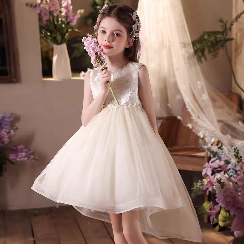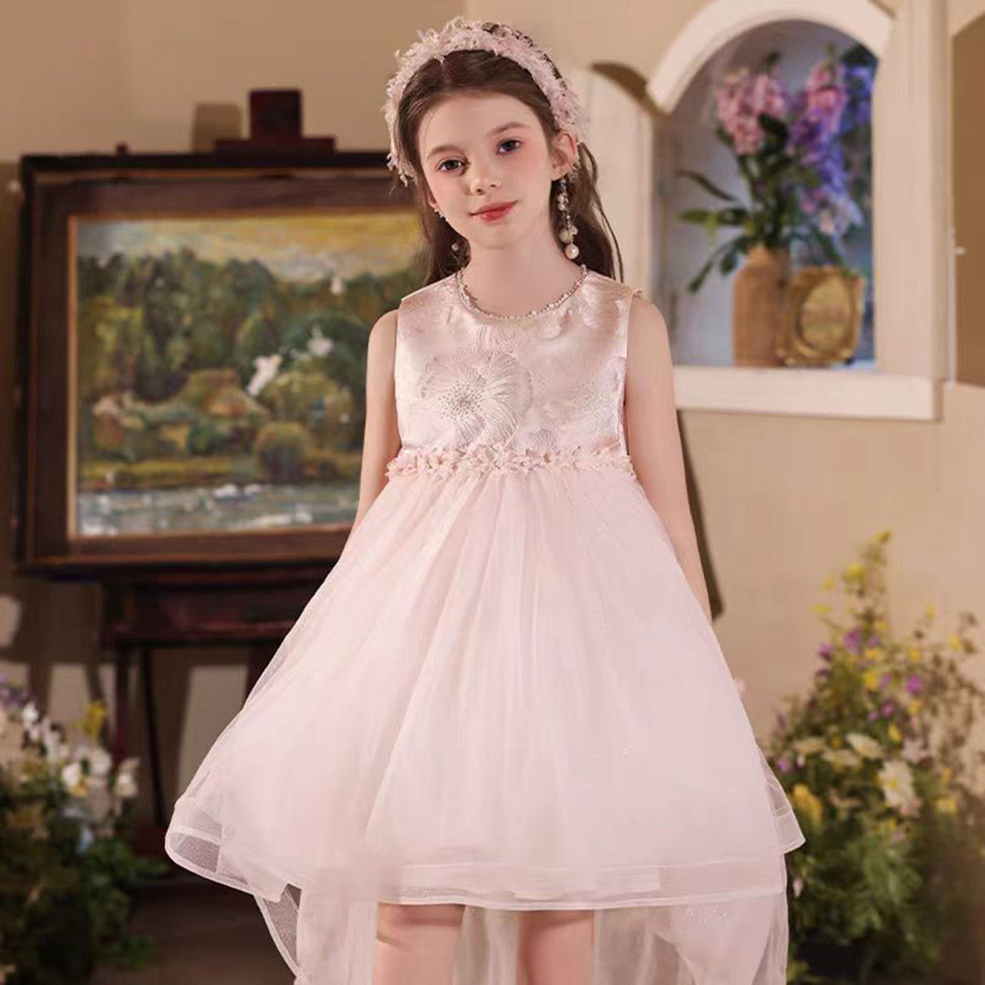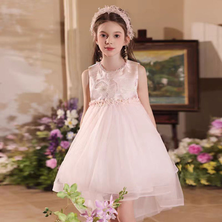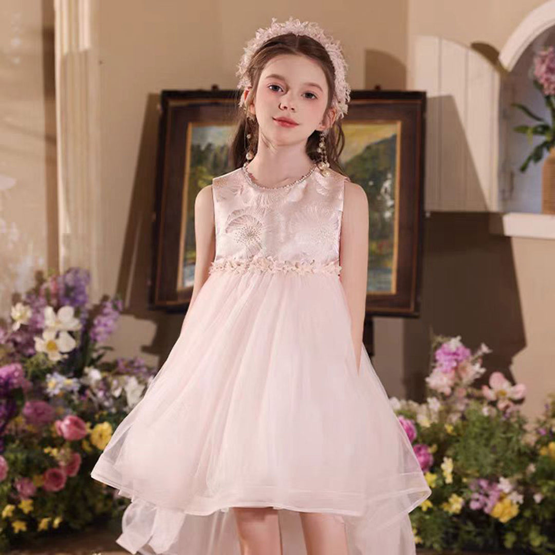 Elegant O-Neck Beaded Satin Tulle Flower Girl Dress With Tailing J525