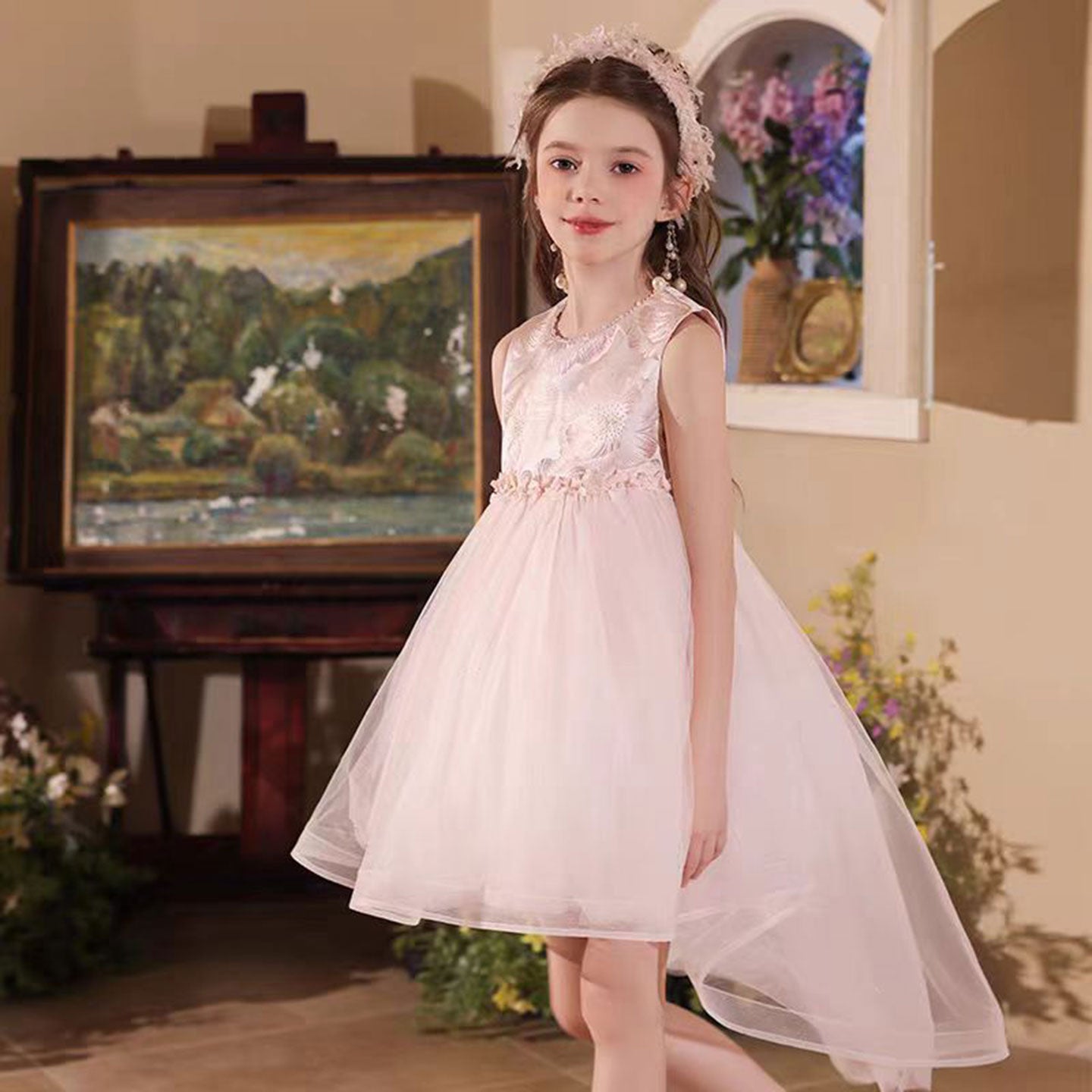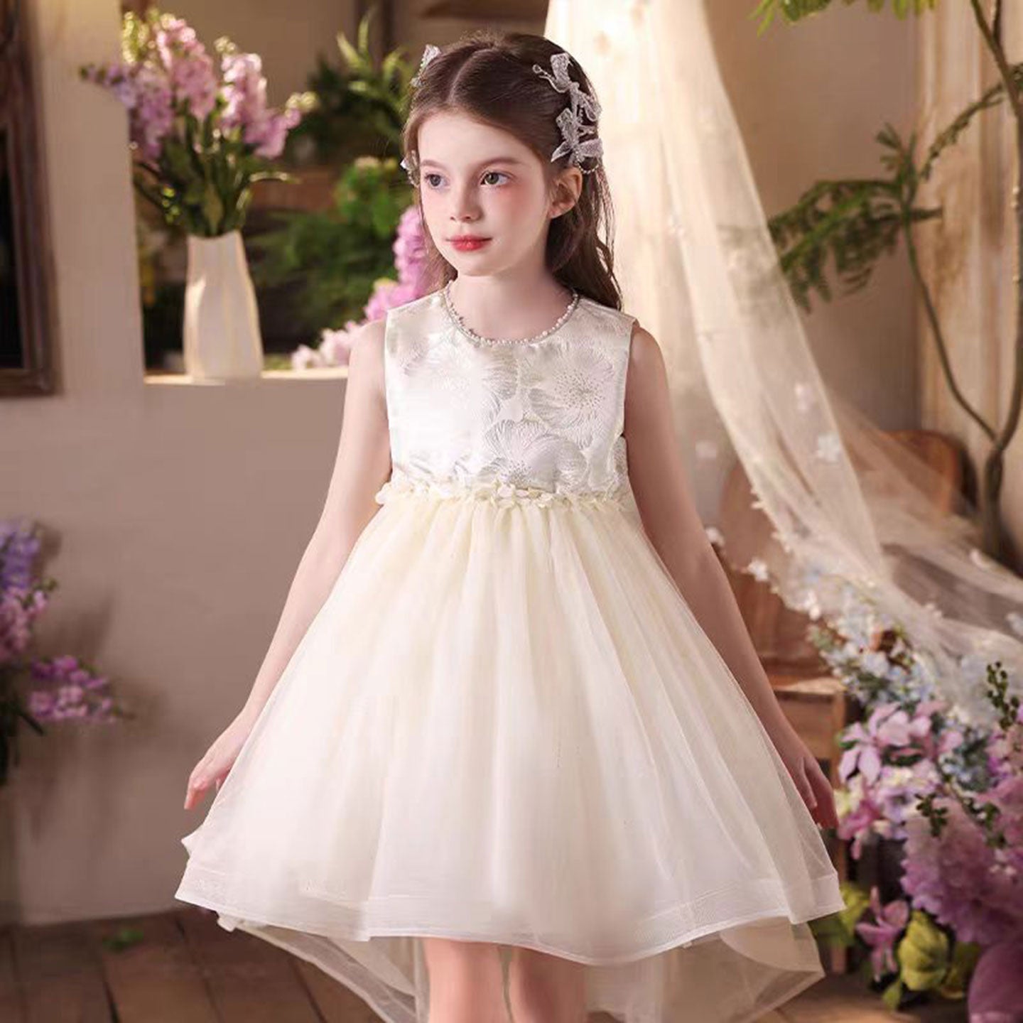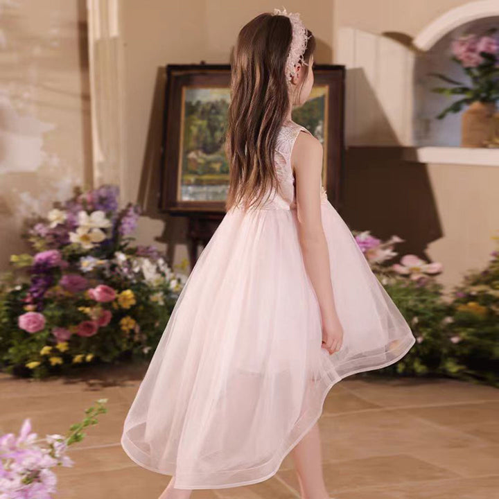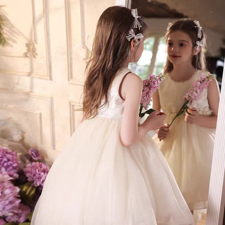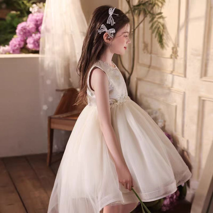 Elegant O-Neck Beaded Satin Tulle Flower Girl Dress With Tailing J525