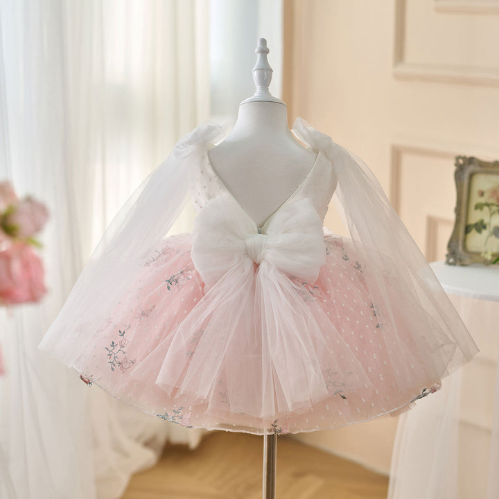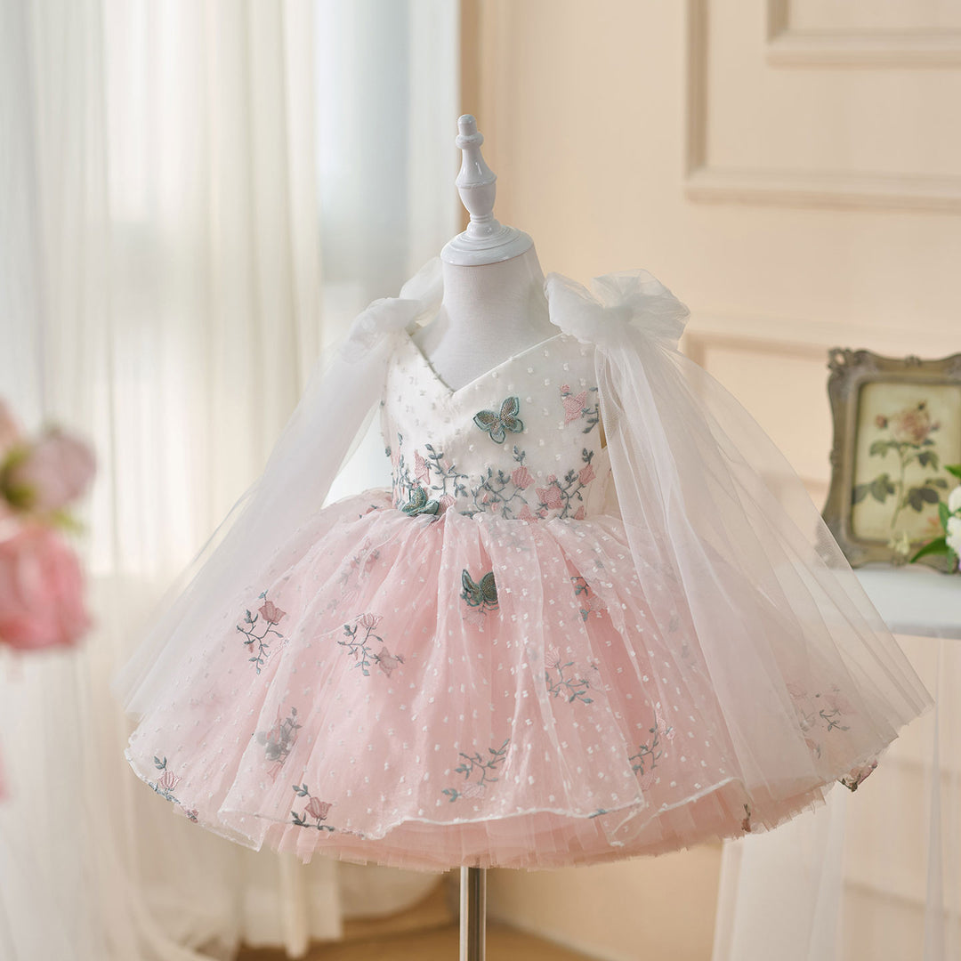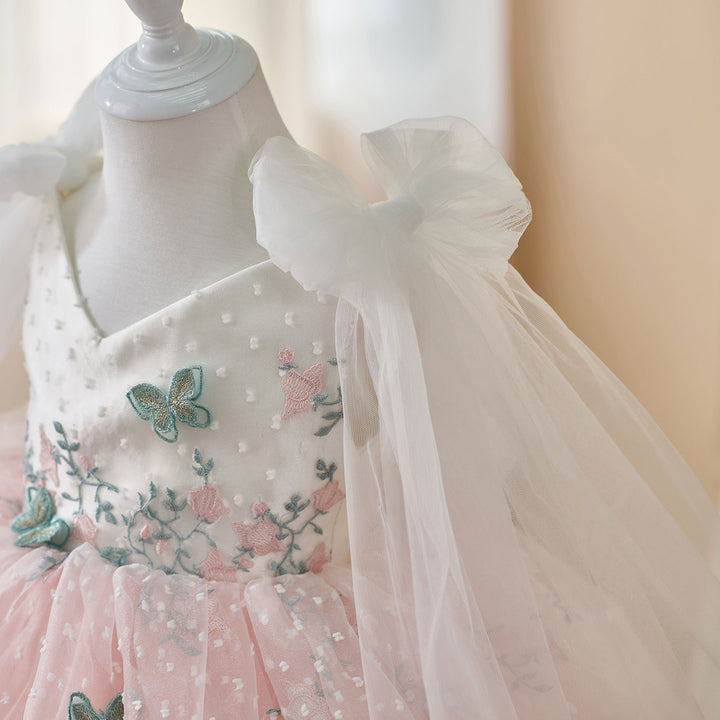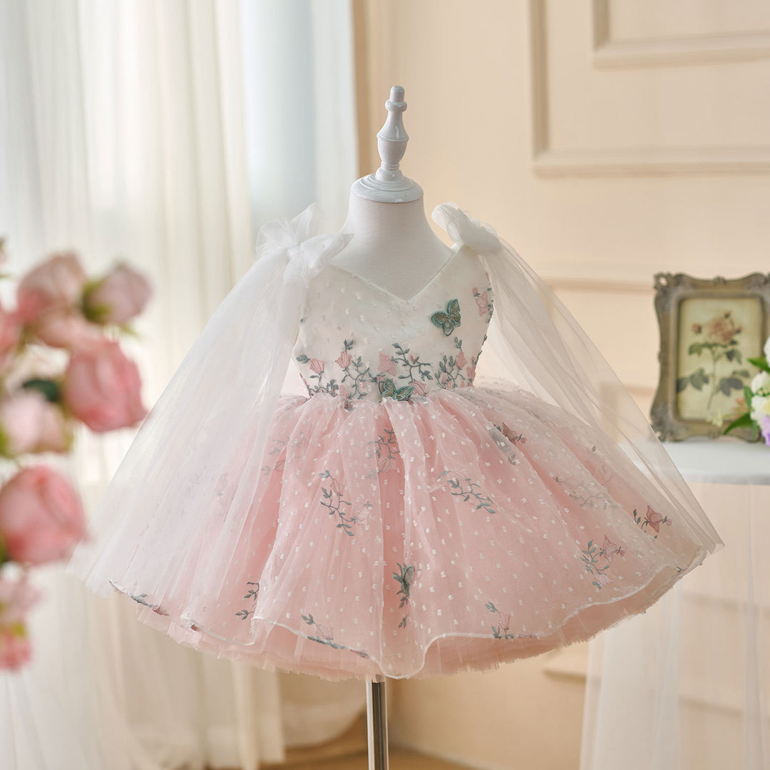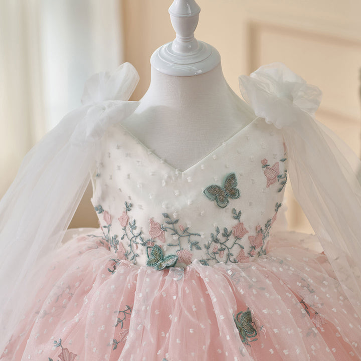 V-Neck Embroidered Flower Girl Dress Bow On Shoulder J470