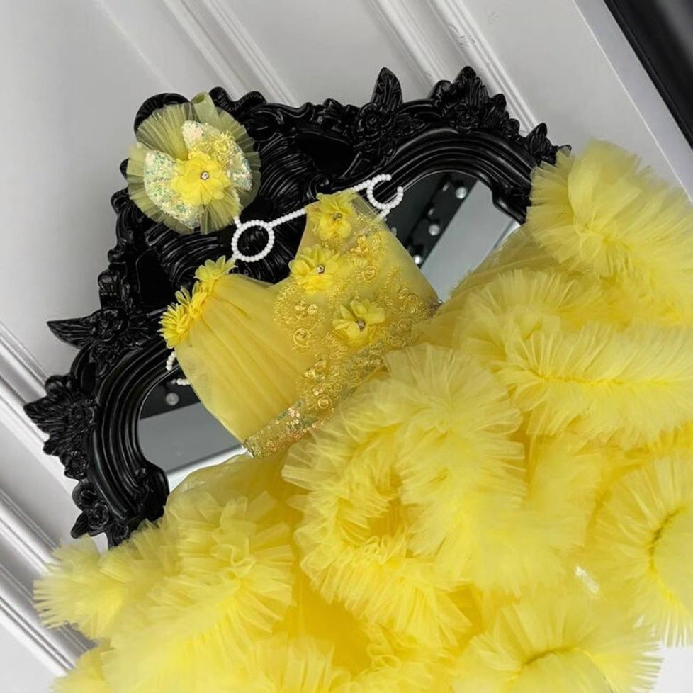 Elevate your flower girl's special day with this enchanting white princess dress. Crafted from luxurious 3D floral tulle, each delicate bloom is meticulously layered to create stunning dimensional detail that catches light beautifully. The flowing silhouette features a fitted bodice and voluminous skirt, perfect for creating those magical wedding day moments. Premium tulle construction ensures comfort throughout the celebration while maintaining an elegant, sophisticated appearance. Ideal for weddings, formal events, and cherished photographs. This timeless design combines classic princess aesthetics with modern craftsmanship, making it a treasured keepsake for years to come.