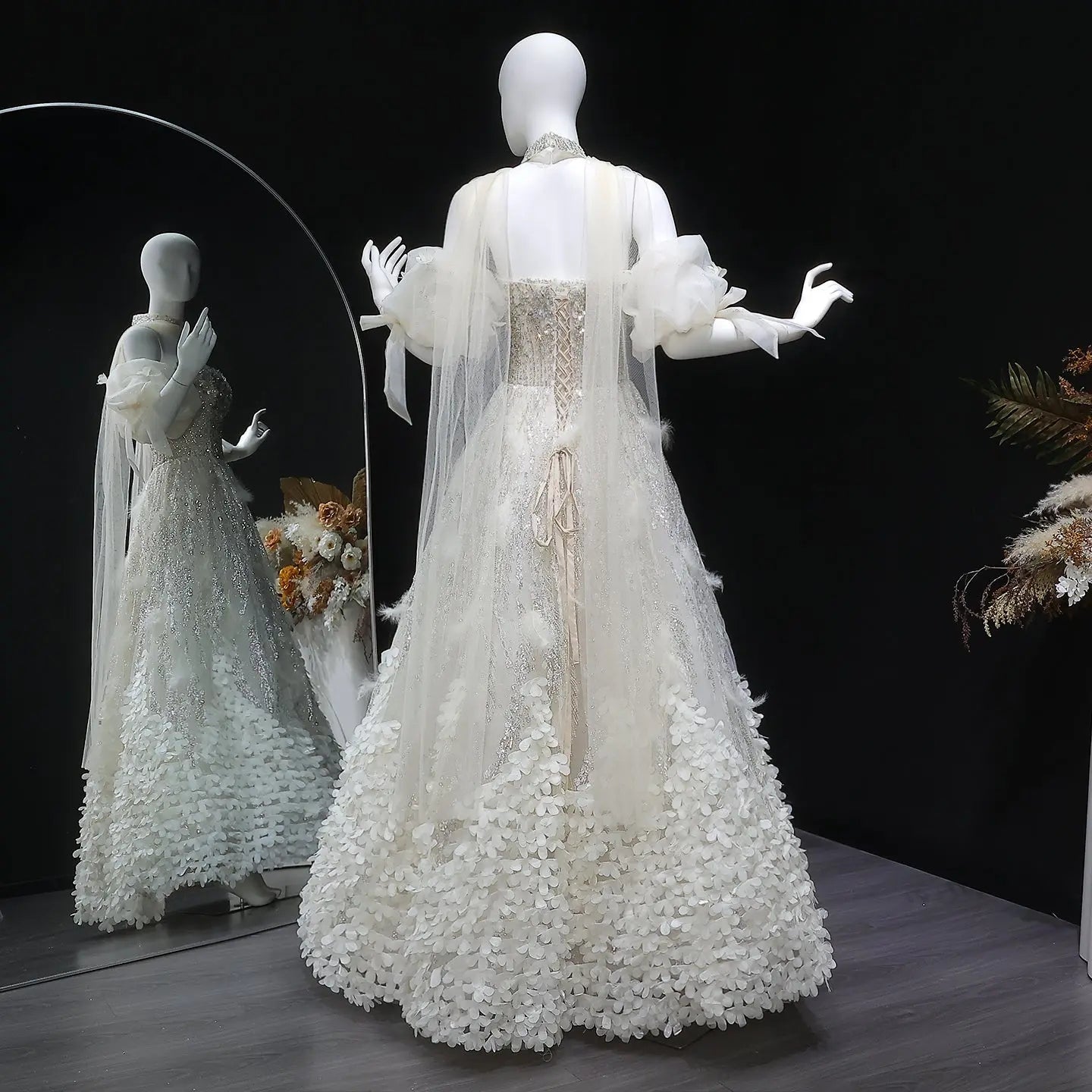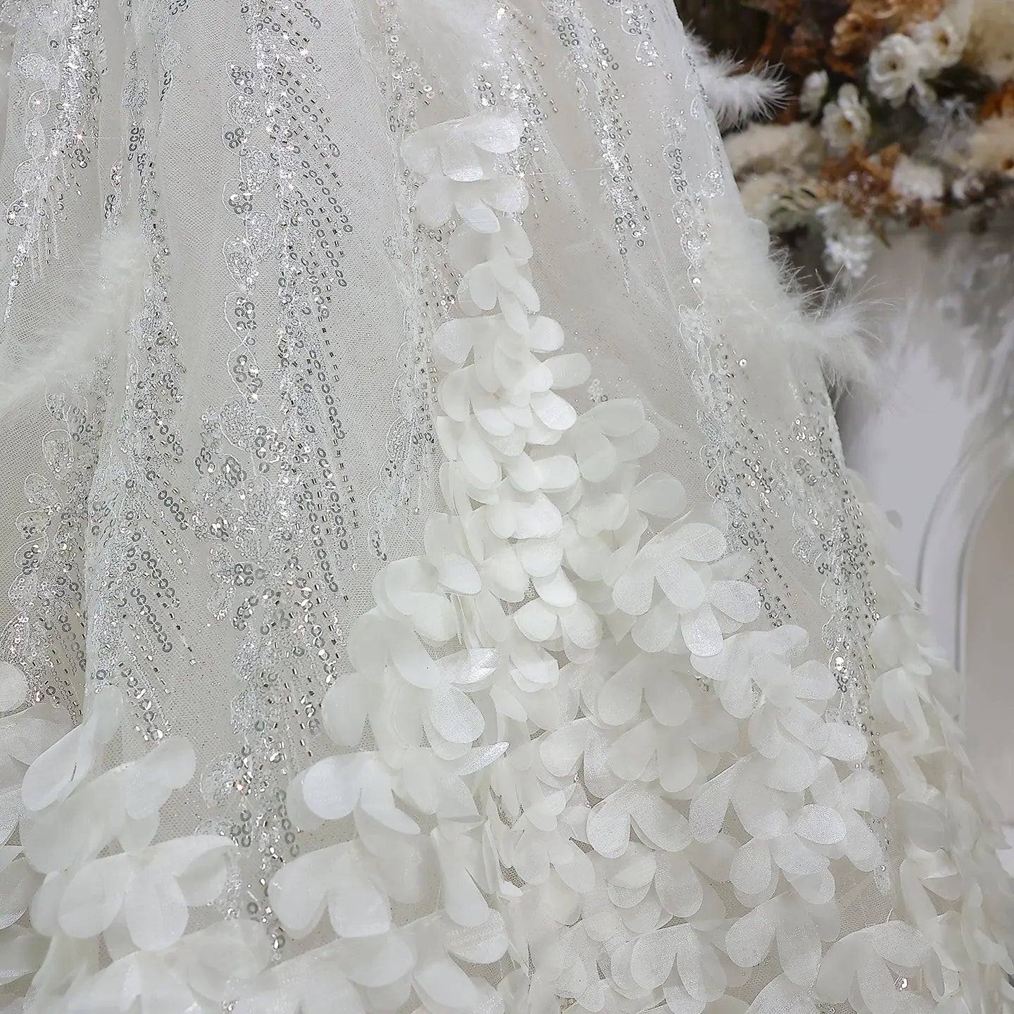 Elegant Beige Sequin Ball Gown with 3D Petal Skirt Evening Dress SS741