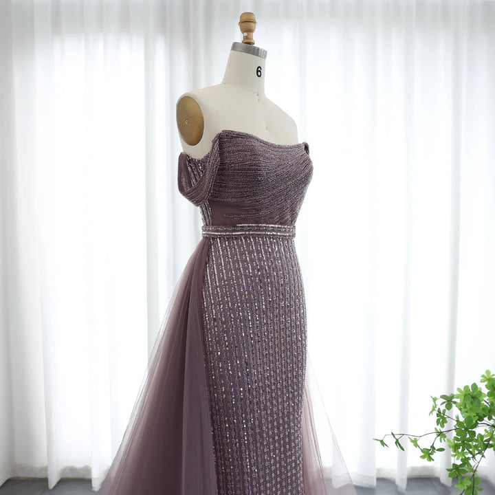 This elegant evening gown features a stunning off shoulder design, made with luxurious gold accents. Perfect for weddings and formal events, its timeless purple color exudes sophistication and style. Step into the spotlight and make a statement with this beautiful piece.