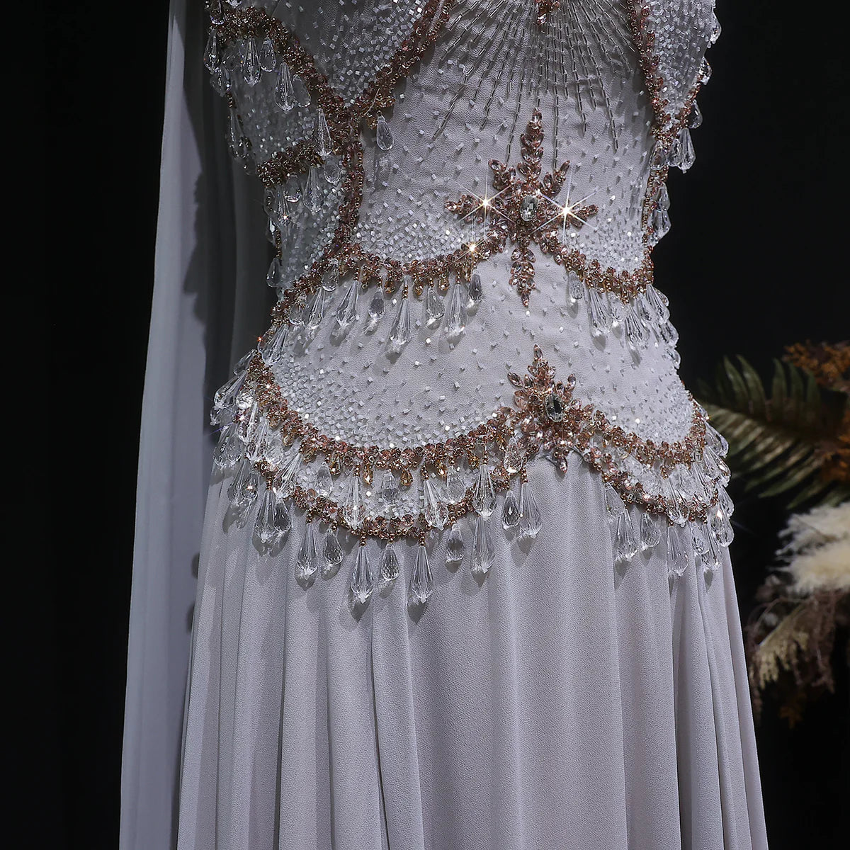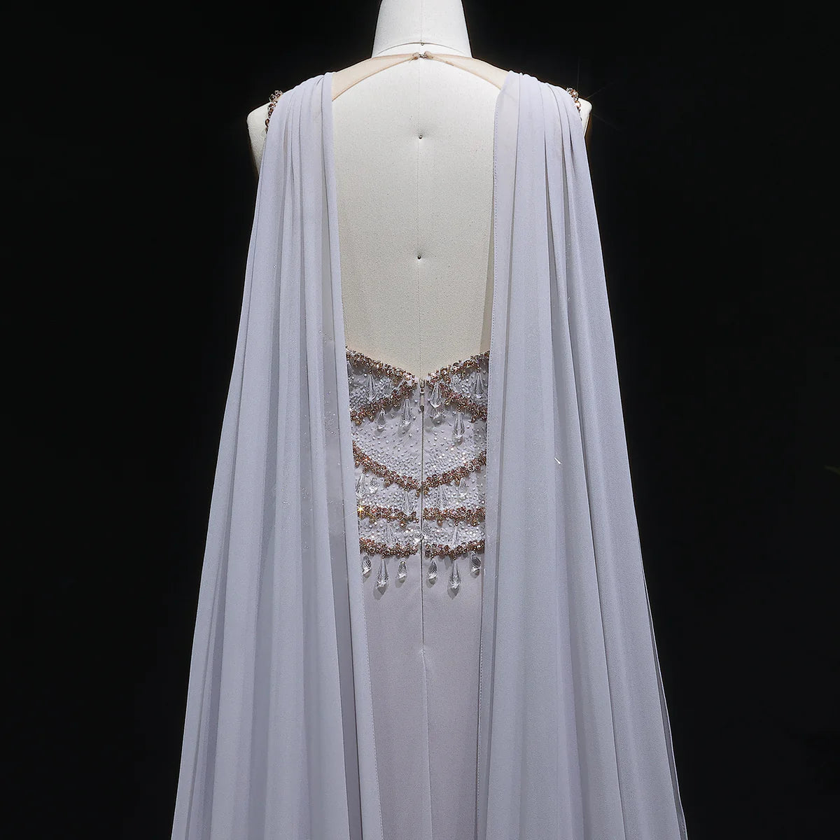 Make an unforgettable entrance in this silver gray masterpiece, where hand-placed beads and crystals create a dazzling surface that sparkles under any light. The graceful flowing cape adds dramatic movement and sophistication, elevating your silhouette with an air of refined elegance. Designed for the discerning wearer, this gown balances intricate embellishment with fluid draping, delivering both visual impact and wearable comfort. An investment piece that transforms any formal occasion into a memorable moment.