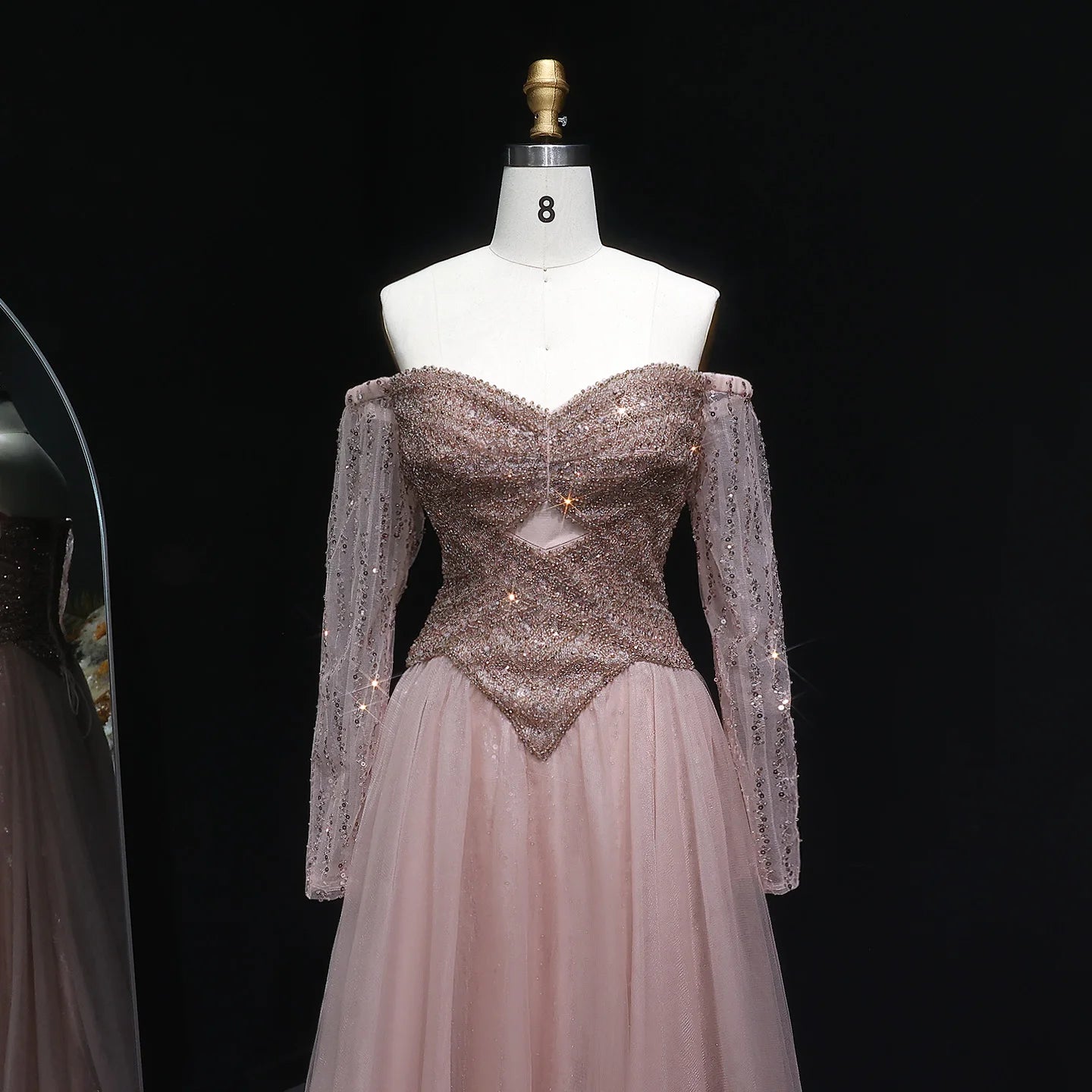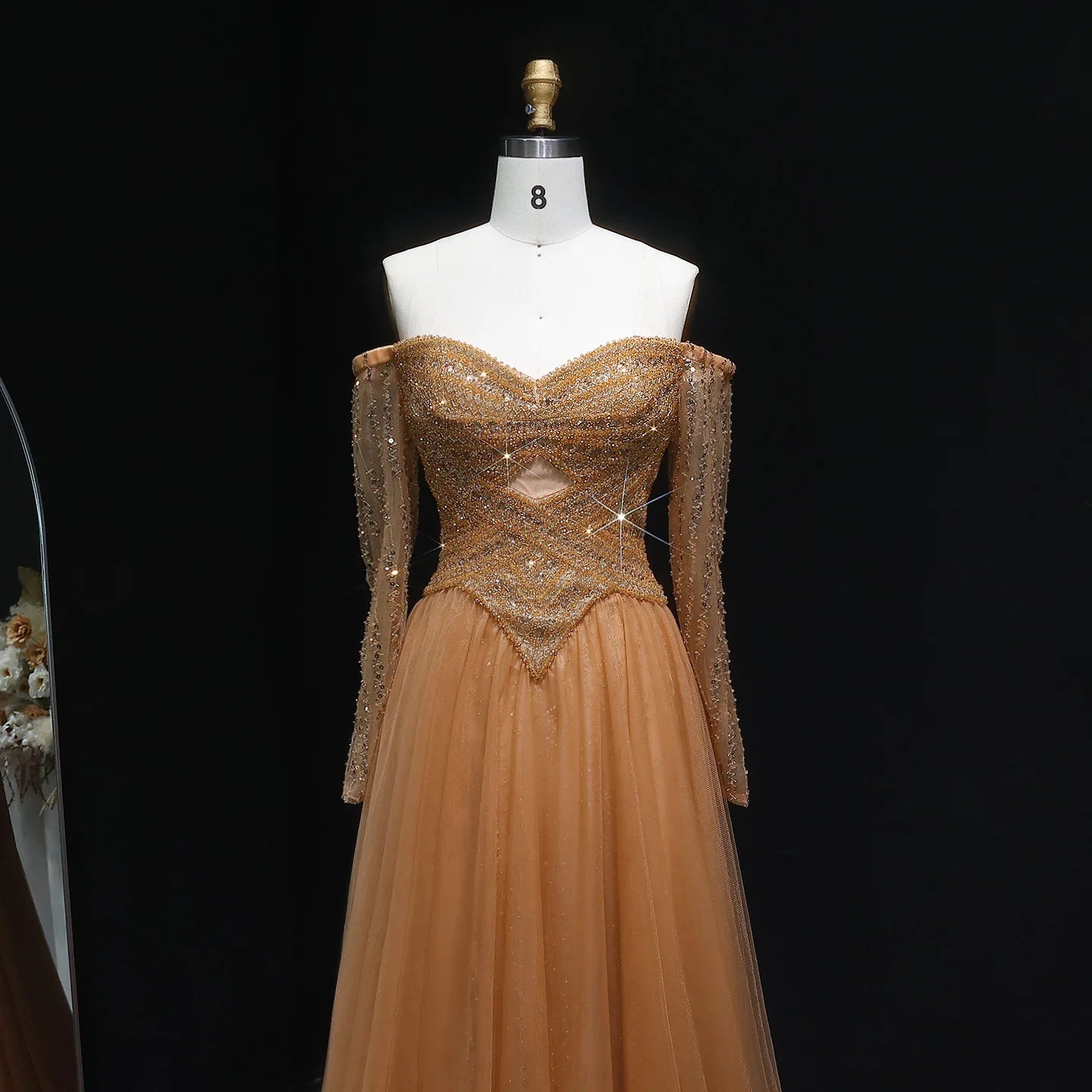 Elegant Champagne Off Shoulder Evening Gown with Arabic Style SS116