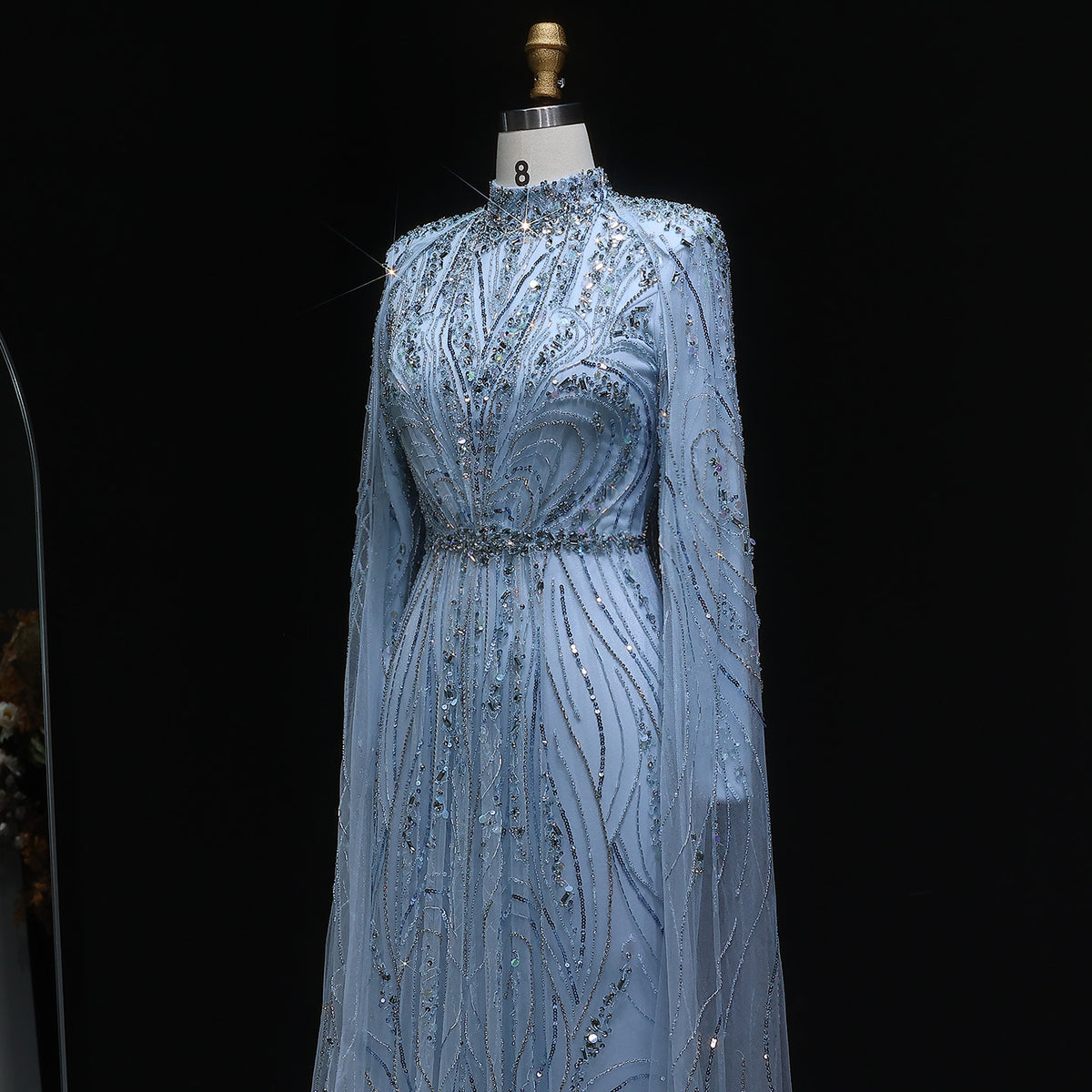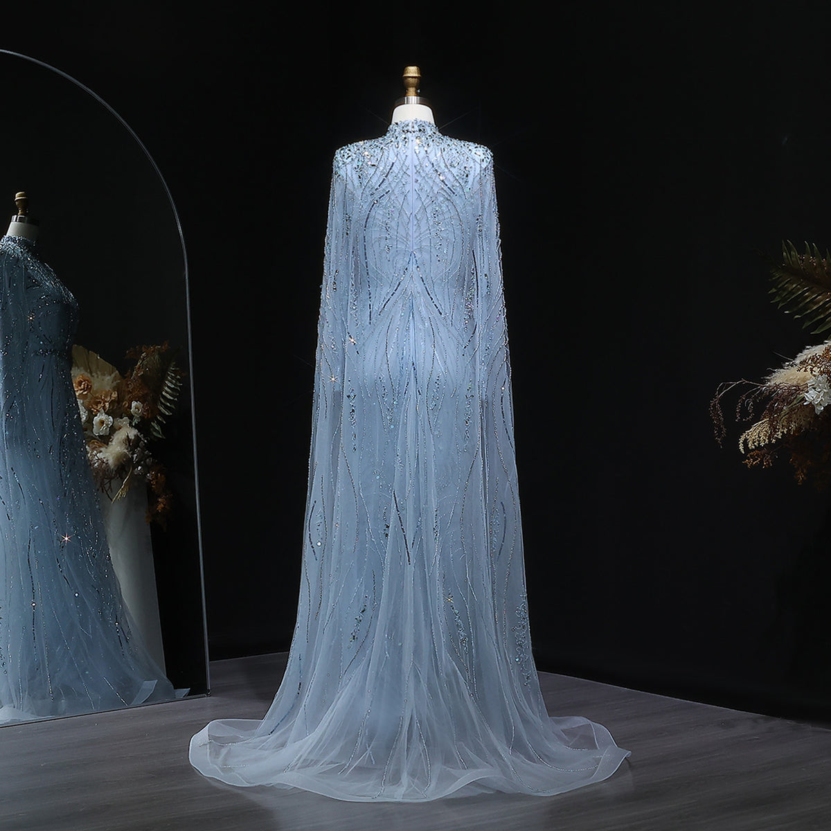 This luxury champagne evening dress features a high neckline and long sleeves, complemented by a flowing cape that adds dramatic elegance. Crafted to enhance your silhouette, it combines regal sophistication with modern design, making it an exceptional choice for formal events and special occasions.