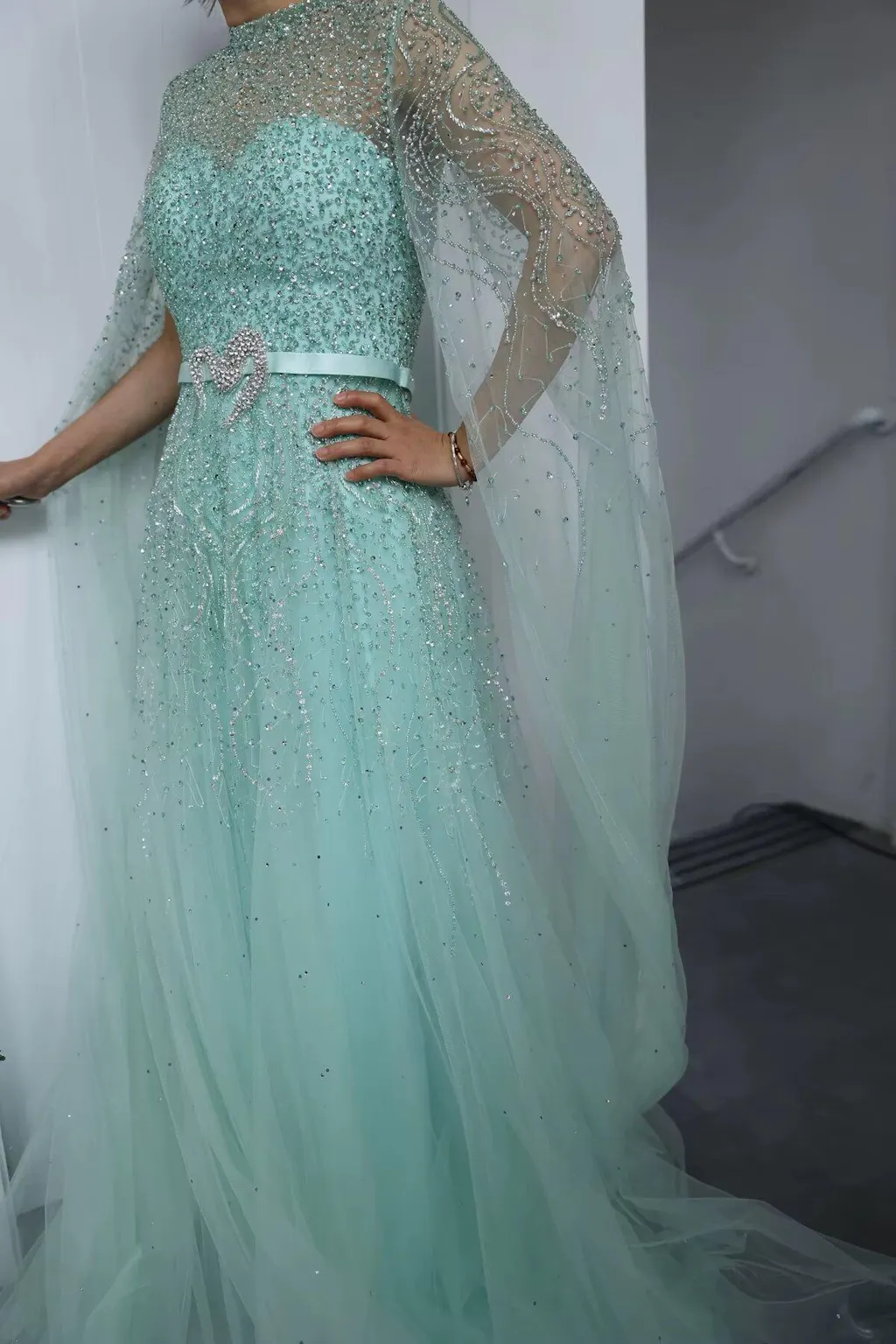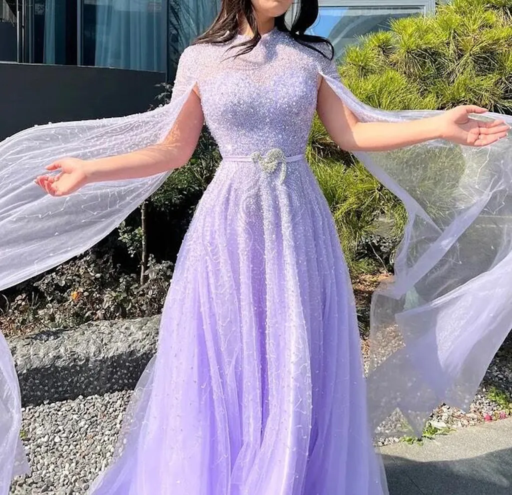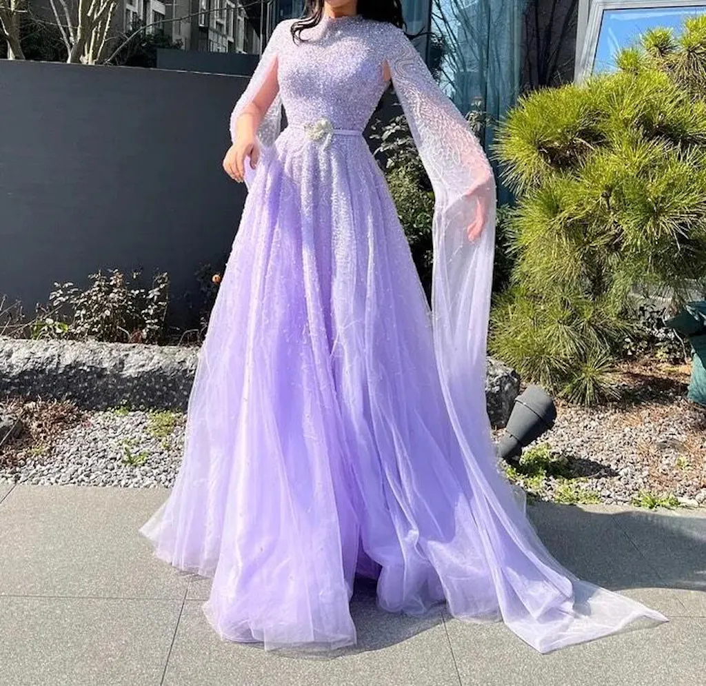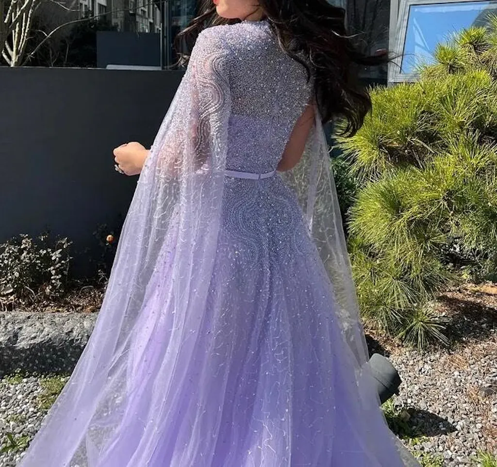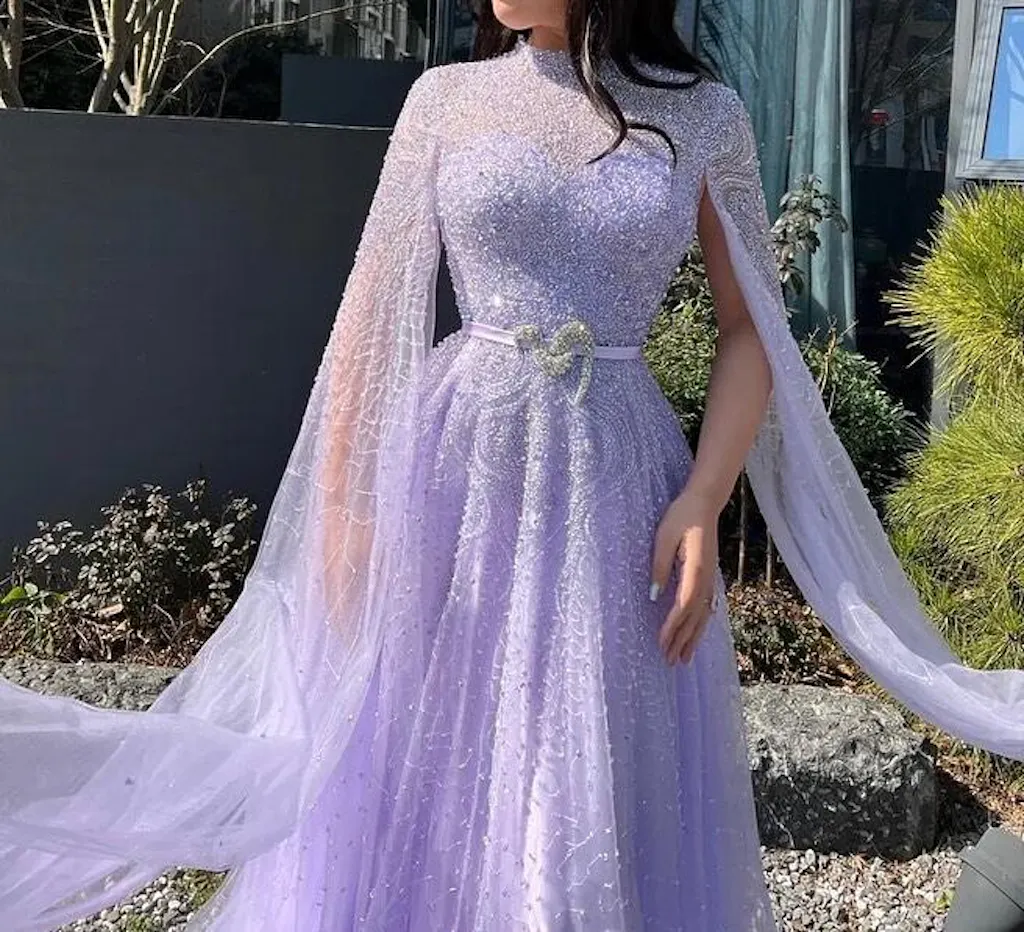 Experience the ultimate elegance and sophistication with our Dreamy Vow Luxury Dubai Blue Arabic Evening Dress. Adorned with beautiful cape sleeves and a high neck, this dress showcases the perfect blend of modern and traditional styles. Perfect for any special occasion, be the star of the night in this stunning gown.