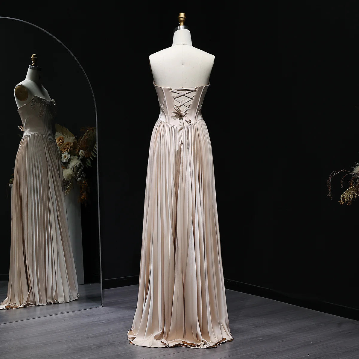 This elegant white wedding gown features intricate beaded embroidery paired with delicate layered ruffles, creating a harmonious blend of texture and sophistication. Designed to flatter with its graceful silhouette, this gown adds depth and movement for a captivating bridal look. Perfect for brides who appreciate refined details and timeless elegance on their special day.