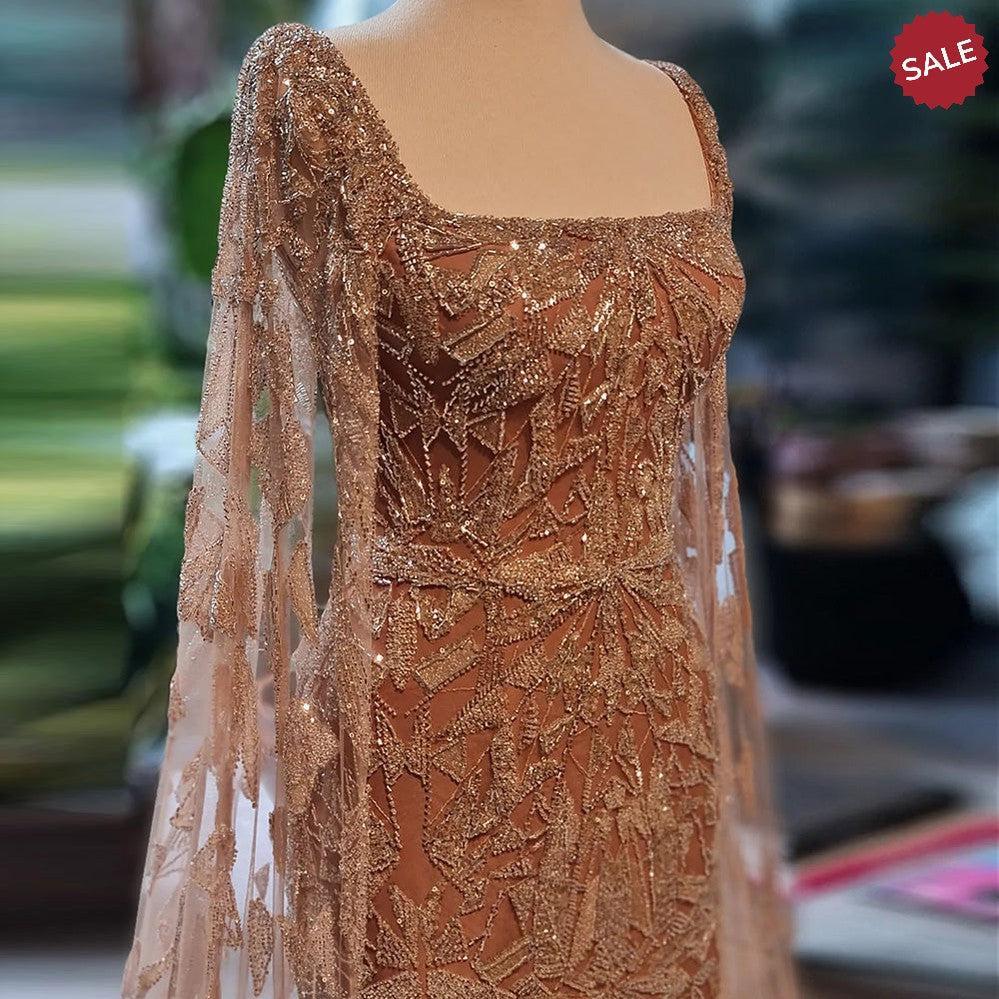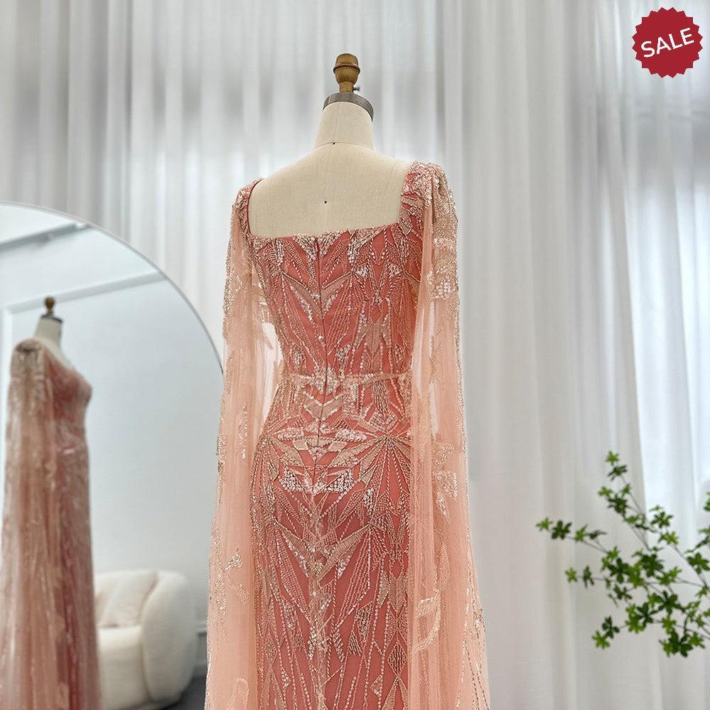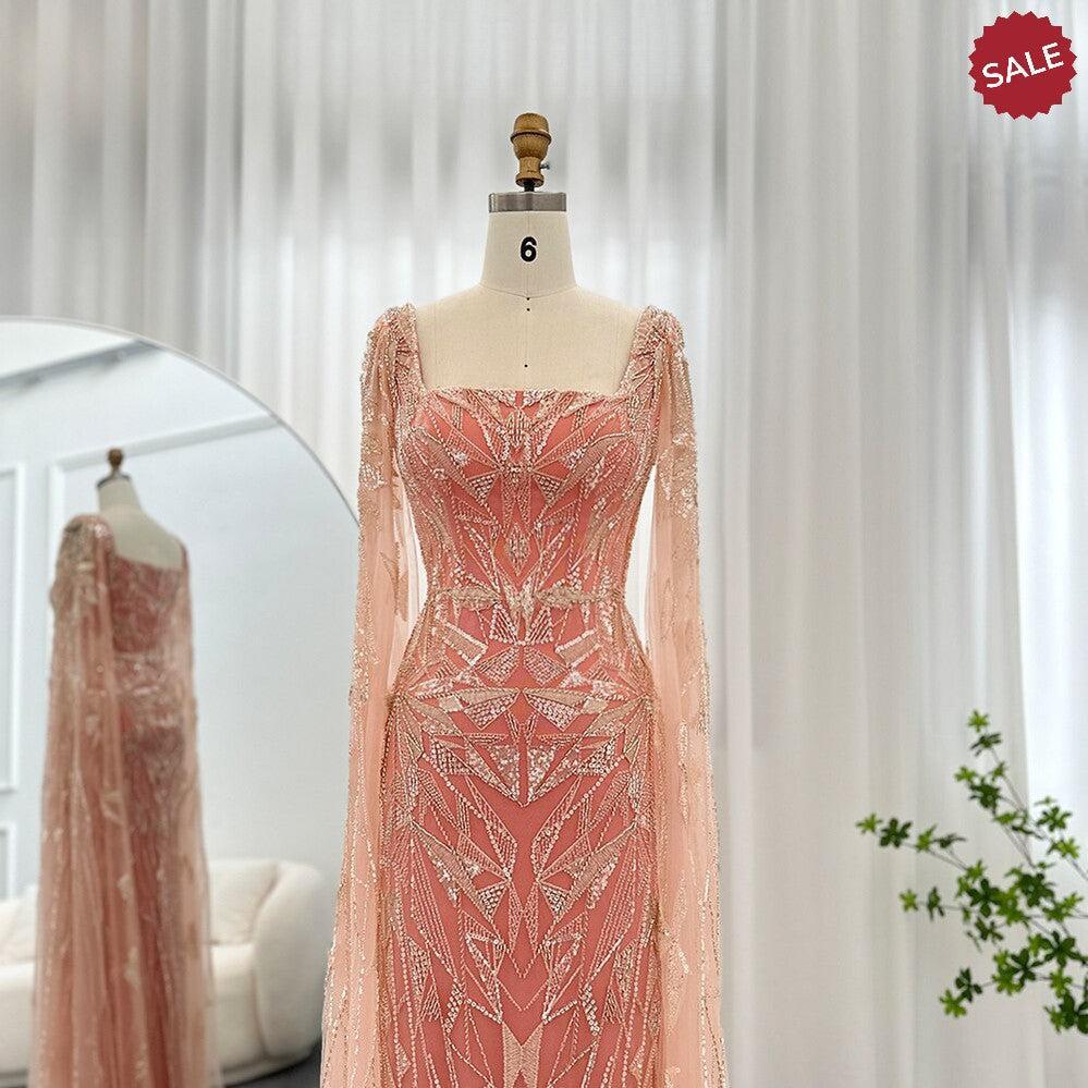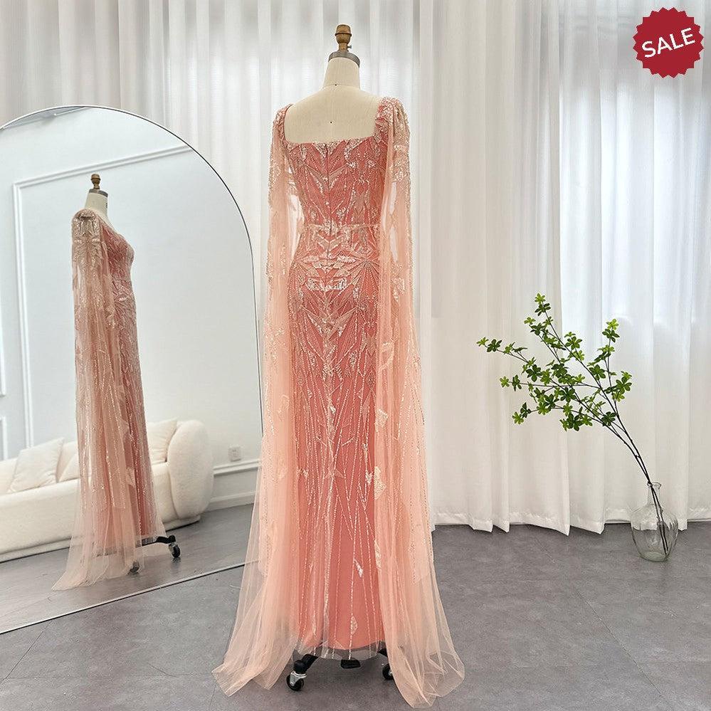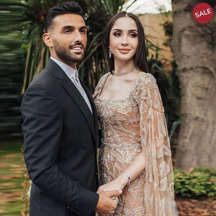 Elevate your style with our Dreamy Vow evening dress in nude pink. The luxurious Saudi Arabic design features a square collar and elegant cape sleeves, perfect for any wedding party. Make a statement with our haute couture gown, adding a touch of glamour to your special day.