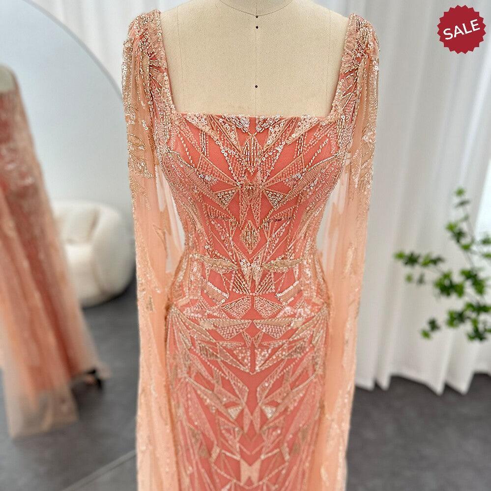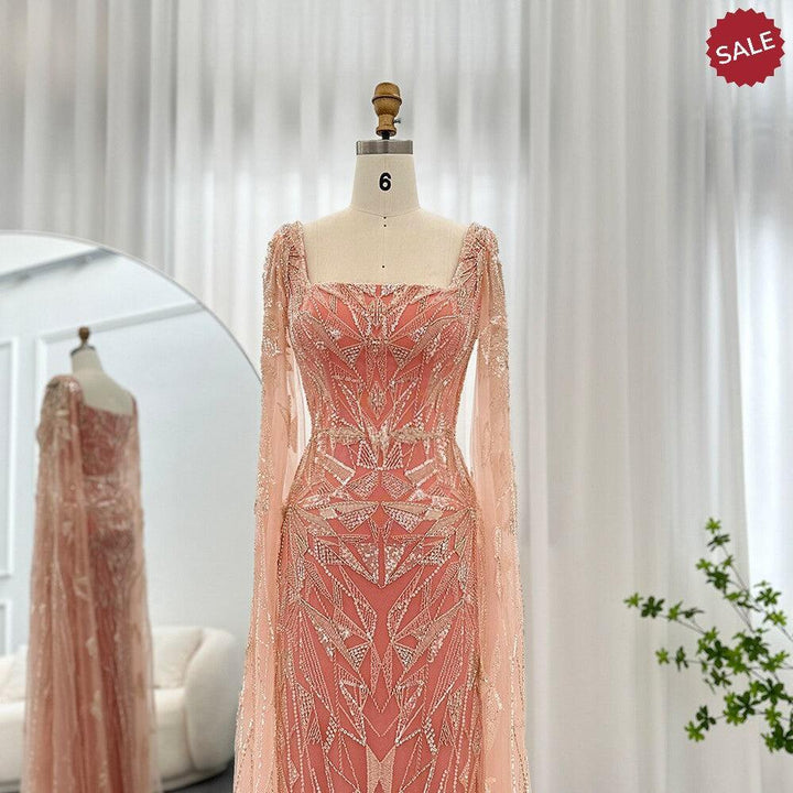 Dreamy Vow Saudi Arabic Nude Pink Luxury Dubai Evening Dresses with Cape Sleeves Square Collar Women Wedding Party Gowns 497