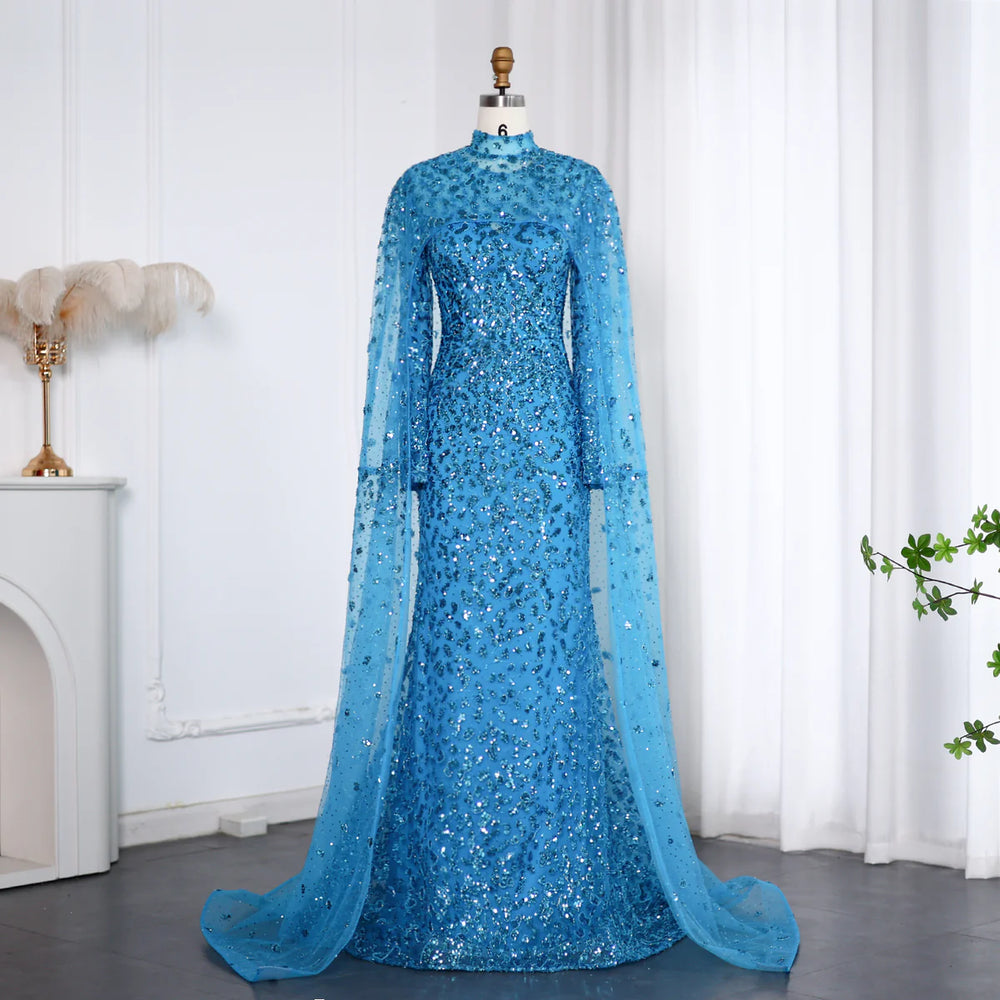 Luxury Blue Evening Dress with Cape Sleeves SS001