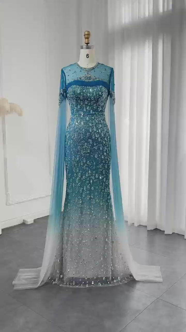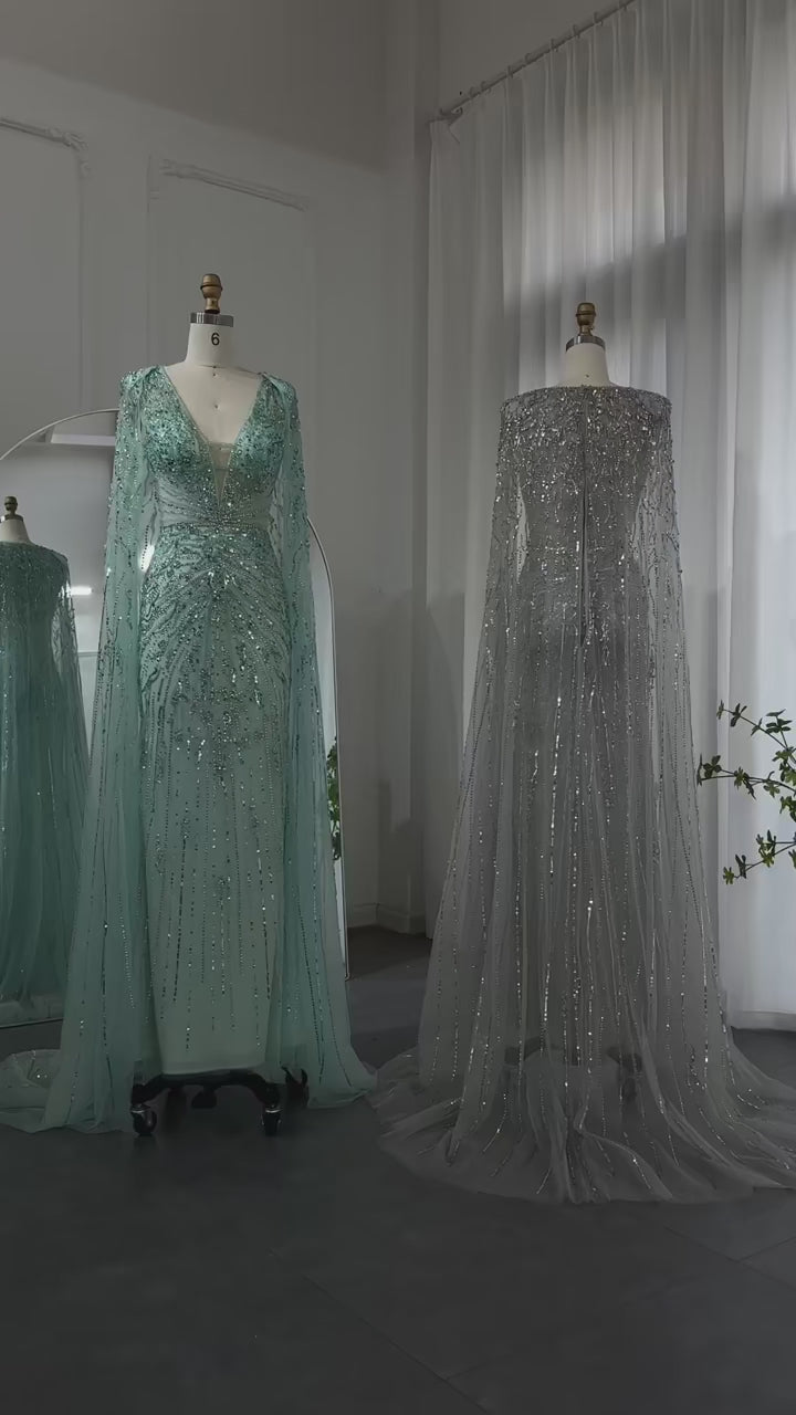 Luxury Dubai Turquoise Mermaid Evening Dresses with Cape V-Neck SS397