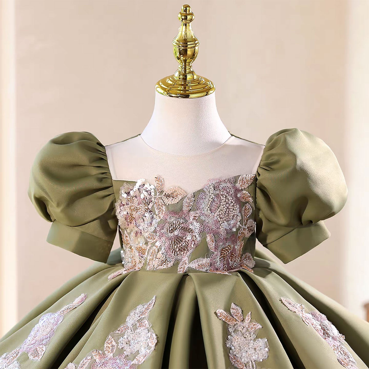 Green Flower Girl Dress Puffy Sleeves for Wedding Birthday Party D107