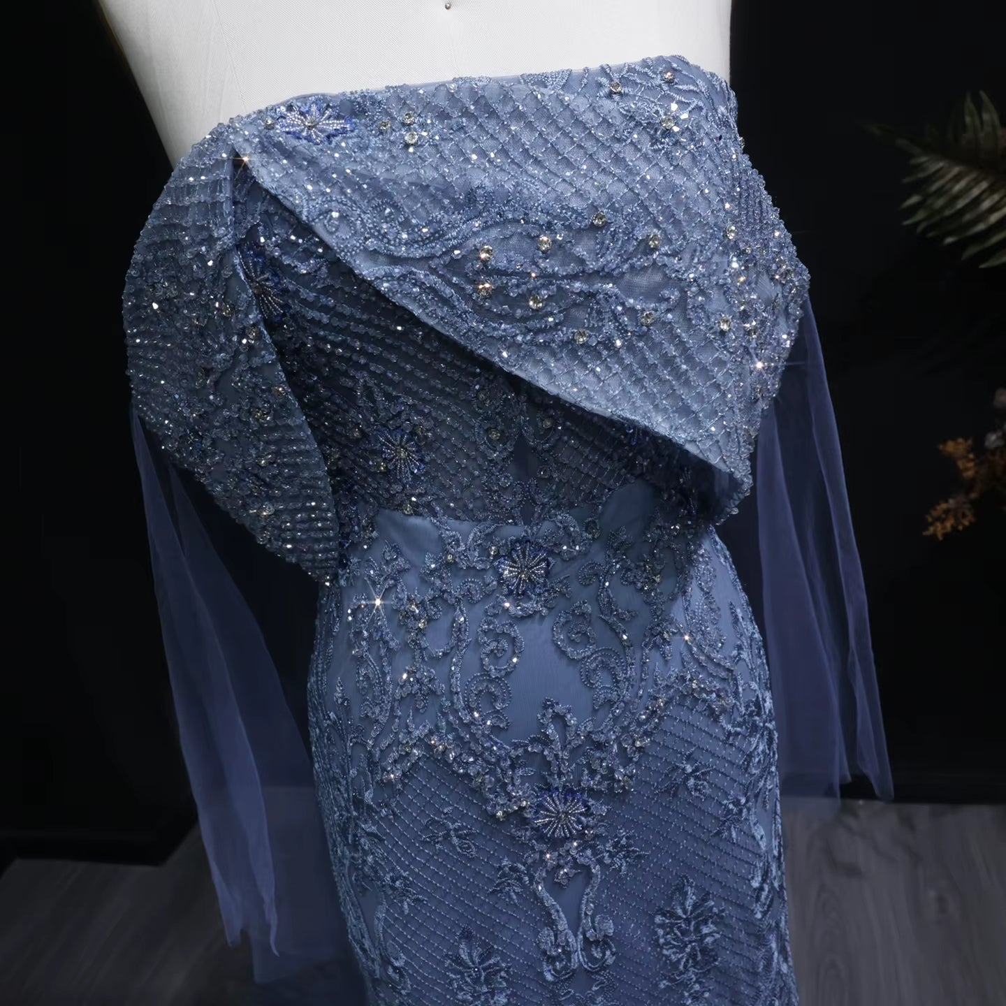 Luxury Blue Beaded Off Shoulder Evening Dress SS083