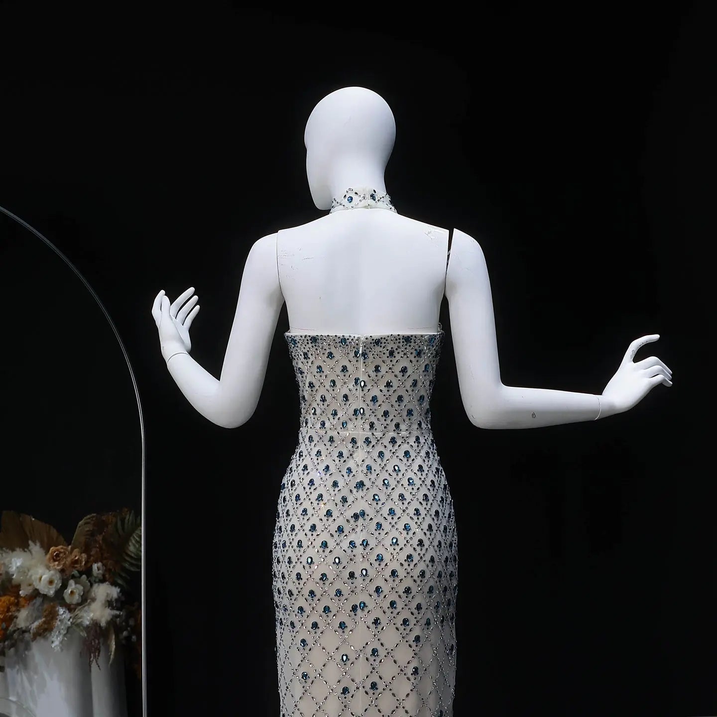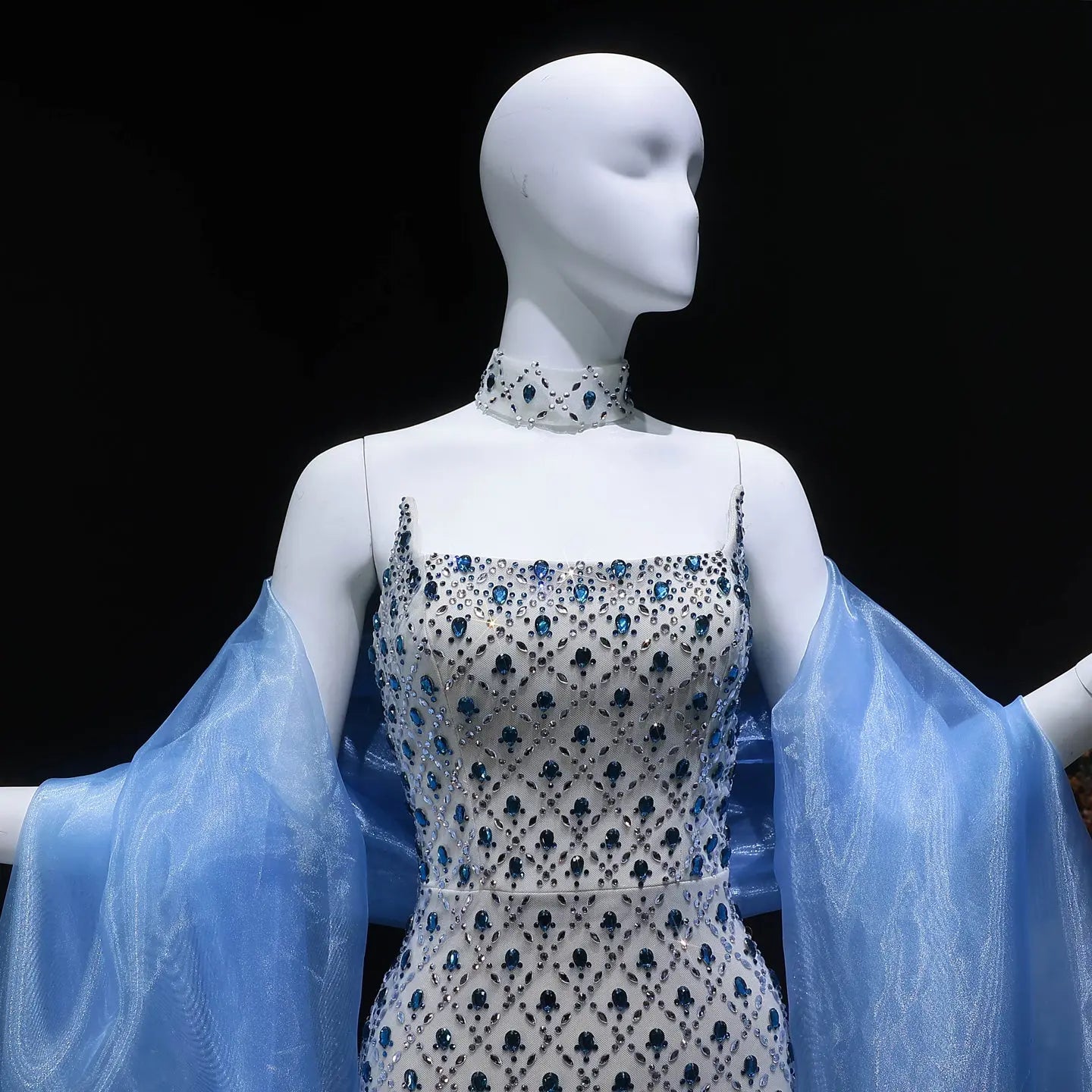 Elevate your evening elegance with this stunning crystal beaded column dress. Intricate beading cascades down the silhouette, creating a luxurious shimmer that catches light beautifully. The choker neckline adds modern sophistication, while the sheer blue cape drapes gracefully from the shoulders, offering movement and drama. Perfect for galas, formal events, and special occasions where you want to make an unforgettable impression. The fitted column design flatters the figure while the flowing cape adds an ethereal touch. A timeless piece that combines classic glamour with contemporary style.
