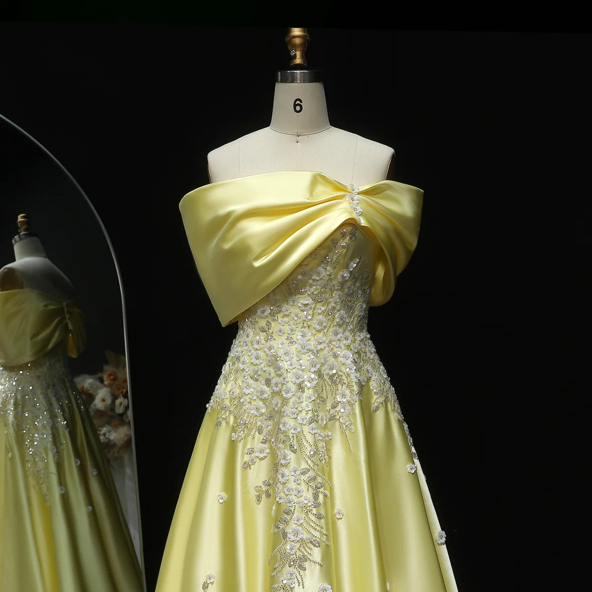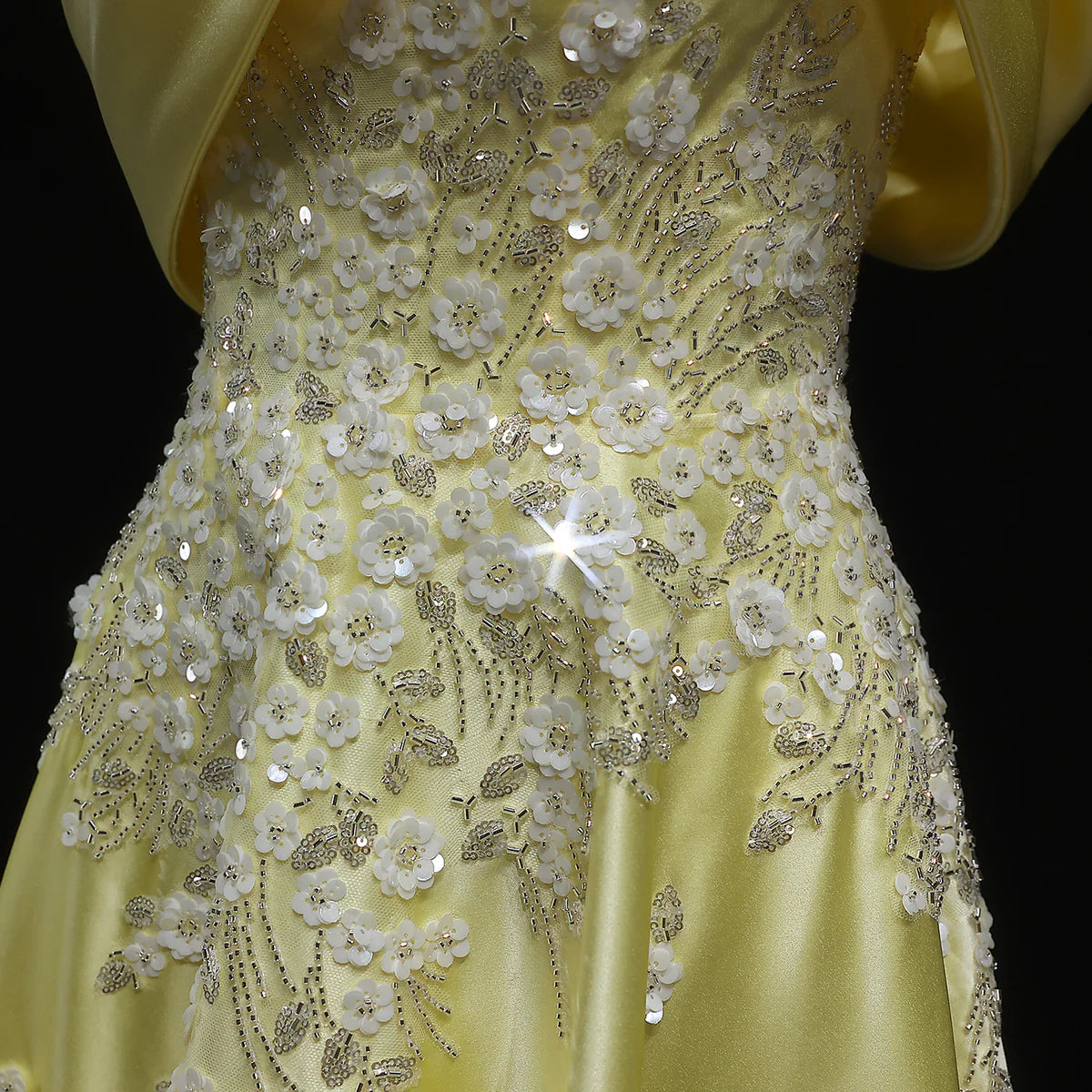 Luxury Yellow Satin with 3D Floral Sequin Embroidery Evening Dress XD032