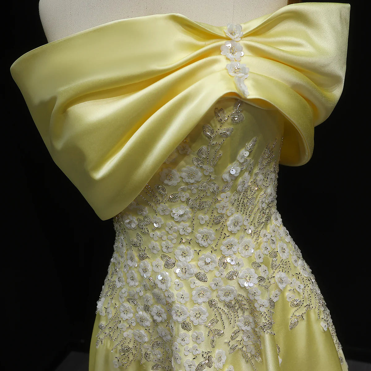 Radiate timeless elegance in this exquisite yellow satin evening dress, where luxurious fabric meets intricate craftsmanship. The bodice features stunning 3D floral sequin embroidery that catches light with every movement, creating a captivating dimensional effect. Tailored for a refined silhouette, this gown combines premium satin draping with meticulous beadwork to deliver an unforgettable presence at formal occasions. Perfect for those who appreciate sophisticated design and impeccable attention to detail.