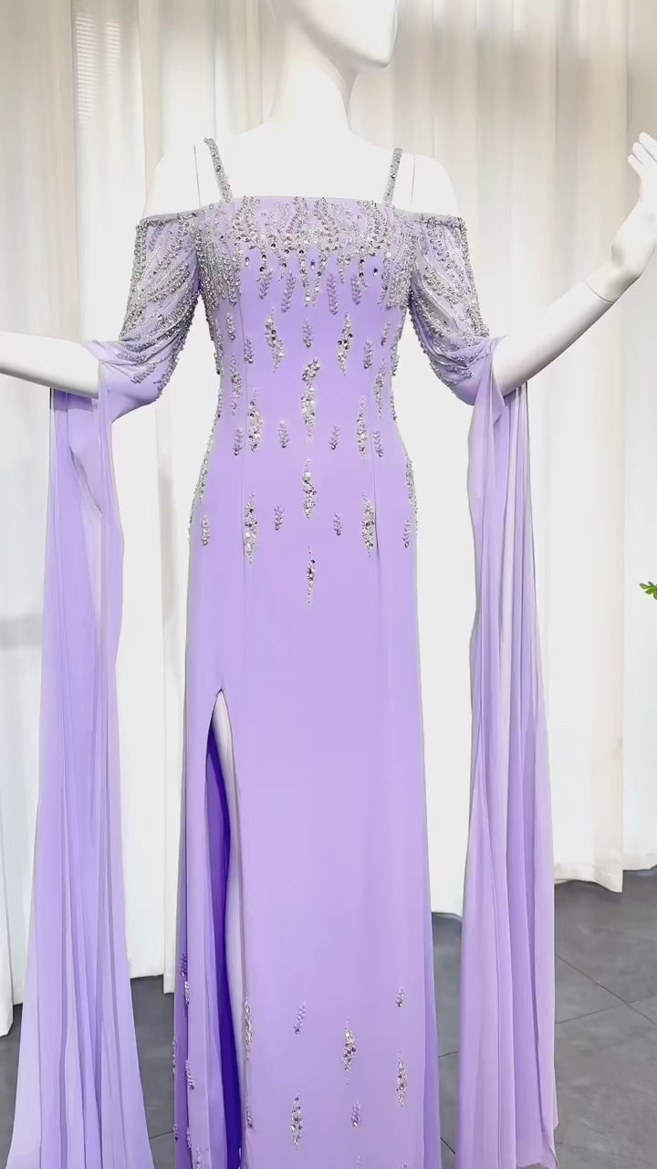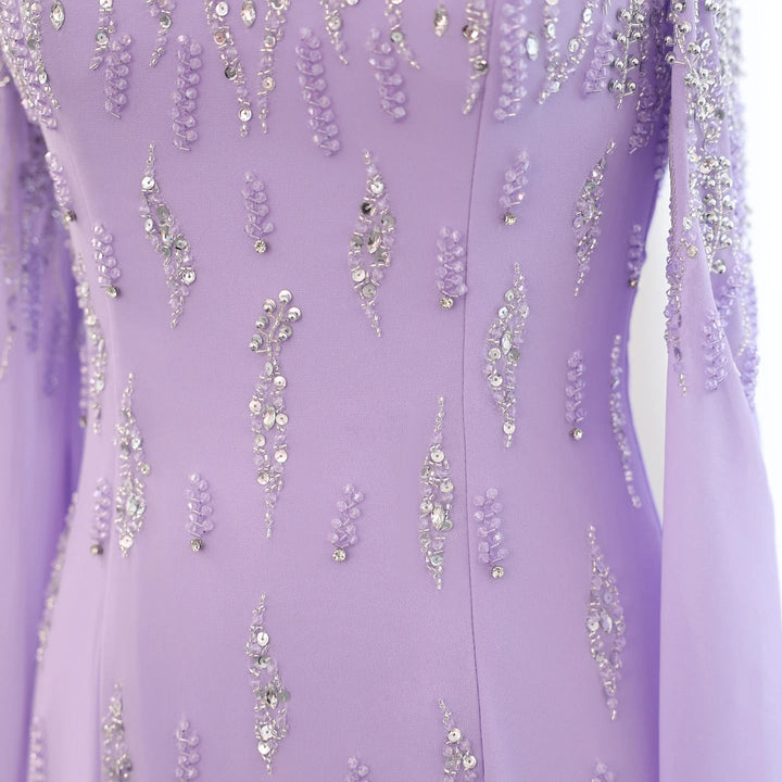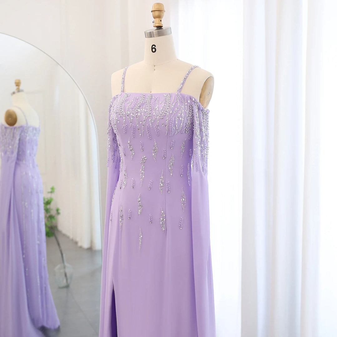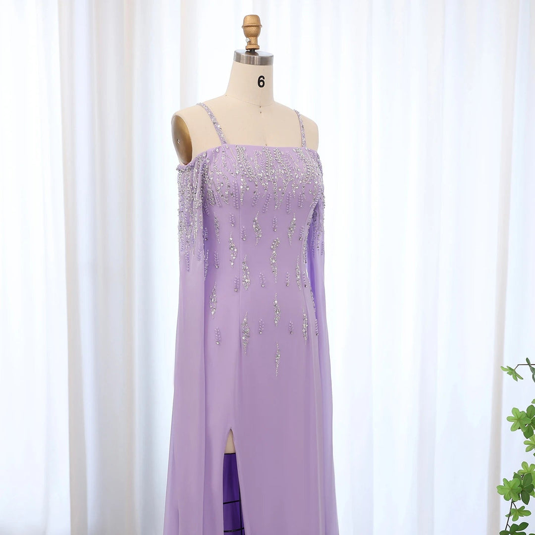 This Dreamy Vow Arabic Lilac Mermaid Evening Dress with Cape Sleeves SS448 is a luxury formal gown perfect for weddings and special occasions. The intricate beading and delicate lace details add a touch of elegance, while the mermaid silhouette and cape sleeves flatter the figure. Make a statement in this stunning dress.