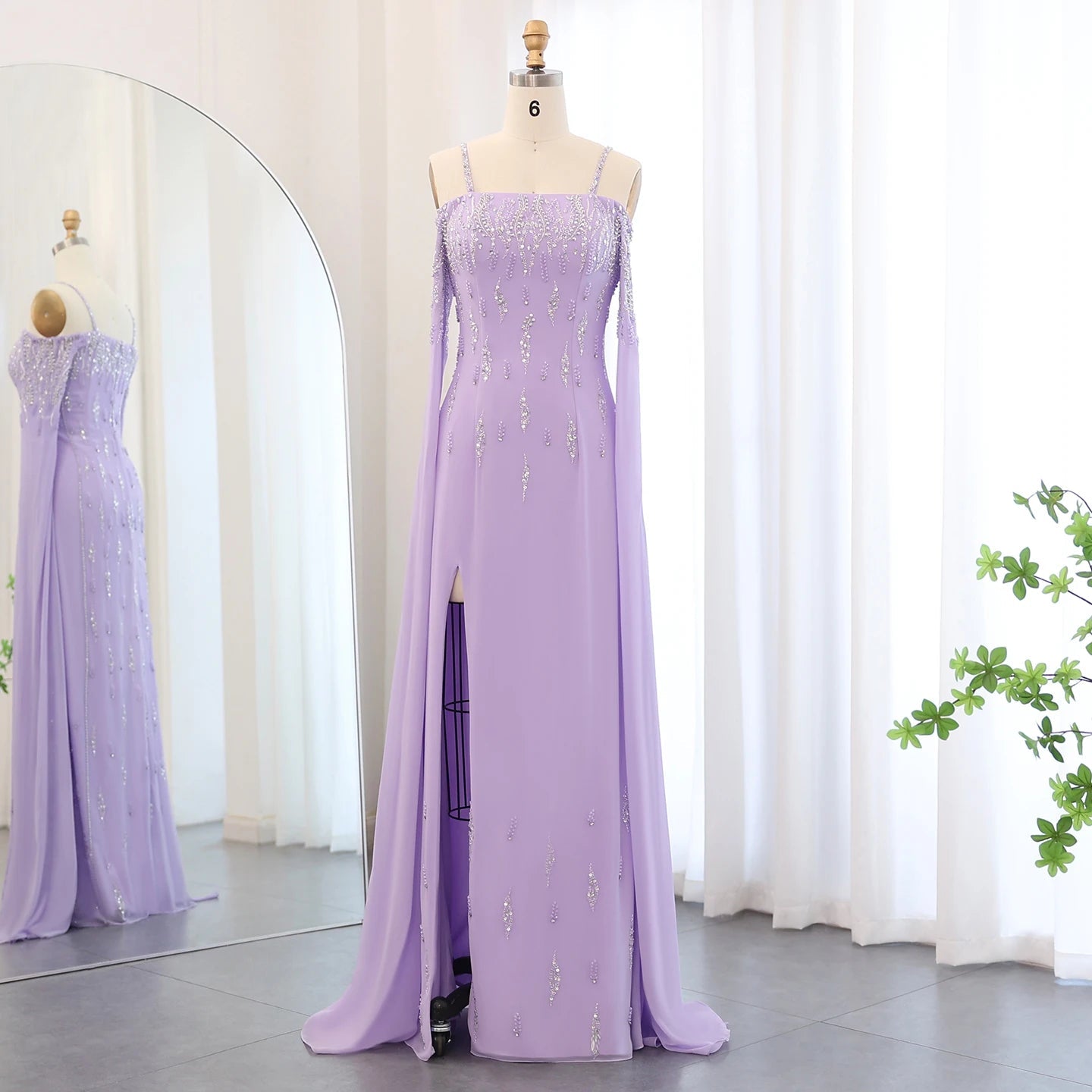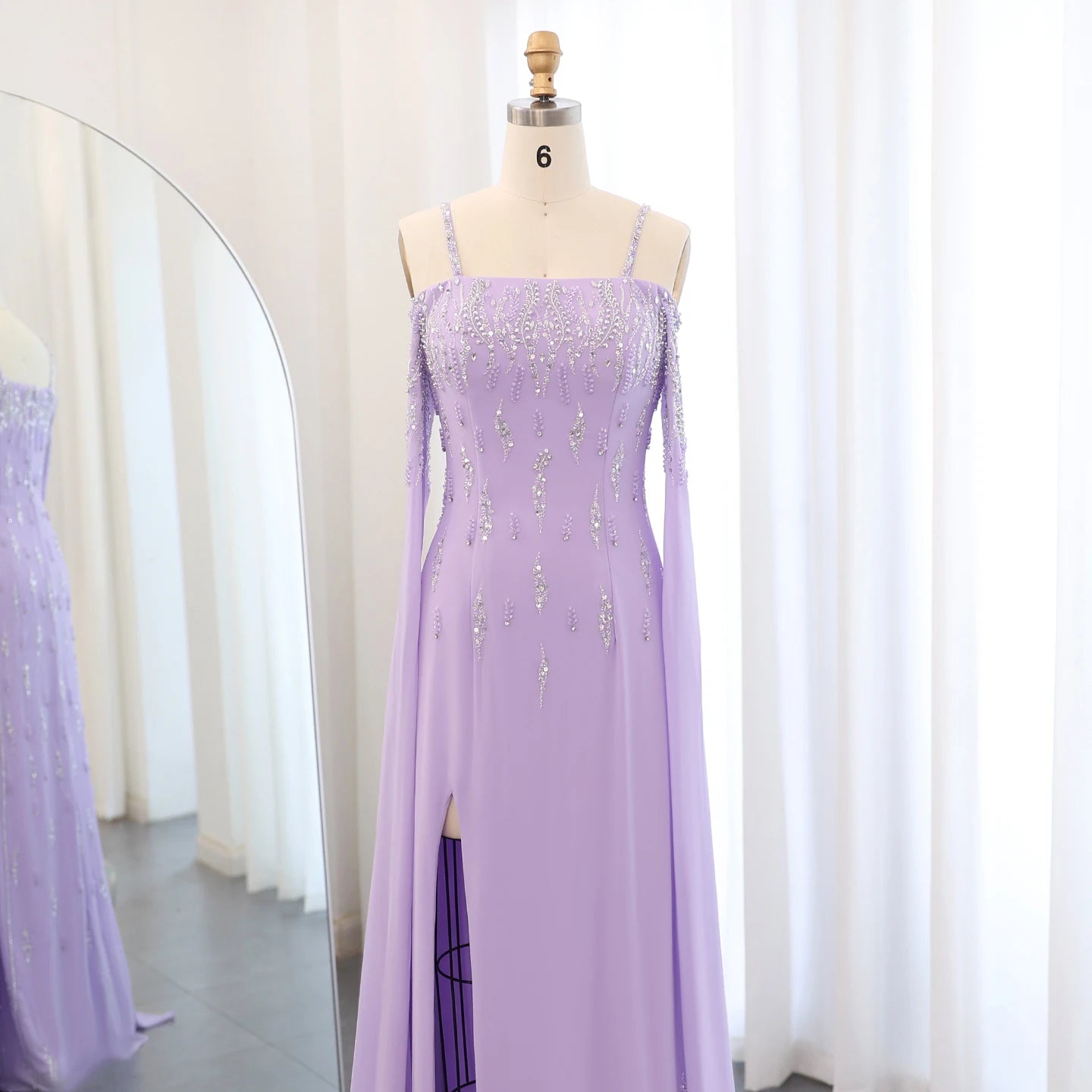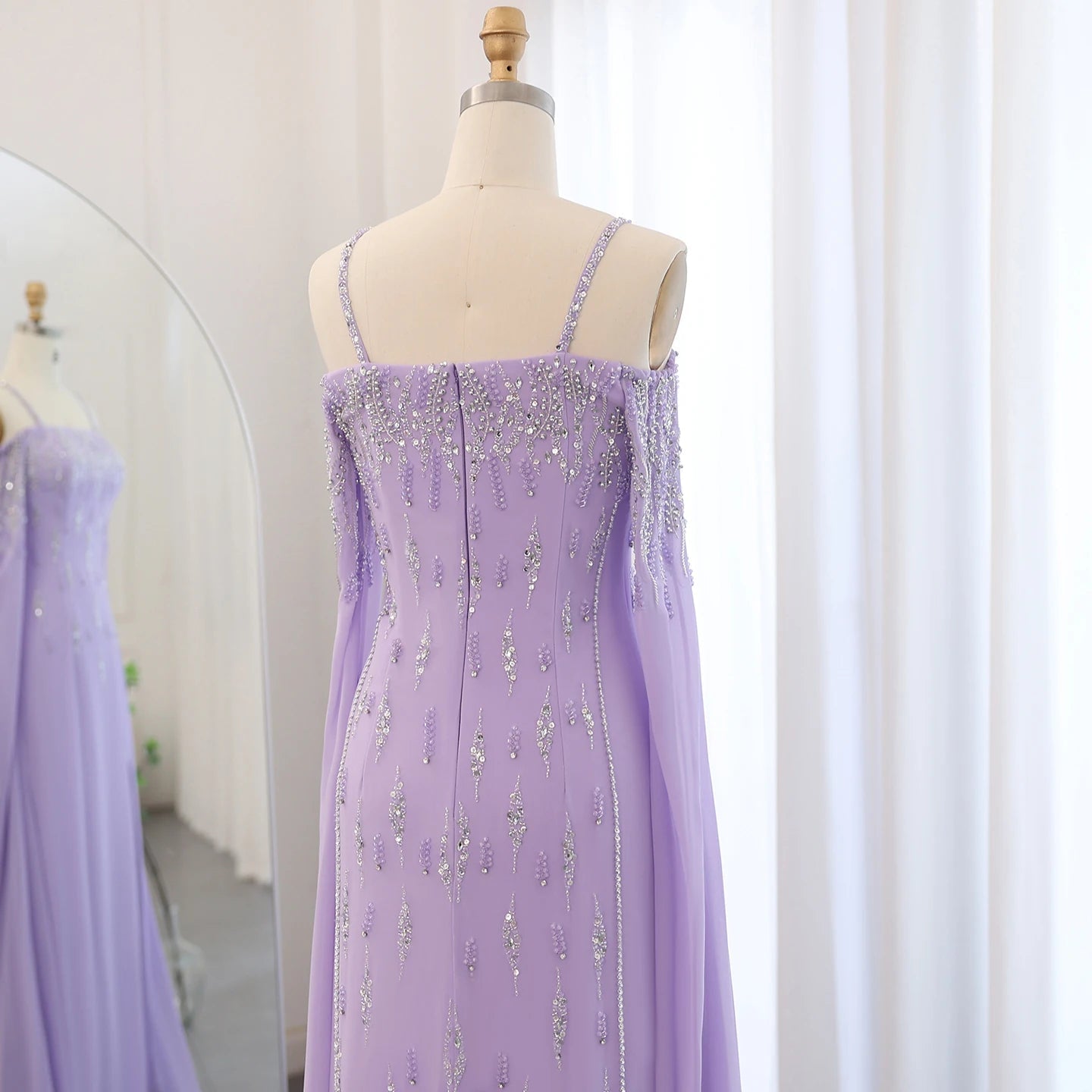This Dreamy Vow Arabic Lilac Mermaid Evening Dress with Cape Sleeves SS448 is a luxury formal gown perfect for weddings and special occasions. The intricate beading and delicate lace details add a touch of elegance, while the mermaid silhouette and cape sleeves flatter the figure. Make a statement in this stunning dress.