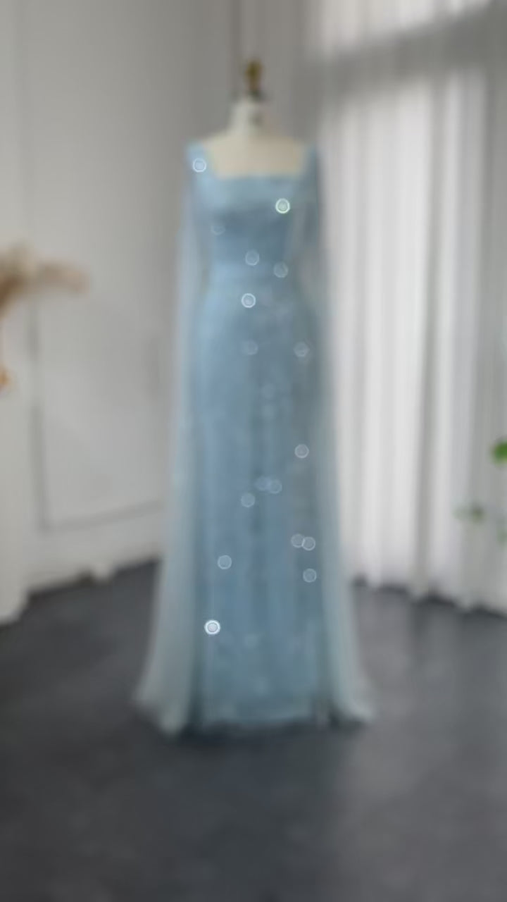 Luxury Beaded Blue Mermaid Evening Dress with Cape Sleeves SS690