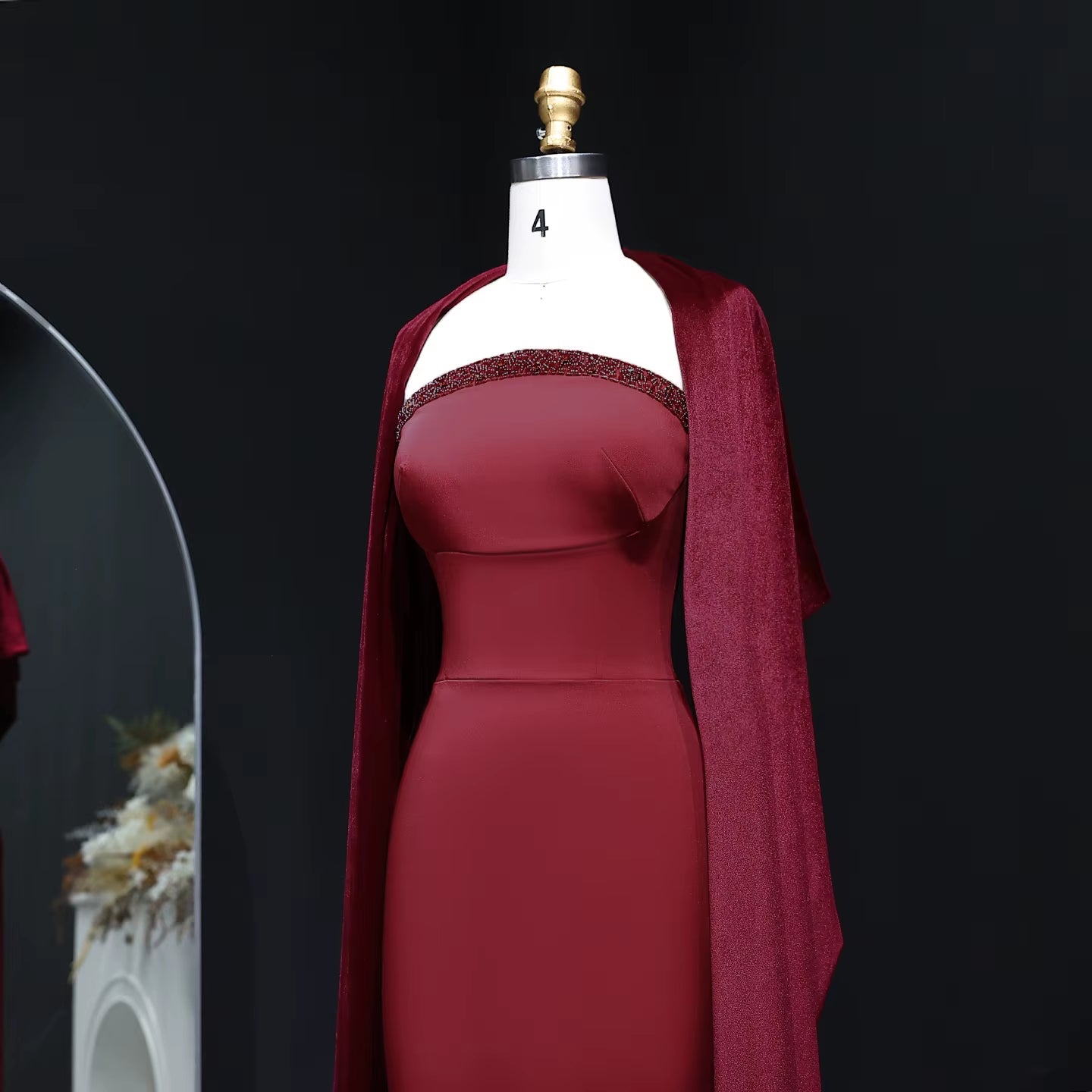Elegant Wine Red Strapless Evening Dress with Cape SF005