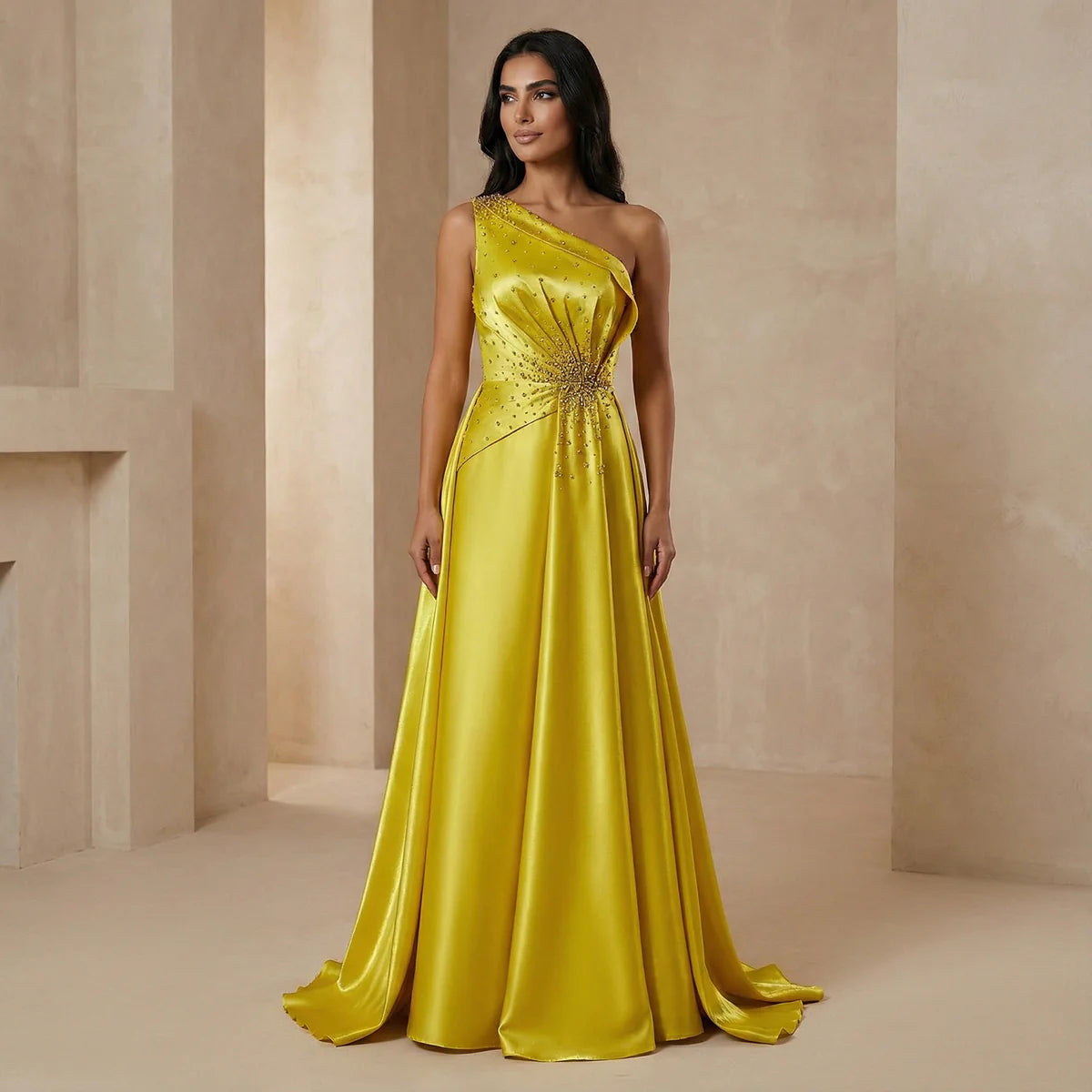 Vibrant Yellow Satin Sequin Evening Dress with Overskirt XD049