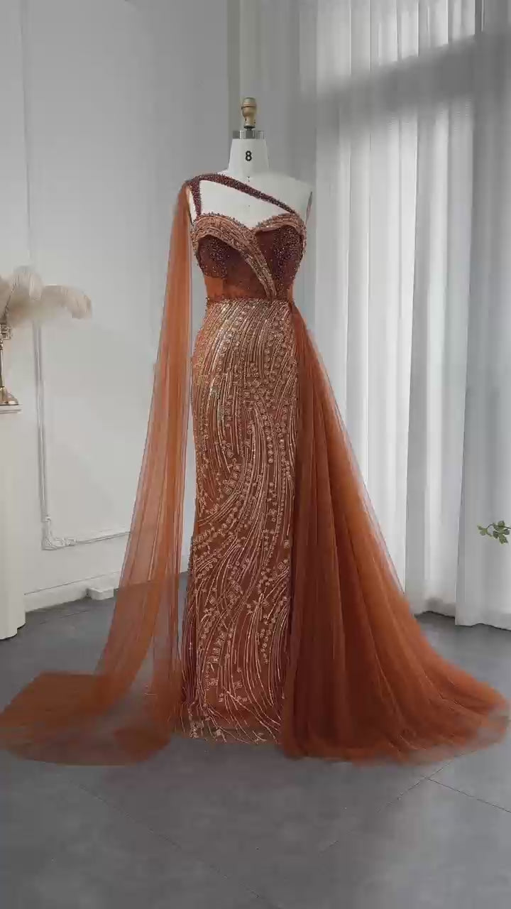 Dieses elegante Abendkleid von Dreamy Vow hat ein stilvolles One-Shoulder-Design, eine schmeichelnde Meerjungfrauen-Silhouette und einen atemberaubenden Cape-Überrock. Dieses Kleid ist perfekt für Hochzeiten, Abschlussbälle oder andere formelle Anlässe und lässt Sie sich wie eine echte Prinzessin fühlen. Fallen Sie auf und setzen Sie ein Statement mit diesem auffälligen burgunderfarbenen Kleid.