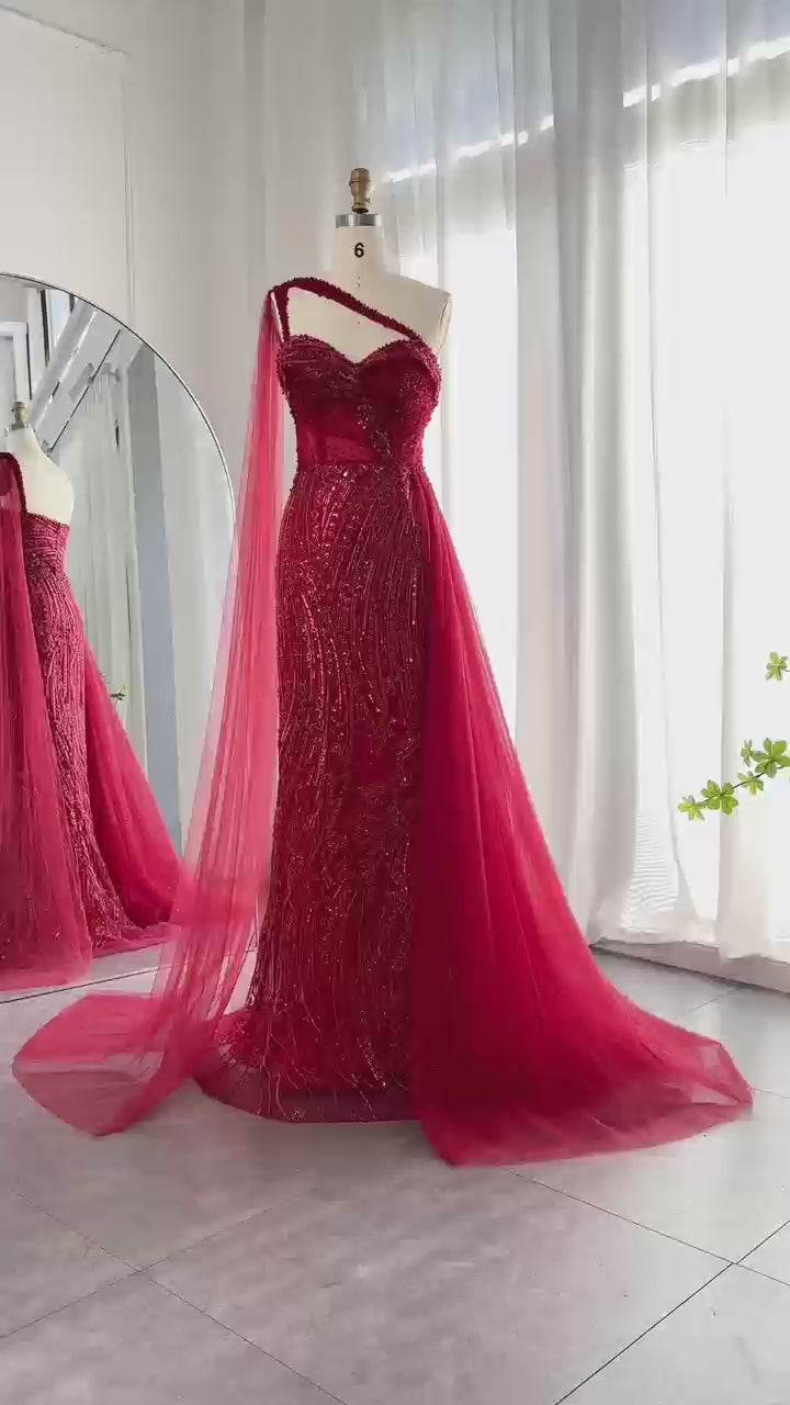 Burgundy One Shoulder Mermaid Evening Dresses with Cape SS129