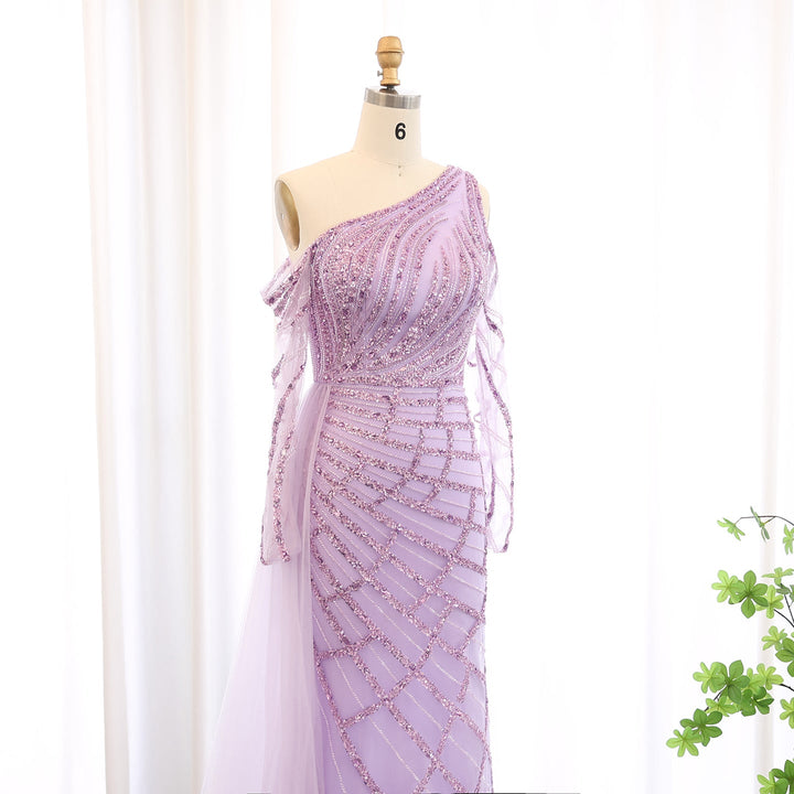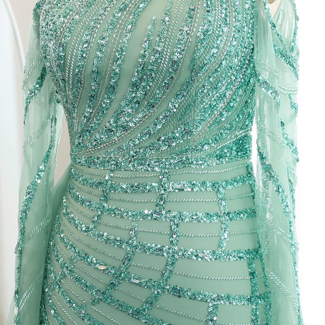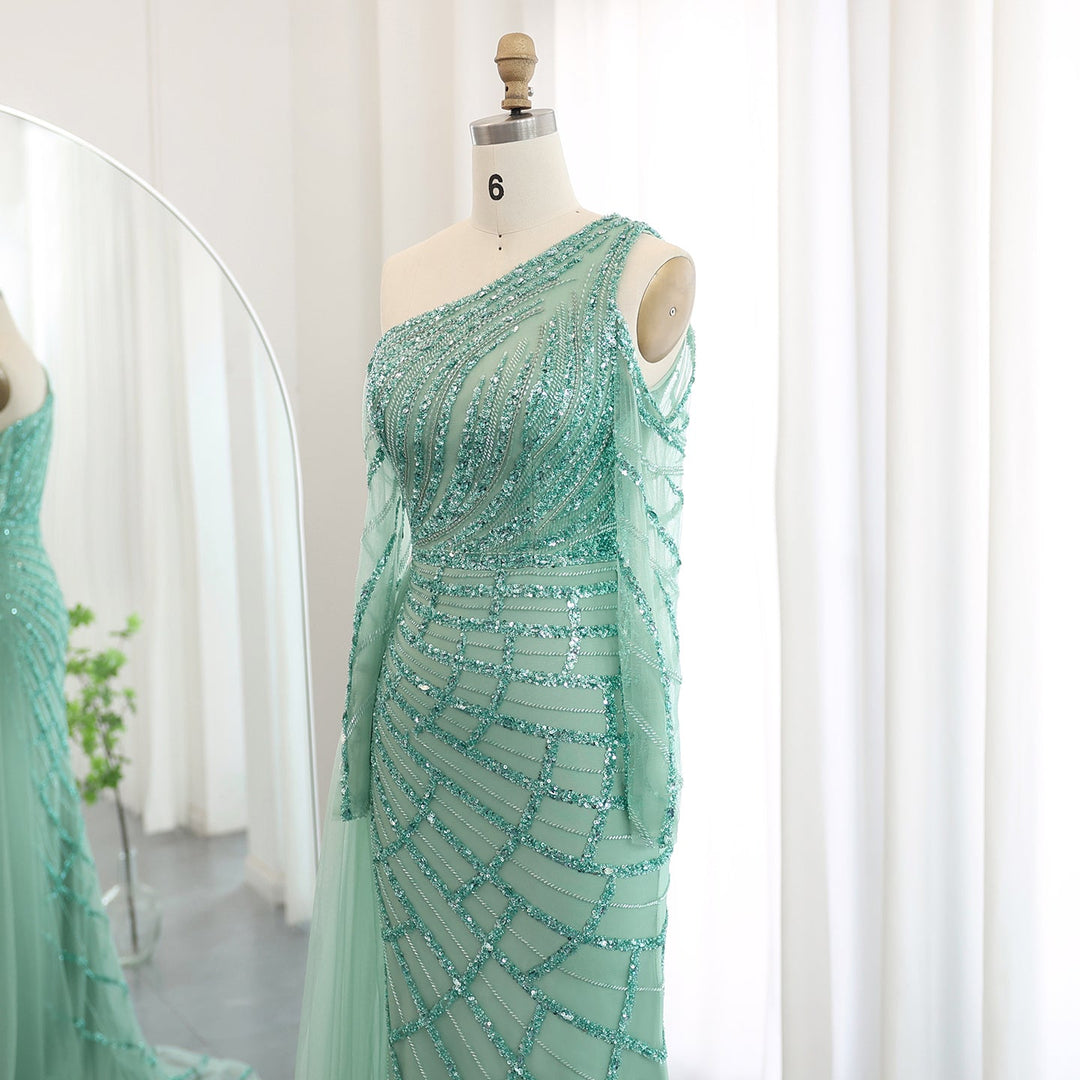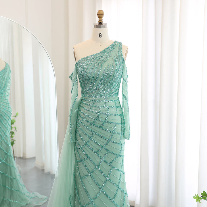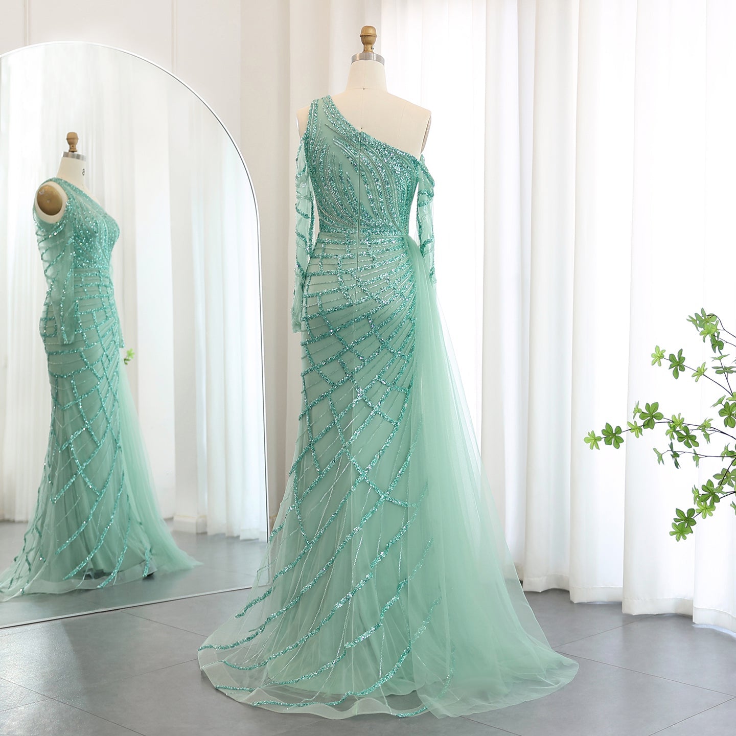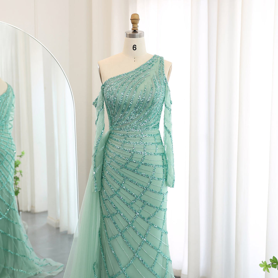 Dreamy Vow Smaragdgrünes Abendkleid mit einer Schulter und Meerjungfrau-Muster und langen Ärmeln im Überrock, Luxus-Hochzeits-Partykleider aus Dubai SS413