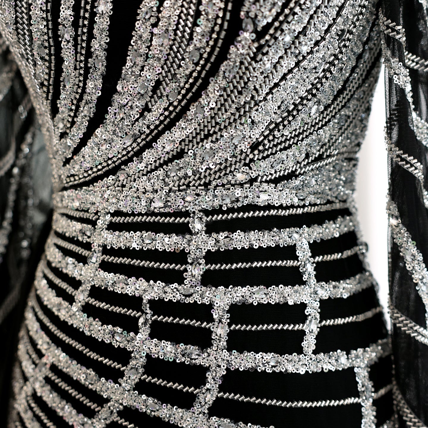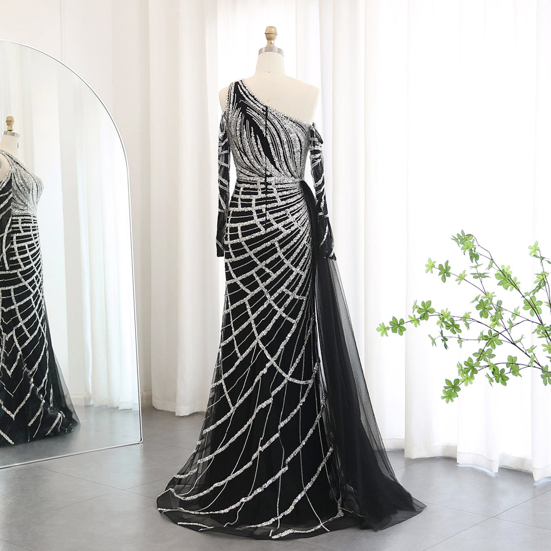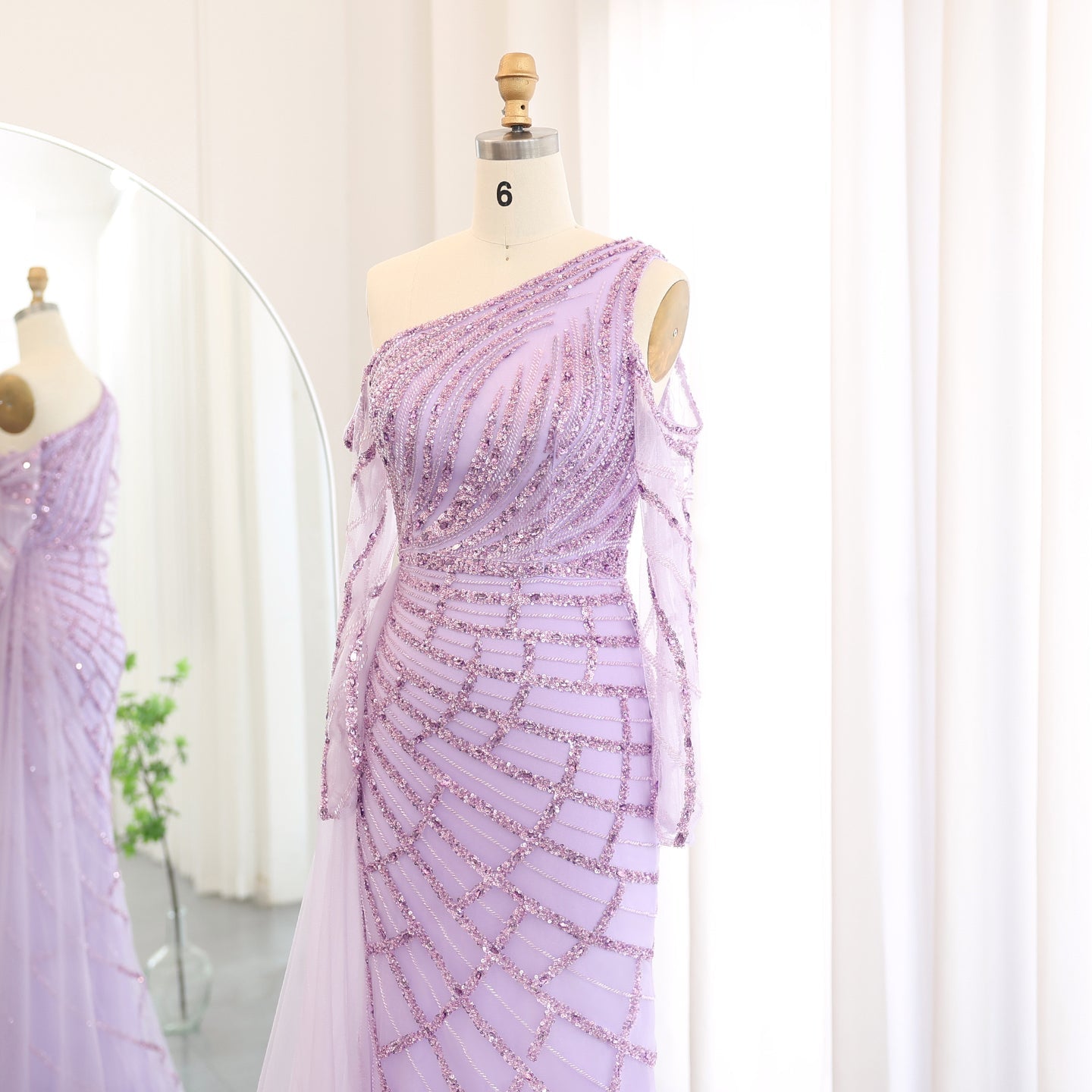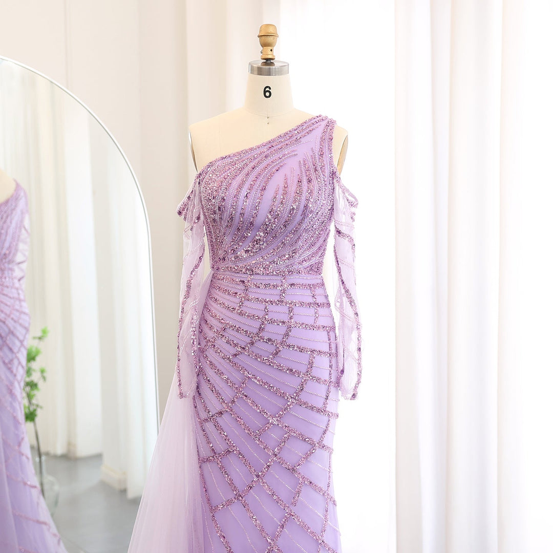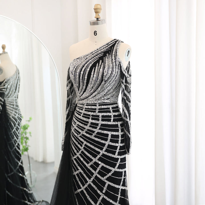 Dreamy Vow Smaragdgrünes Abendkleid mit einer Schulter und Meerjungfrau-Muster und langen Ärmeln im Überrock, Luxus-Hochzeits-Partykleider aus Dubai SS413