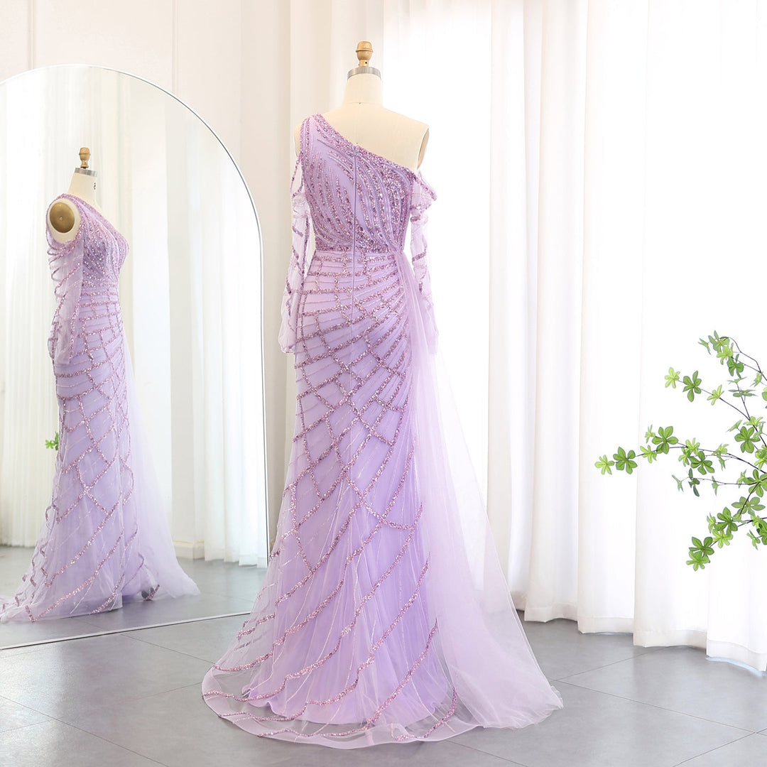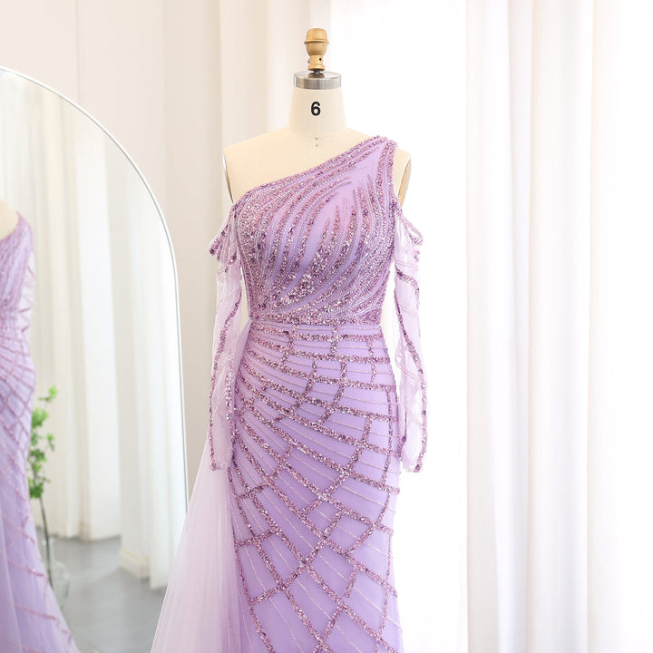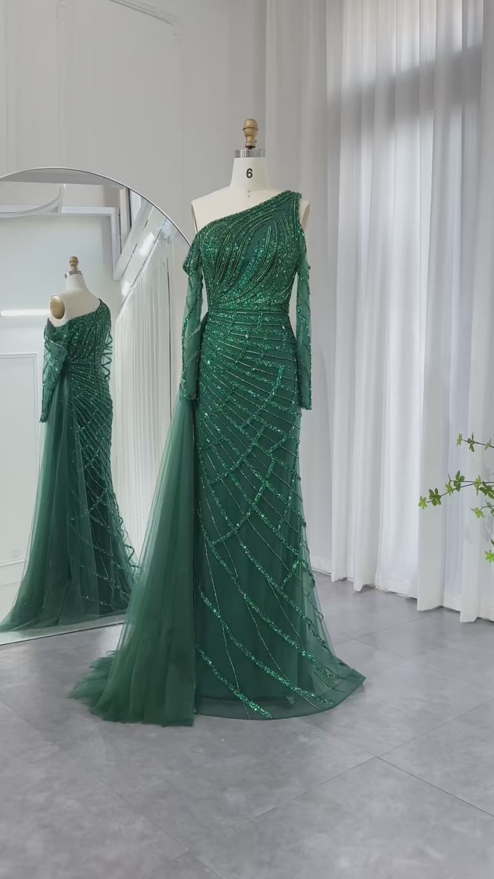 Gönnen Sie sich Luxus und Eleganz mit dem smaragdgrünen One-Shoulder-Meerjungfrauen-Abendkleid von Dreamy Vow. Das One-Shoulder-Design und die Meerjungfrauen-Silhouette sorgen für einen schmeichelhaften und eleganten Look, während der zusätzliche Überrock und die langen Ärmel diesem Kleid einen Hauch von Glamour verleihen. Dieses Kleid ist perfekt für eine Hochzeitsfeier in Dubai oder jede formelle Veranstaltung und wird Ihnen das Gefühl geben, königlich zu sein.