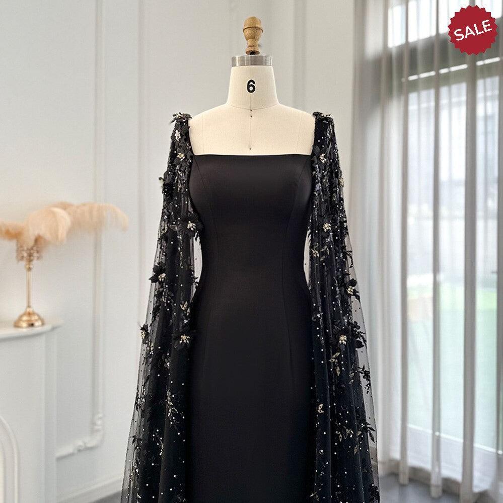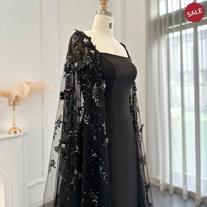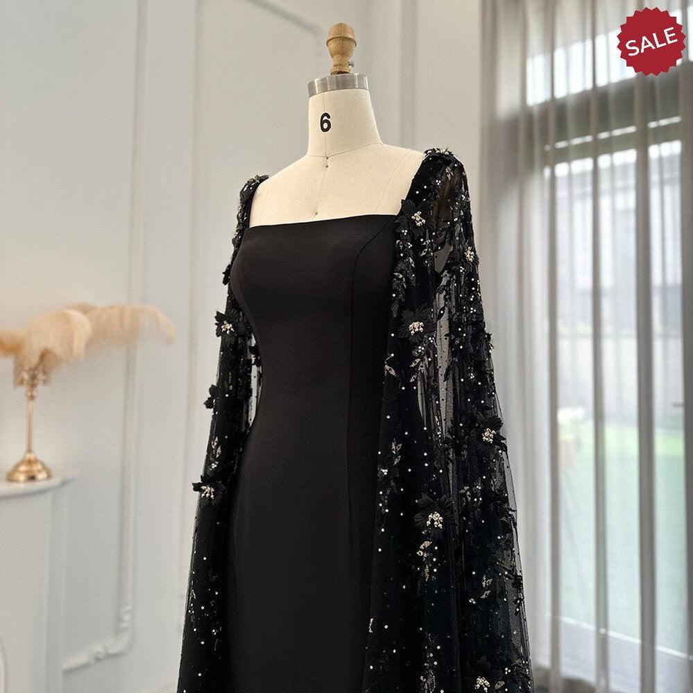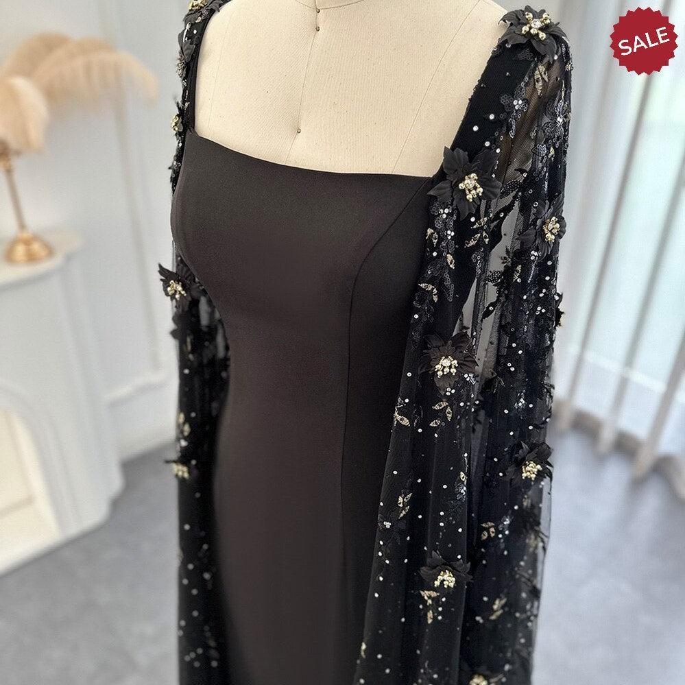 Dreamy Vow Luxus 3D Blumen Schwarz Satin Arabisch Abendkleid mit Cape Elegante Meerjungfrau Lange Frauen Formale Party Kleider SS479